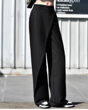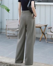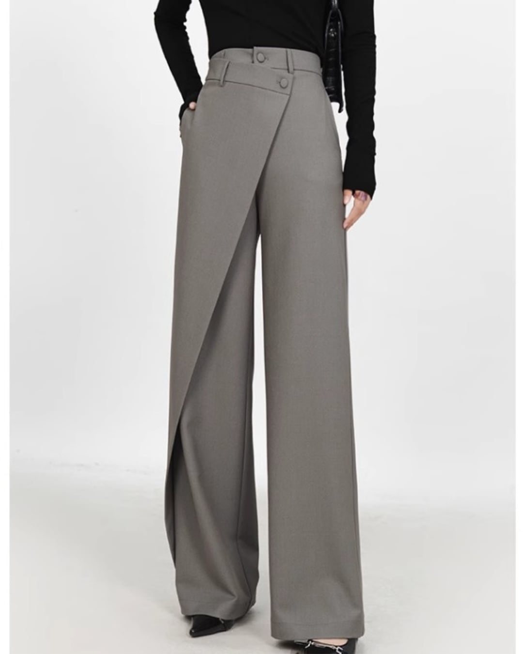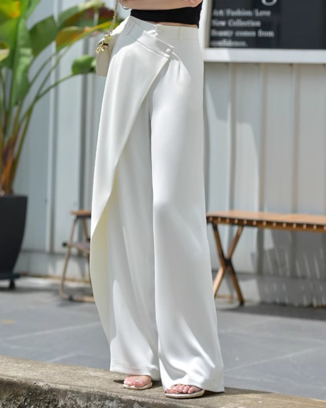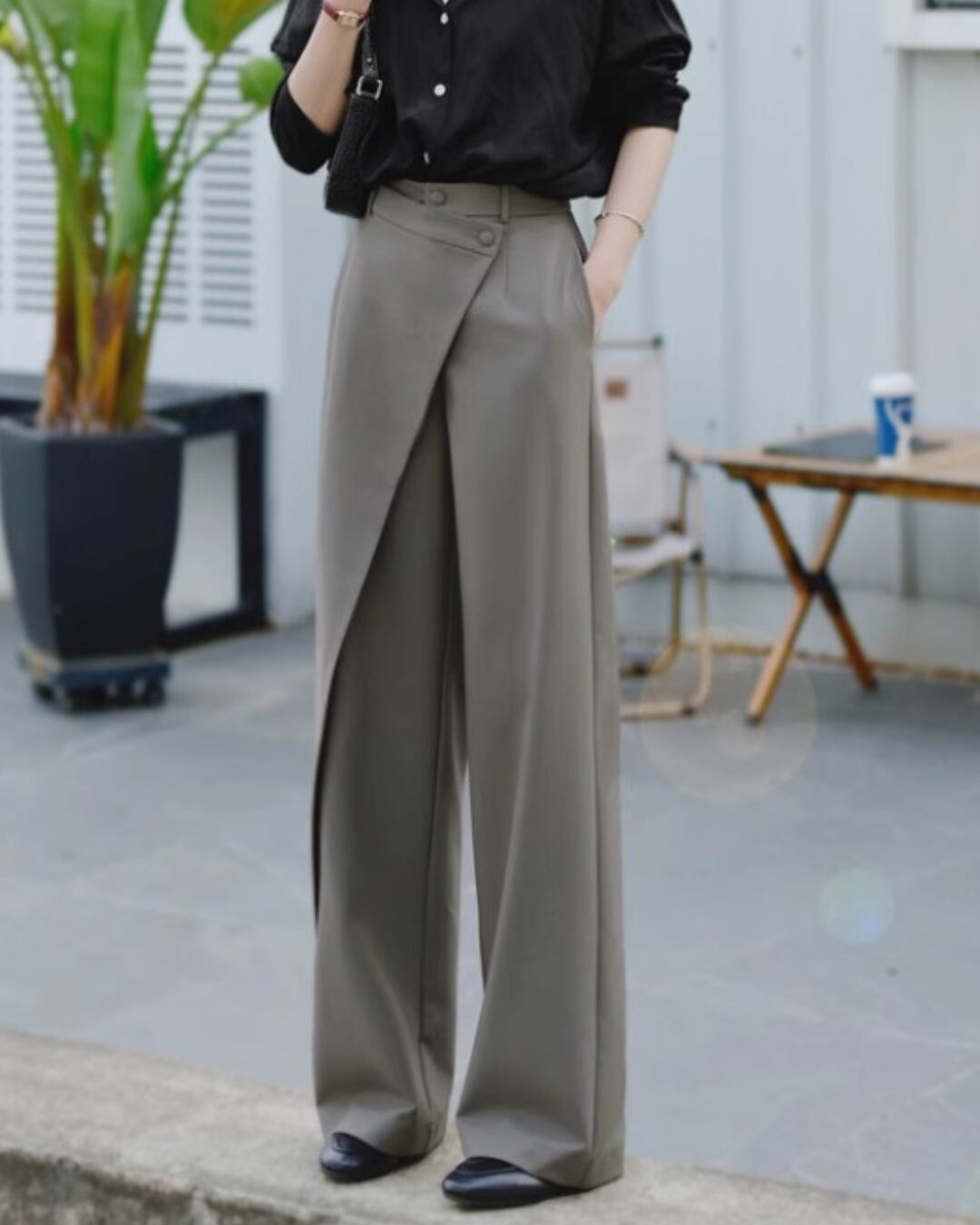 ラップデザインが洗練された印象を与えるワイドパンツ。