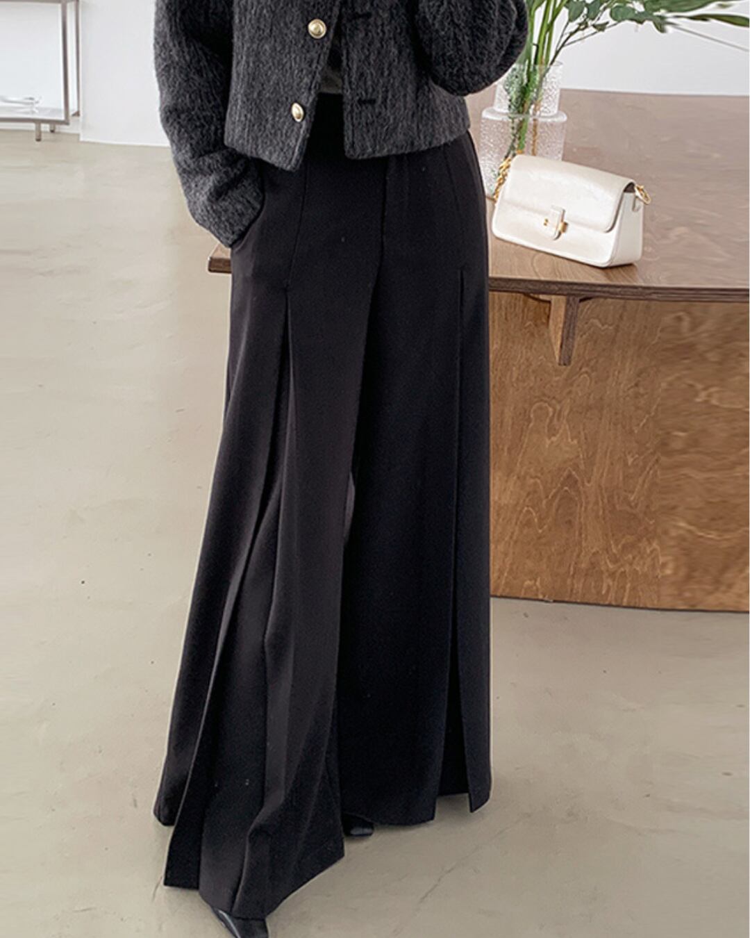 ハイウエストデザインでスタイルアップを叶え、オフィスからカジュアルシーンまで幅広く活躍します。