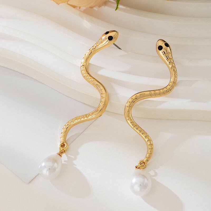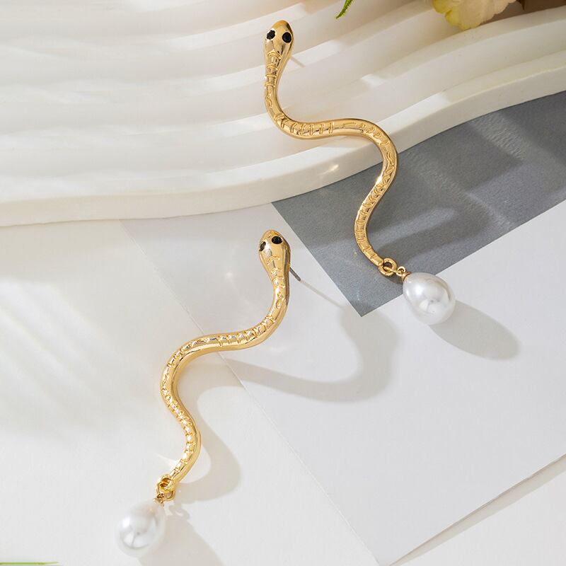 蛇の曲線美とパールが揺れる、洗練されたデザインは、シンプルなスタイルのアクセントに最適です。