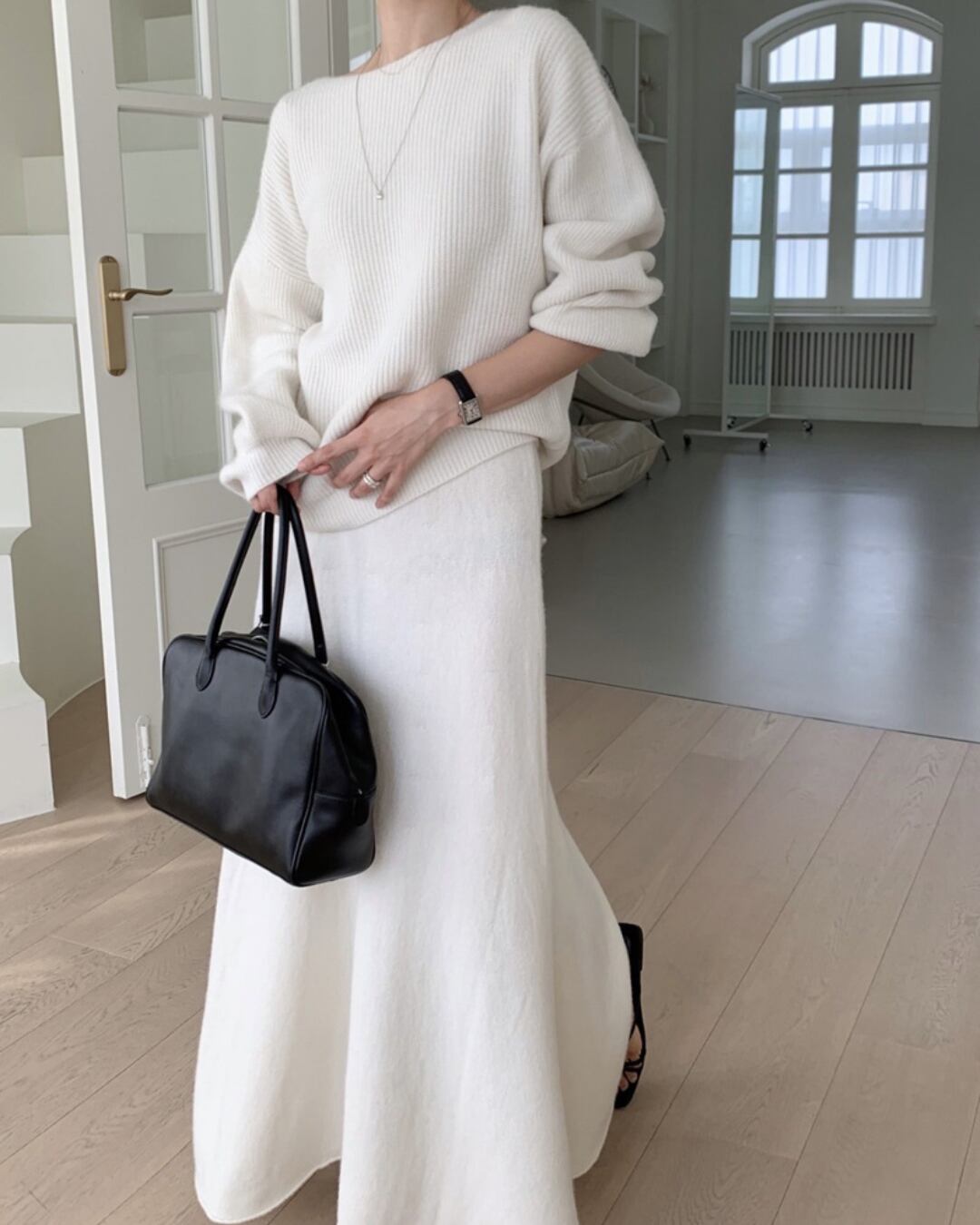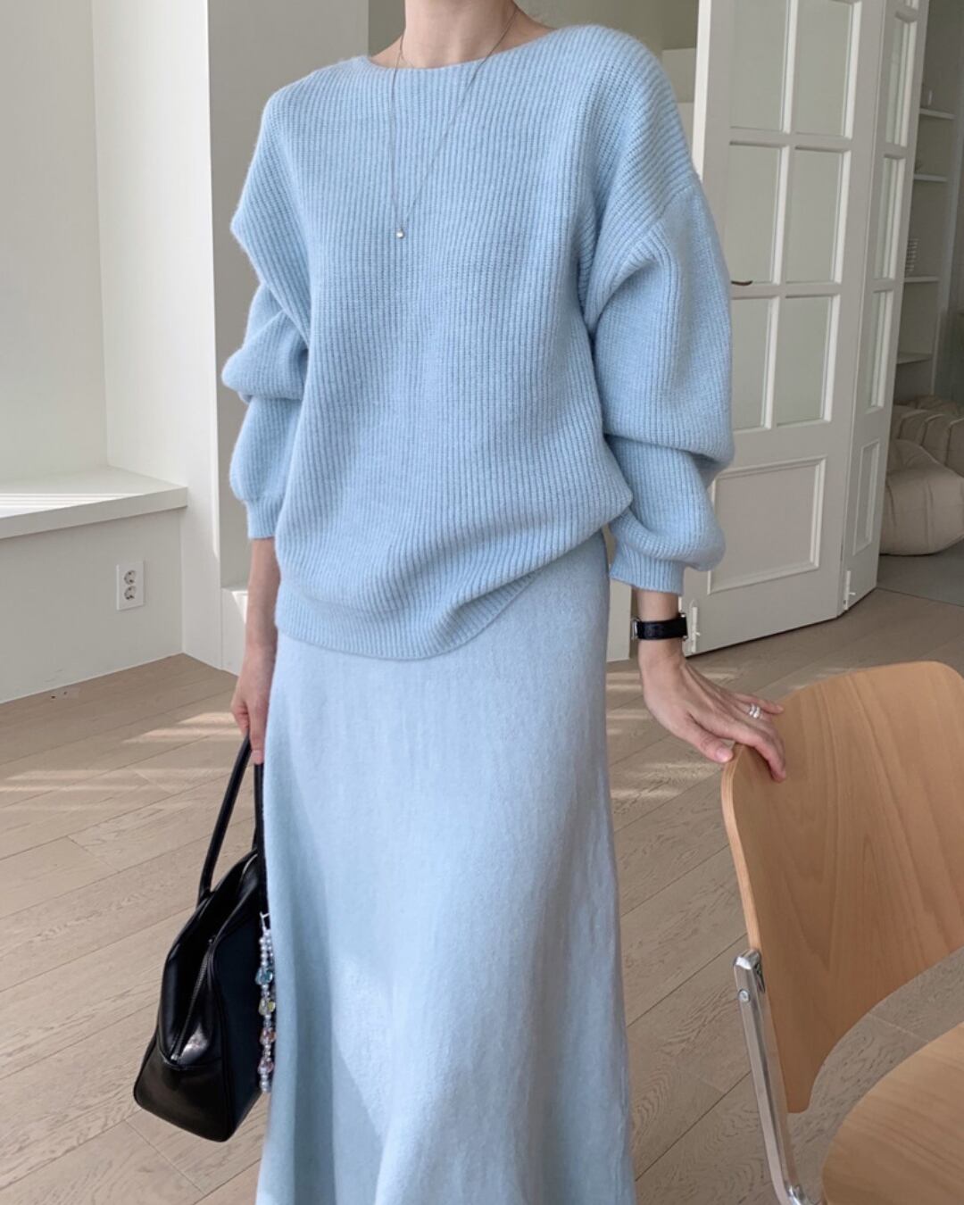 シンプルなデザインで着回し力抜群のニットセットアップ。