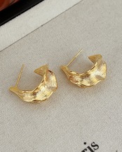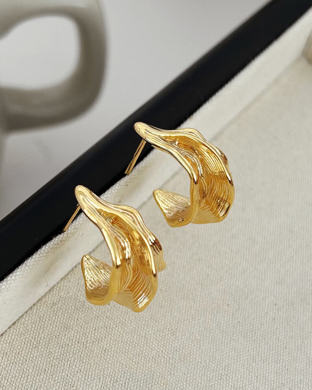 ウェーブデザインが目を惹く、ゴールドカラーのフープピアス。
