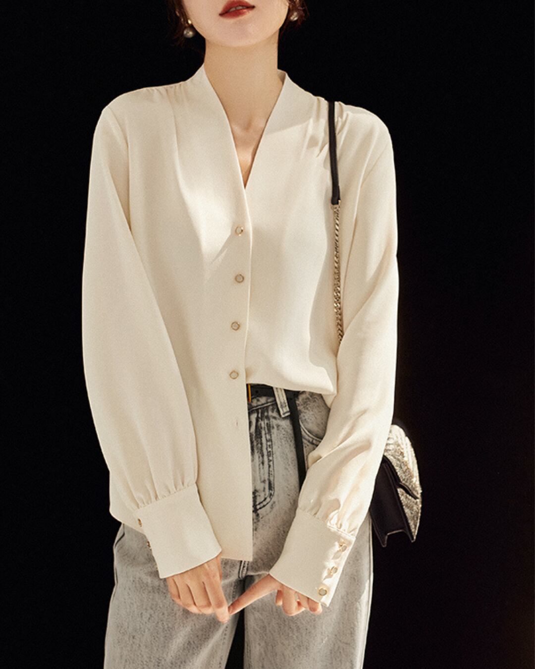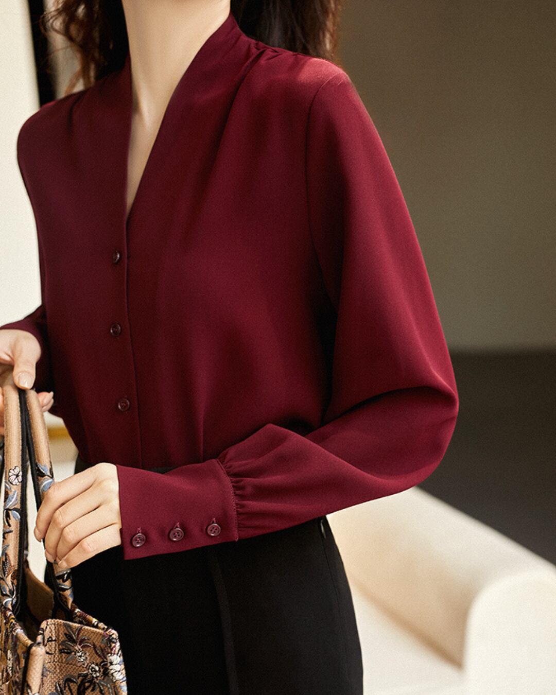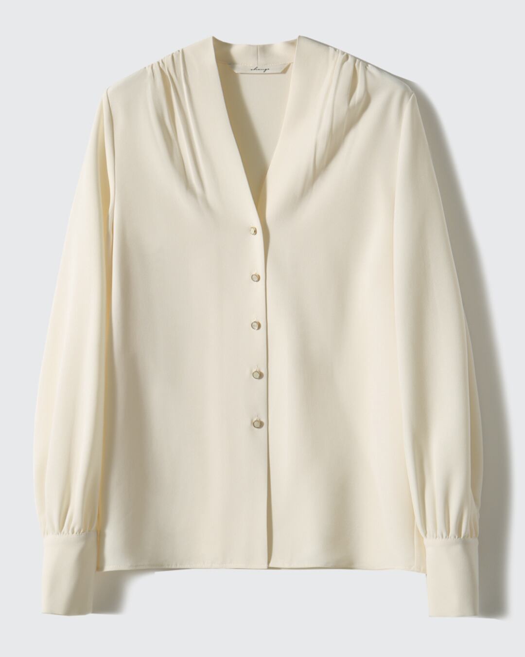 Vネックとボタンフロントが特徴の長袖ブラウスは、オフィスからカジュアルなシーンまで活躍する一枚。