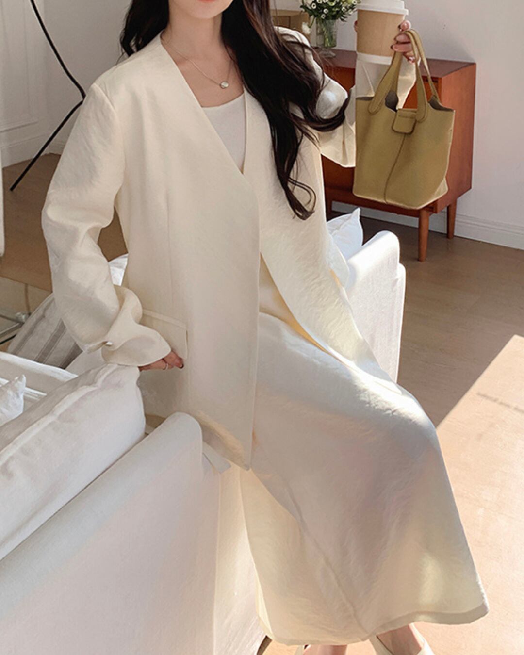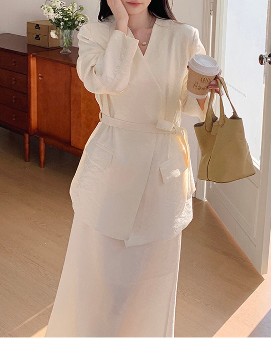 V-neck Tailored Jacket with Belt and Linen-like Maxi Skirt Set S00068