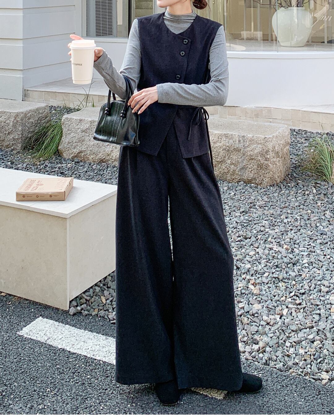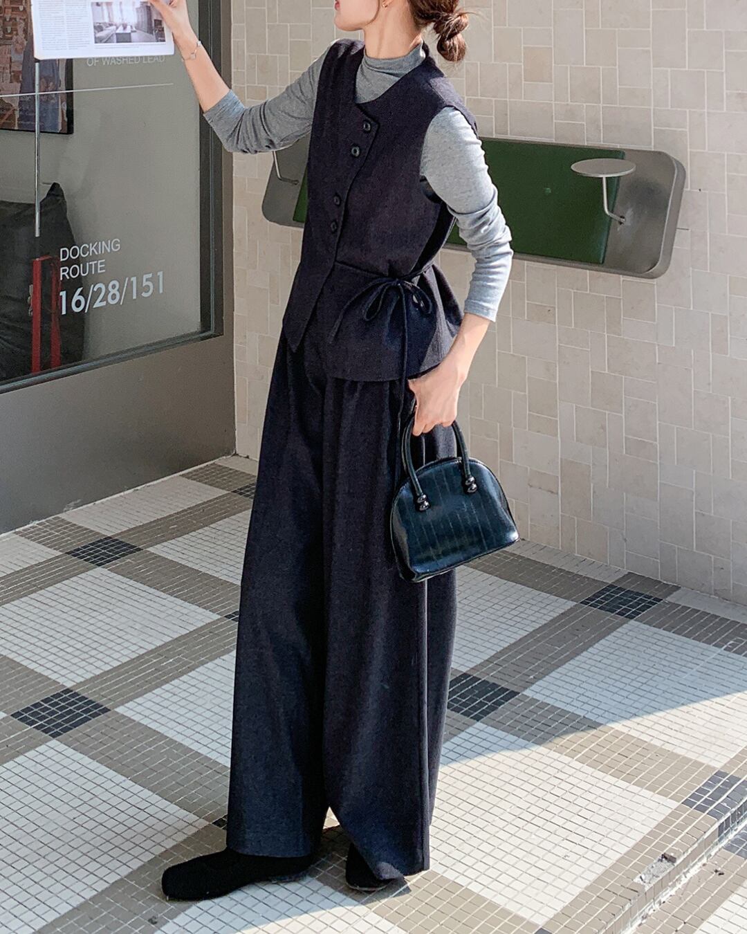 無地インナーとスタイリッシュなノースリーブベストとストレートパンツの3ピースセット。