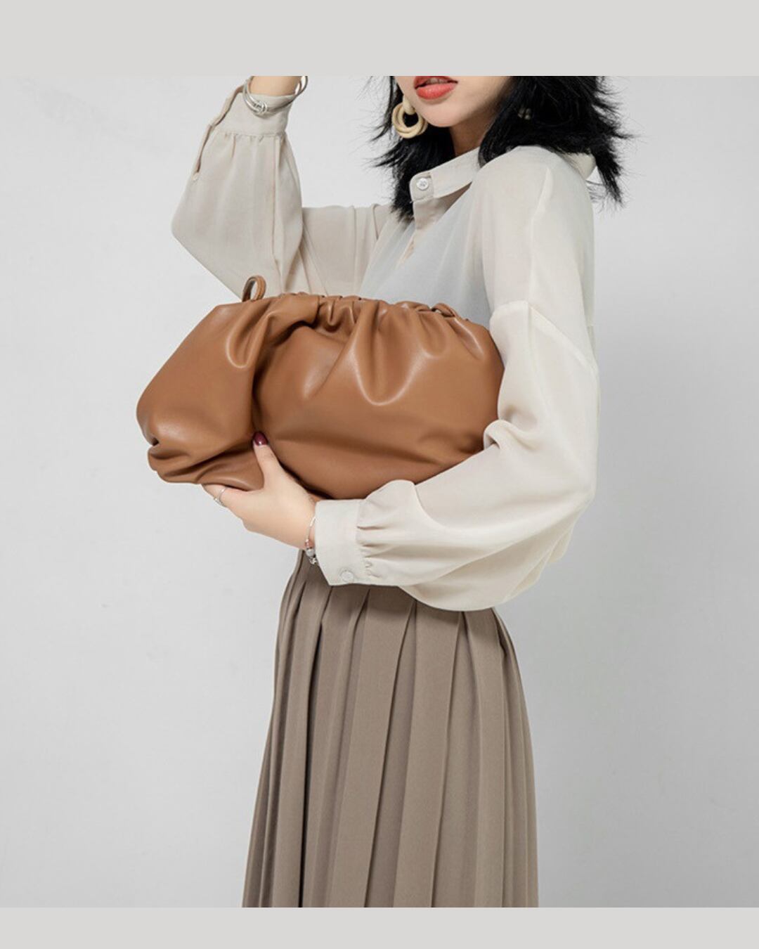 洗練されたデザインが魅力のクラッチバッグ。ドローストリングで開閉するユニークなデザインは、使いやすさと個性を両立。