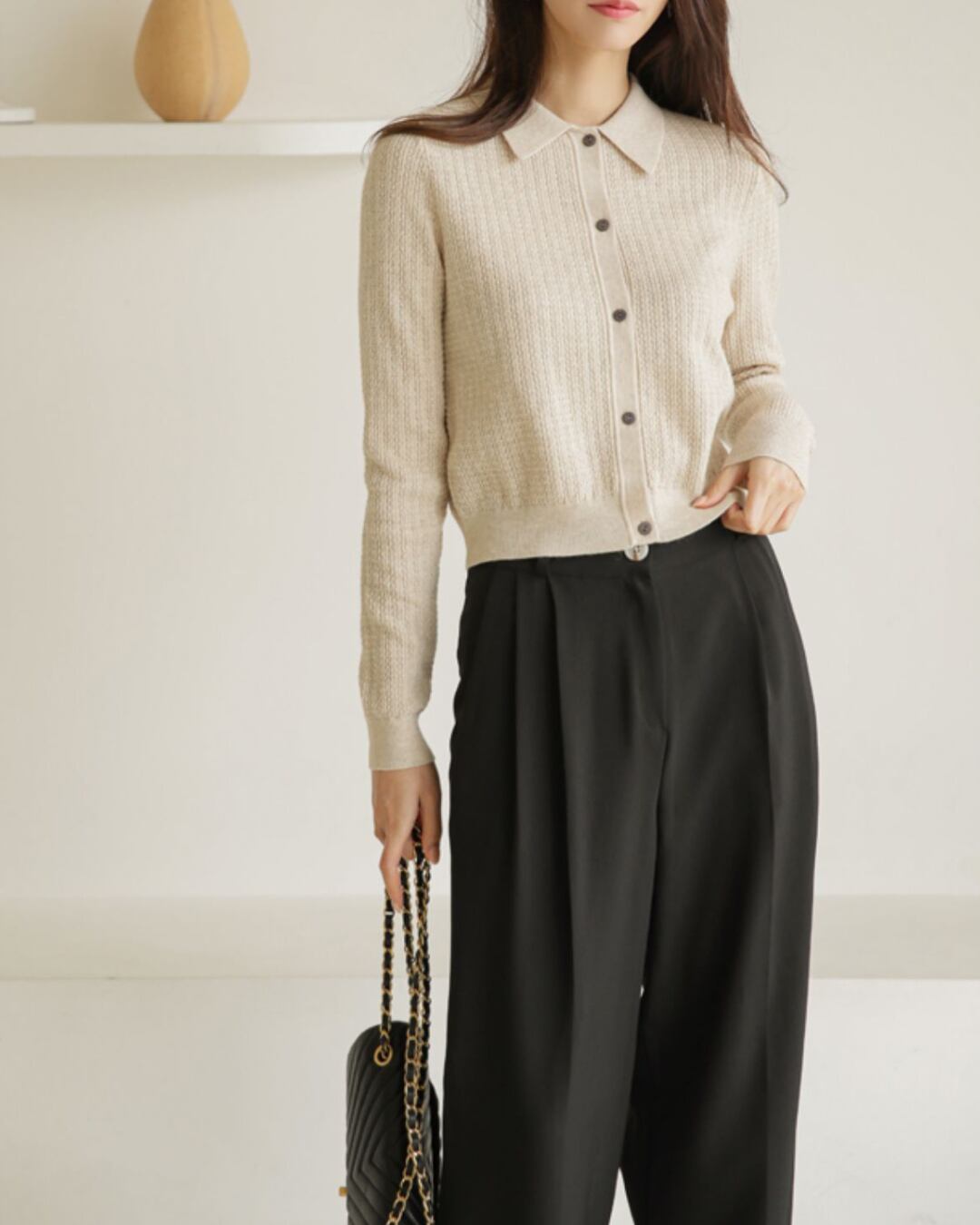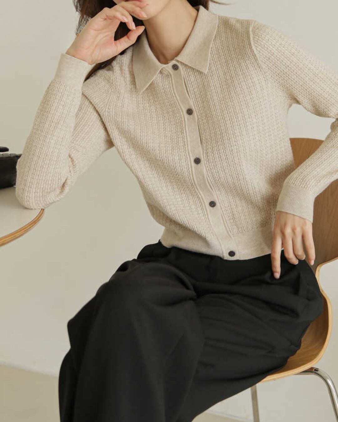 襟付きのデザインが上品な印象を与える長袖ニットポロシャツ。