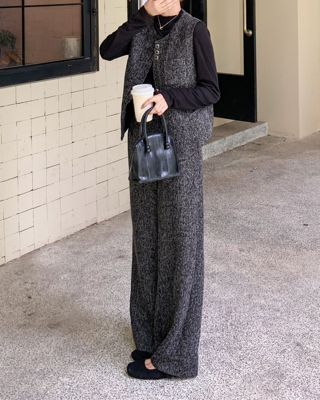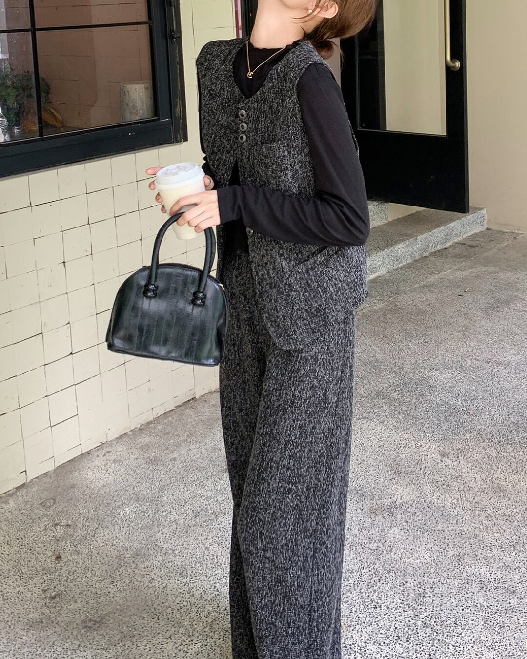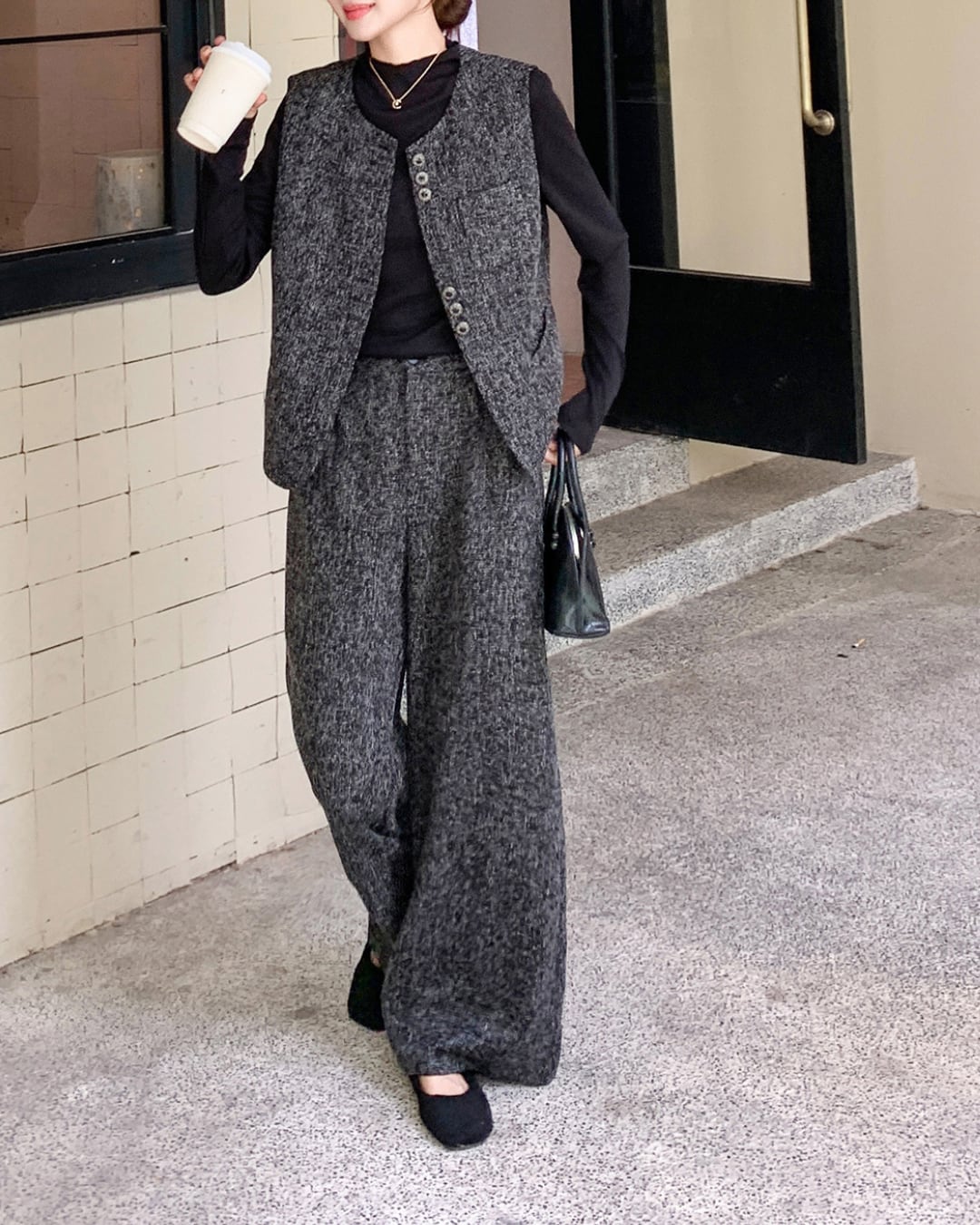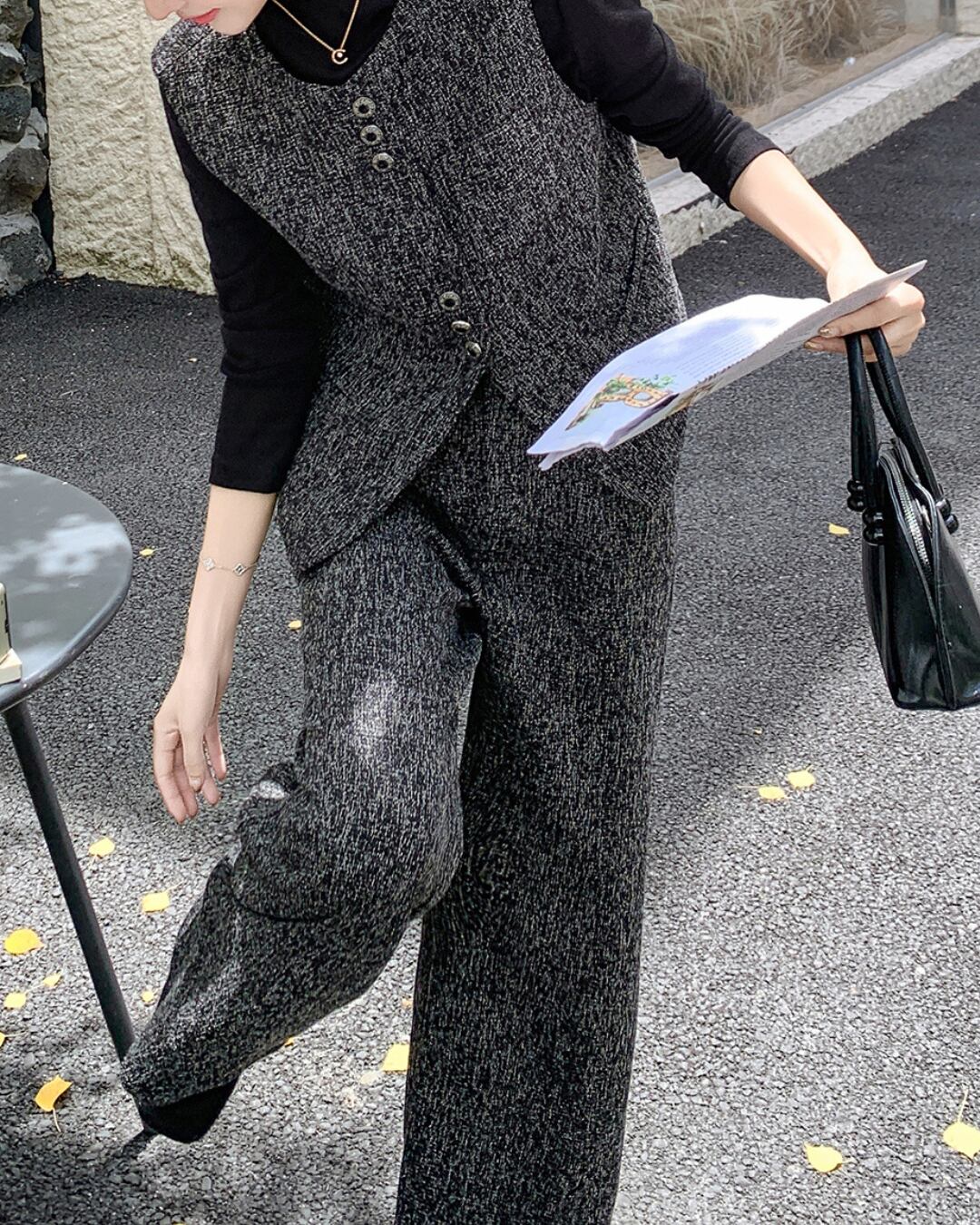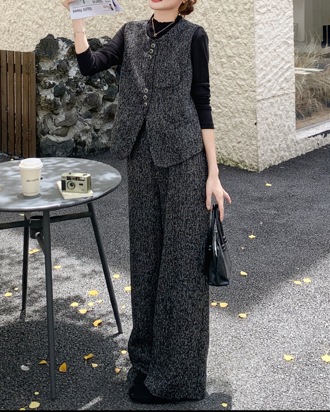 洗練されたツイード素材のベストとワイドパンツのセットアップ。