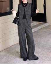 Tweed Material High Neck Inner & Sleeveless Vest Wide Pants Setup S00072