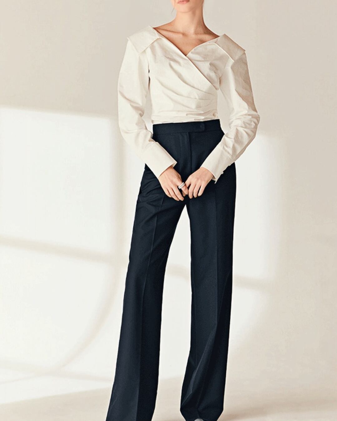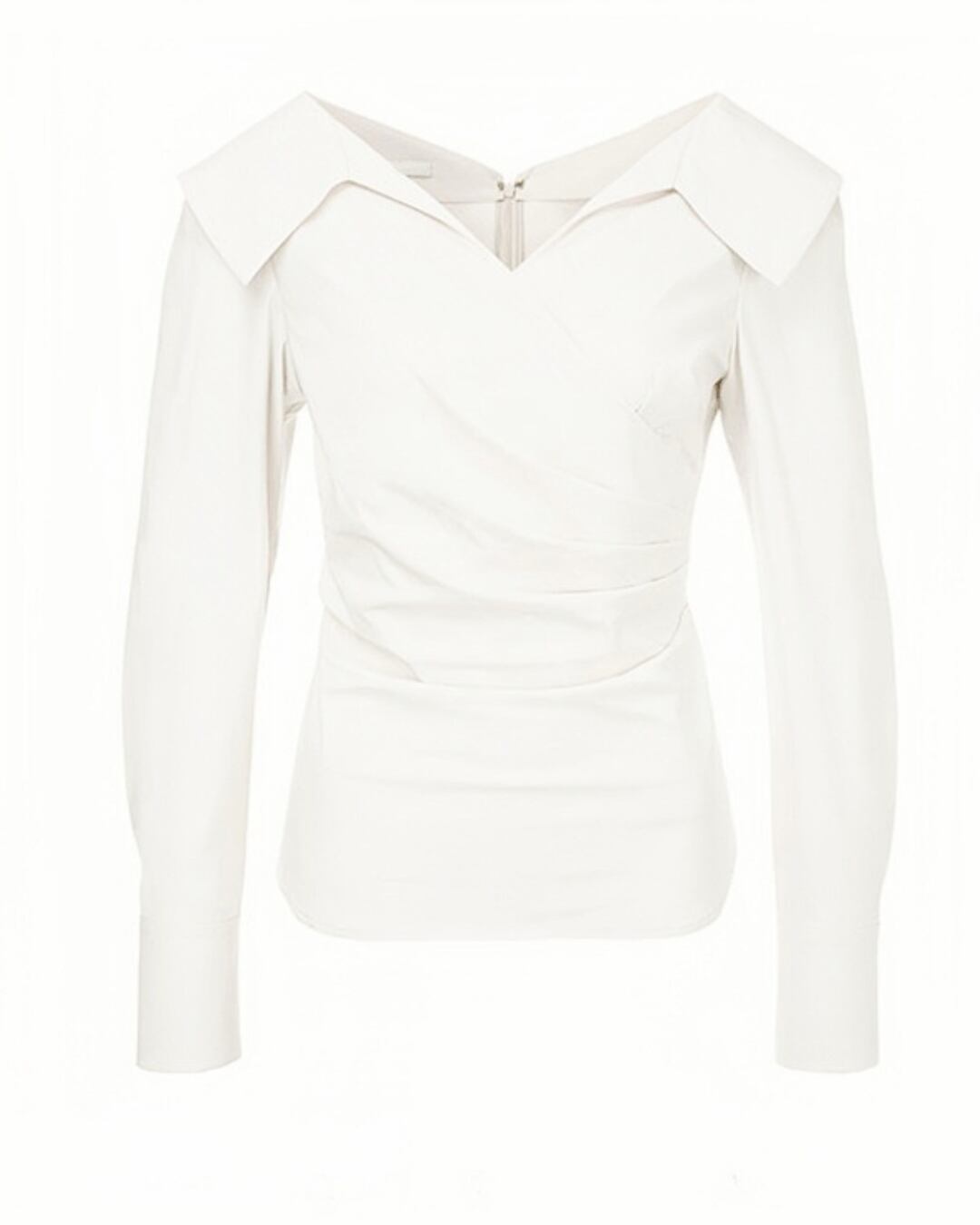 上品なVネックとボリュームのあるパフスリーブが特徴的なブラウス。