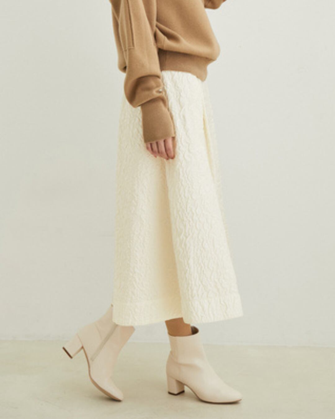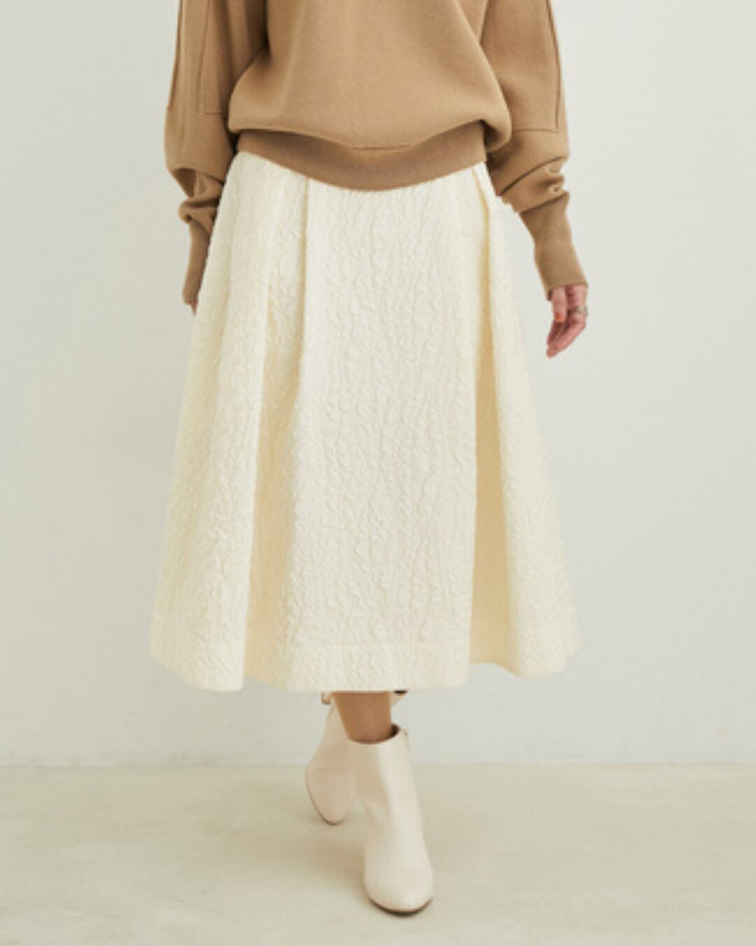 ミディ丈なので様々なトップスとバランス良くコーディネートでき、着回し力も抜群です。