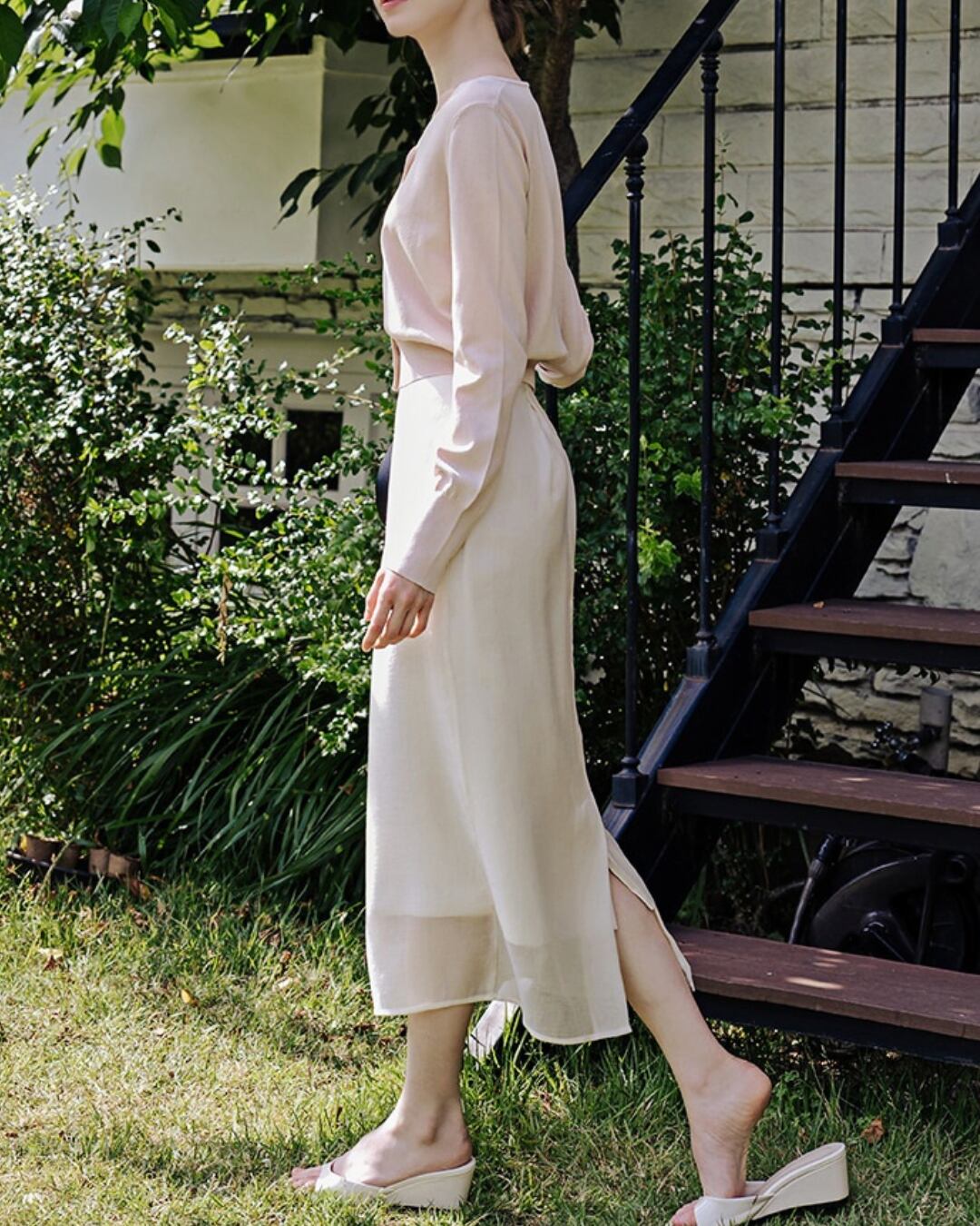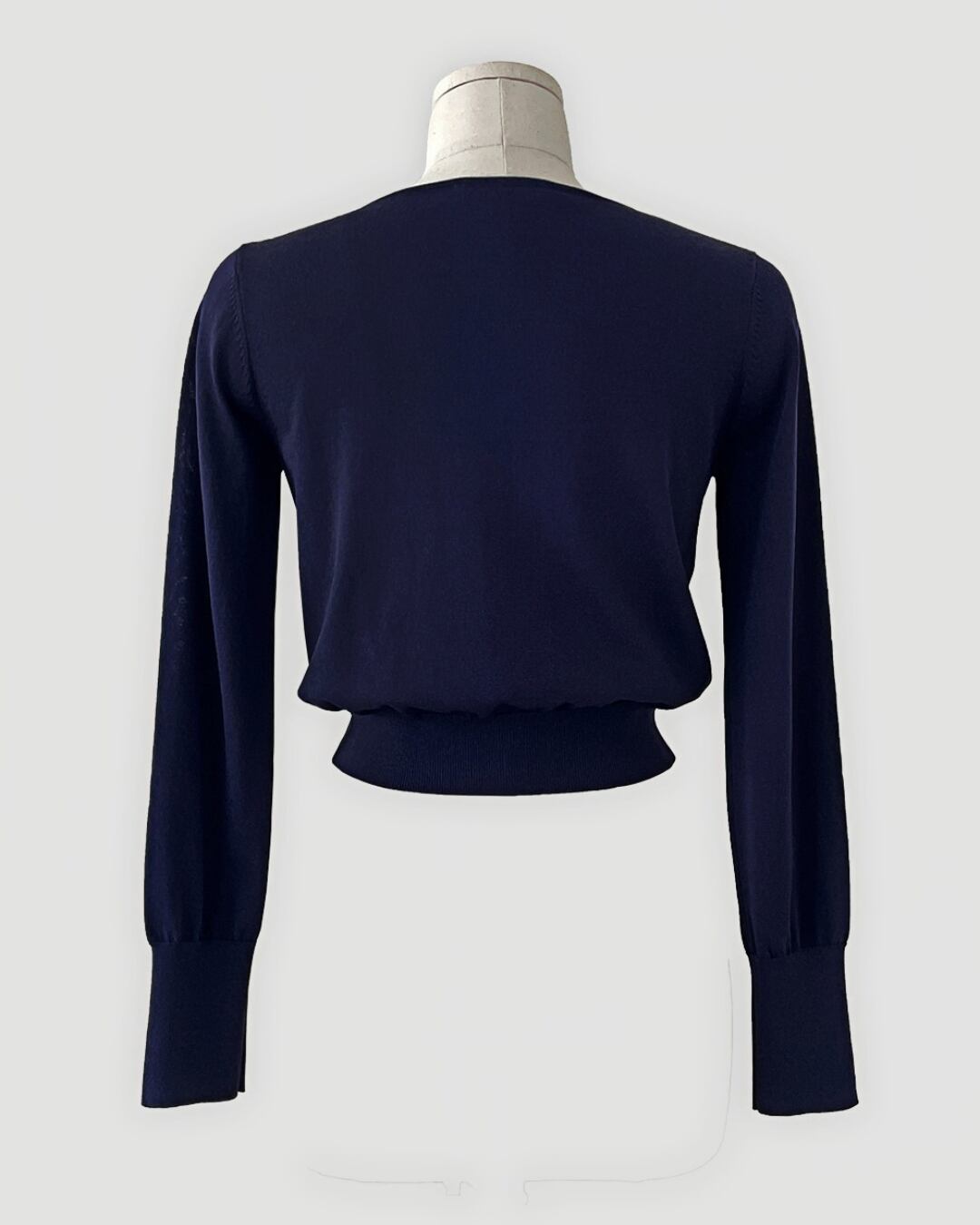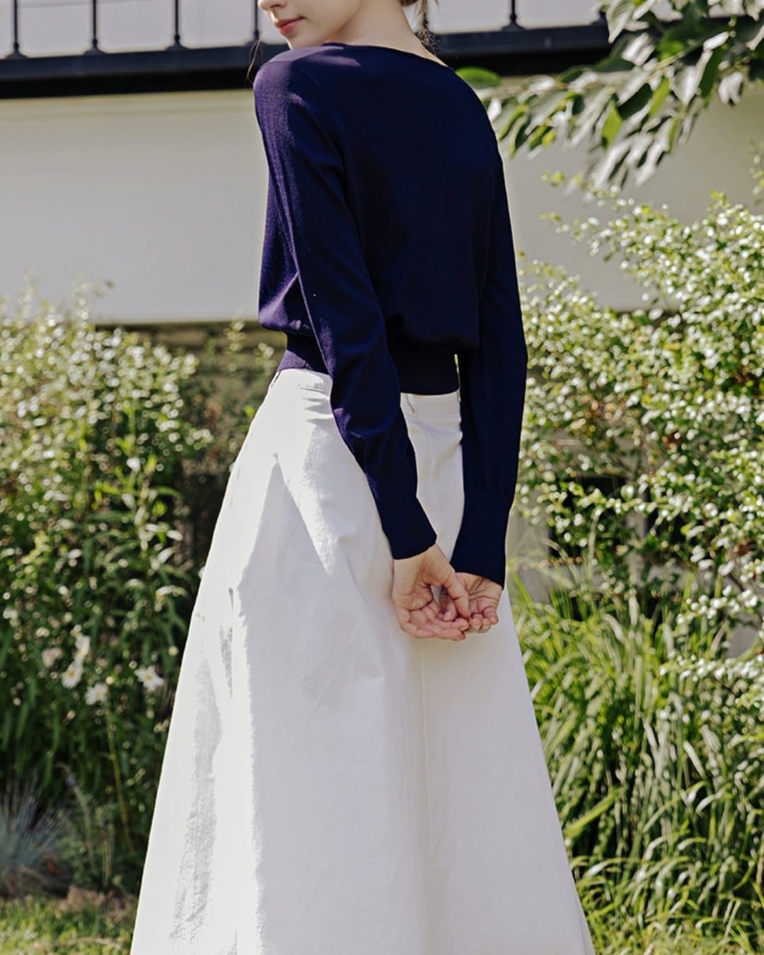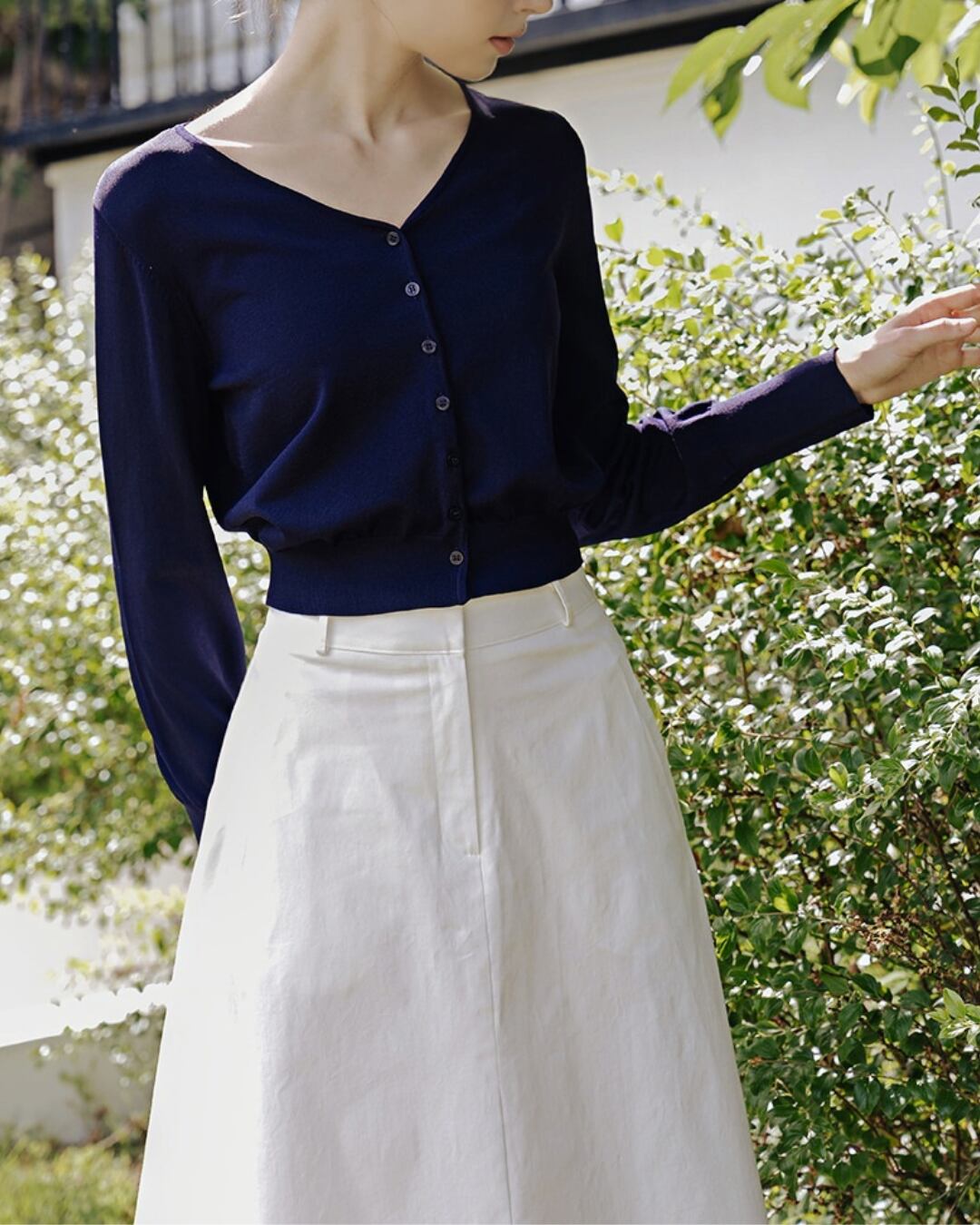 Vネックのデザインがデコルテを美しく見せ、どんなスタイルにも合わせやすい万能アイテムです。