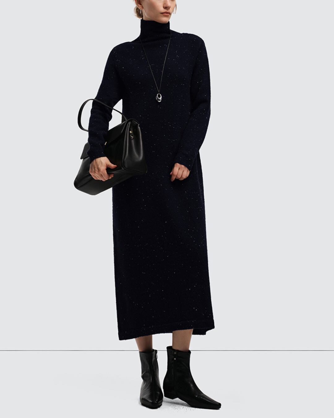 タートルネックが上品さを演出し、落ち着いた印象を与えます。