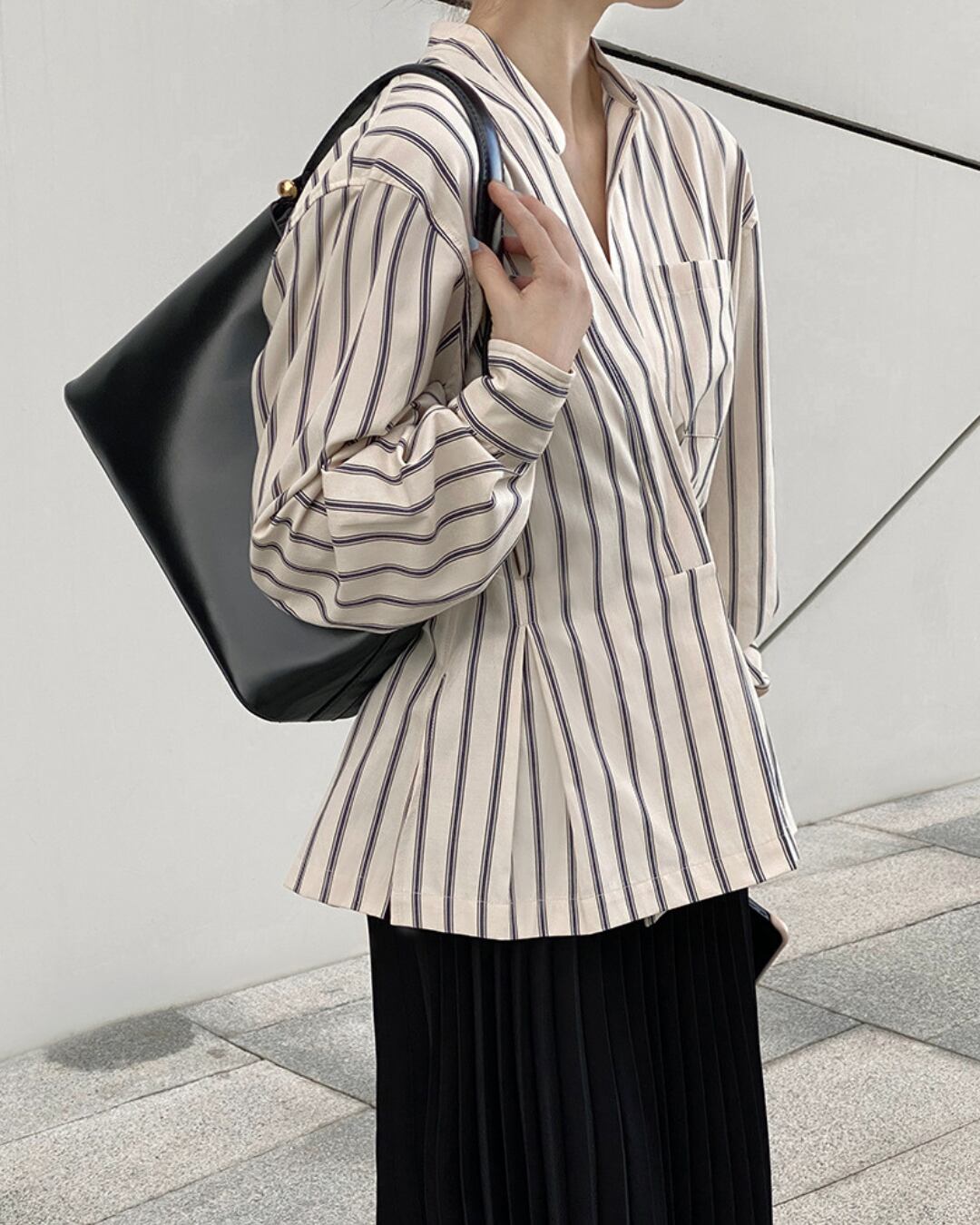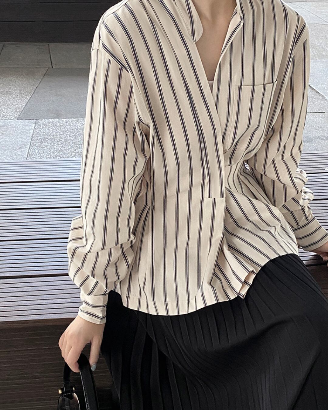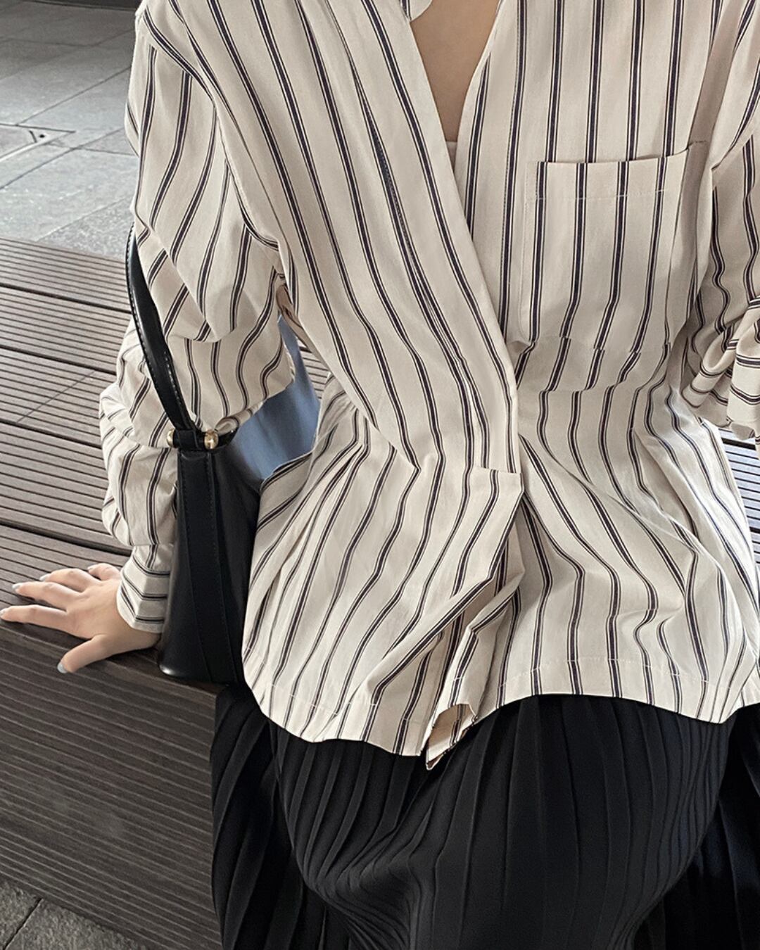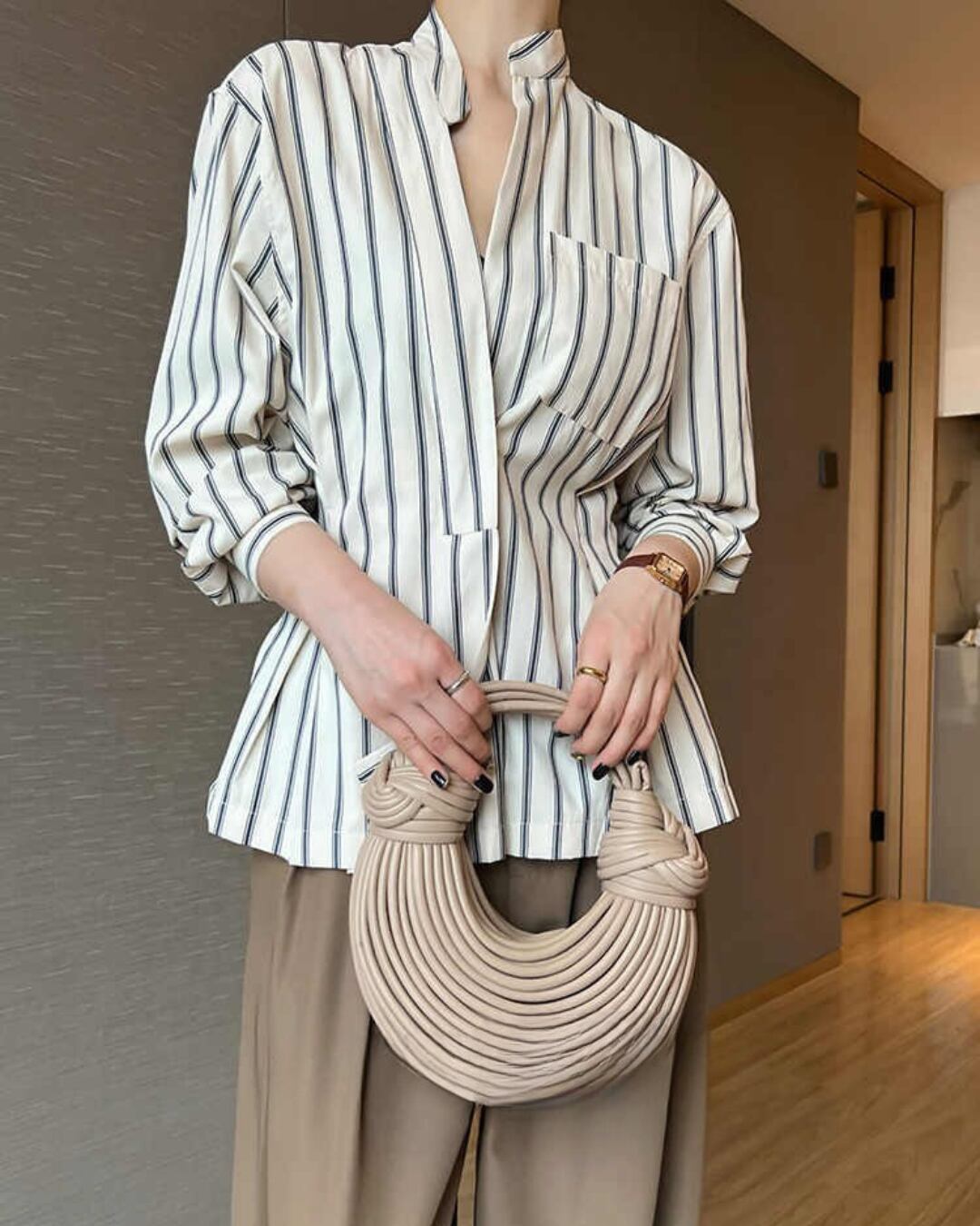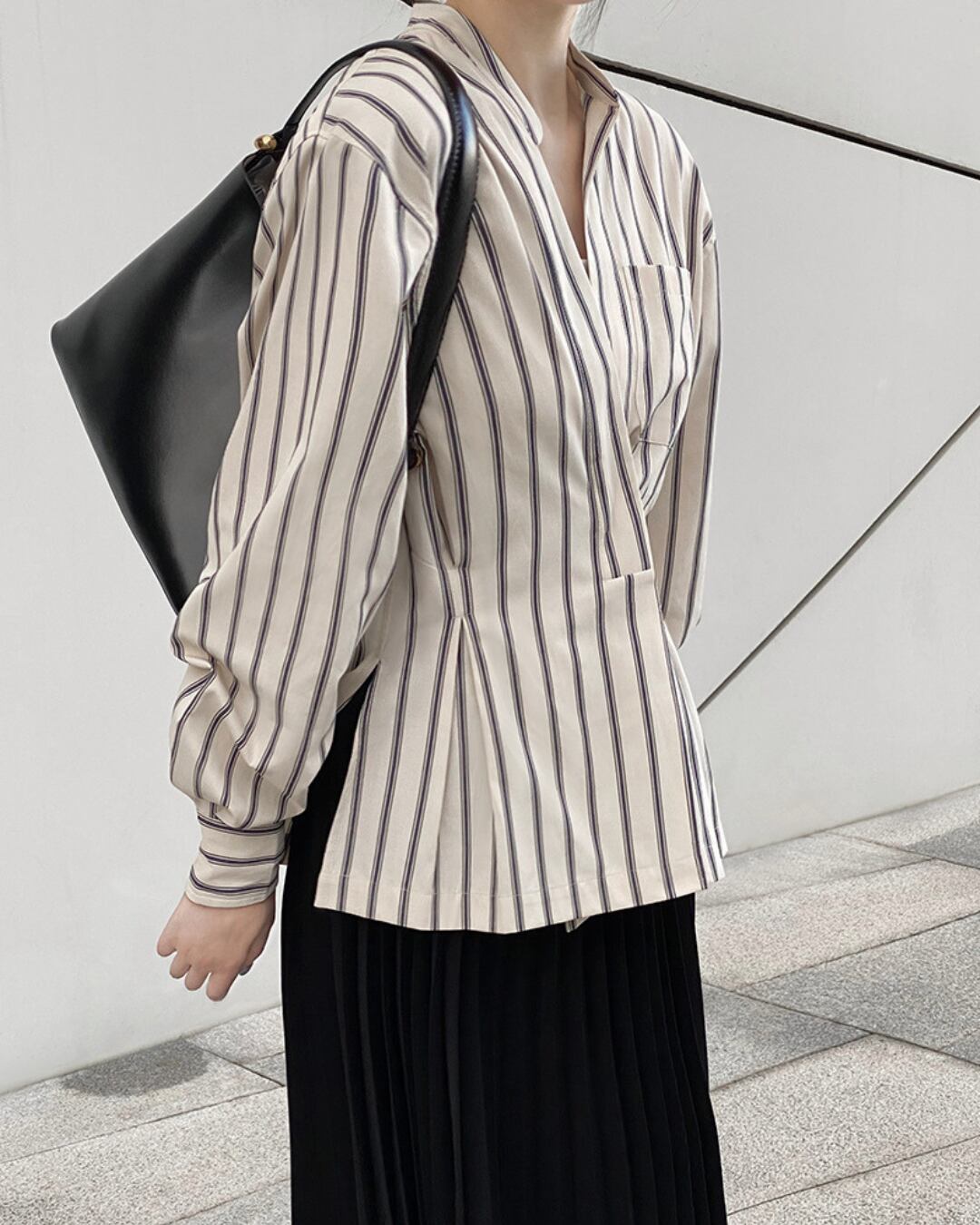 Striped Tuck-In Stand Collar V-Neck Blouse S00128