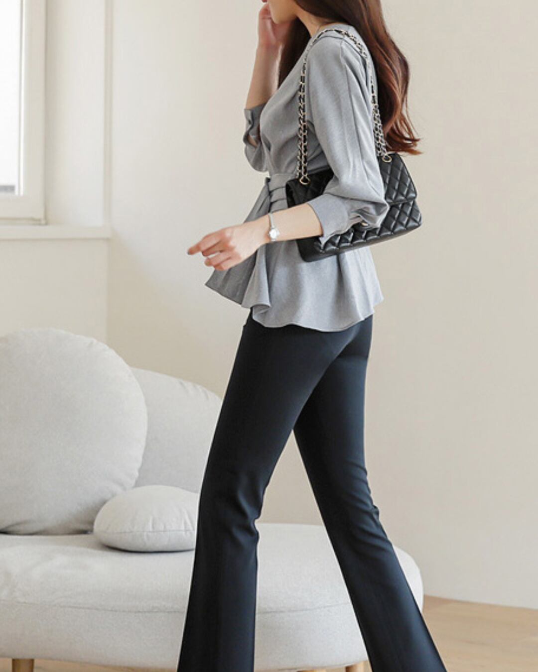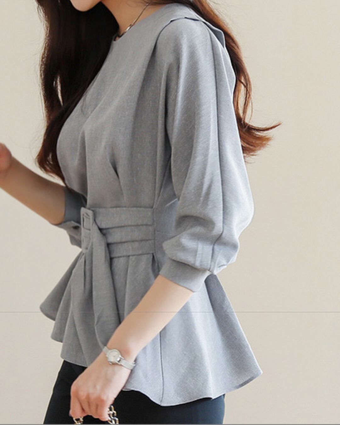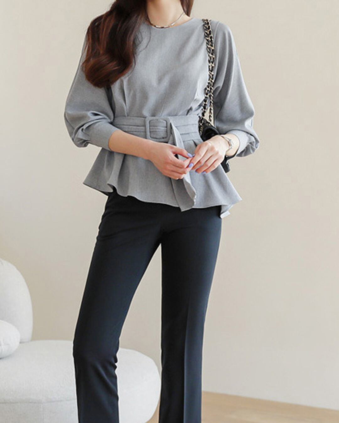 ベルトでウエストマークできるペプラムブラウスは、一枚で着映えするデザイン。