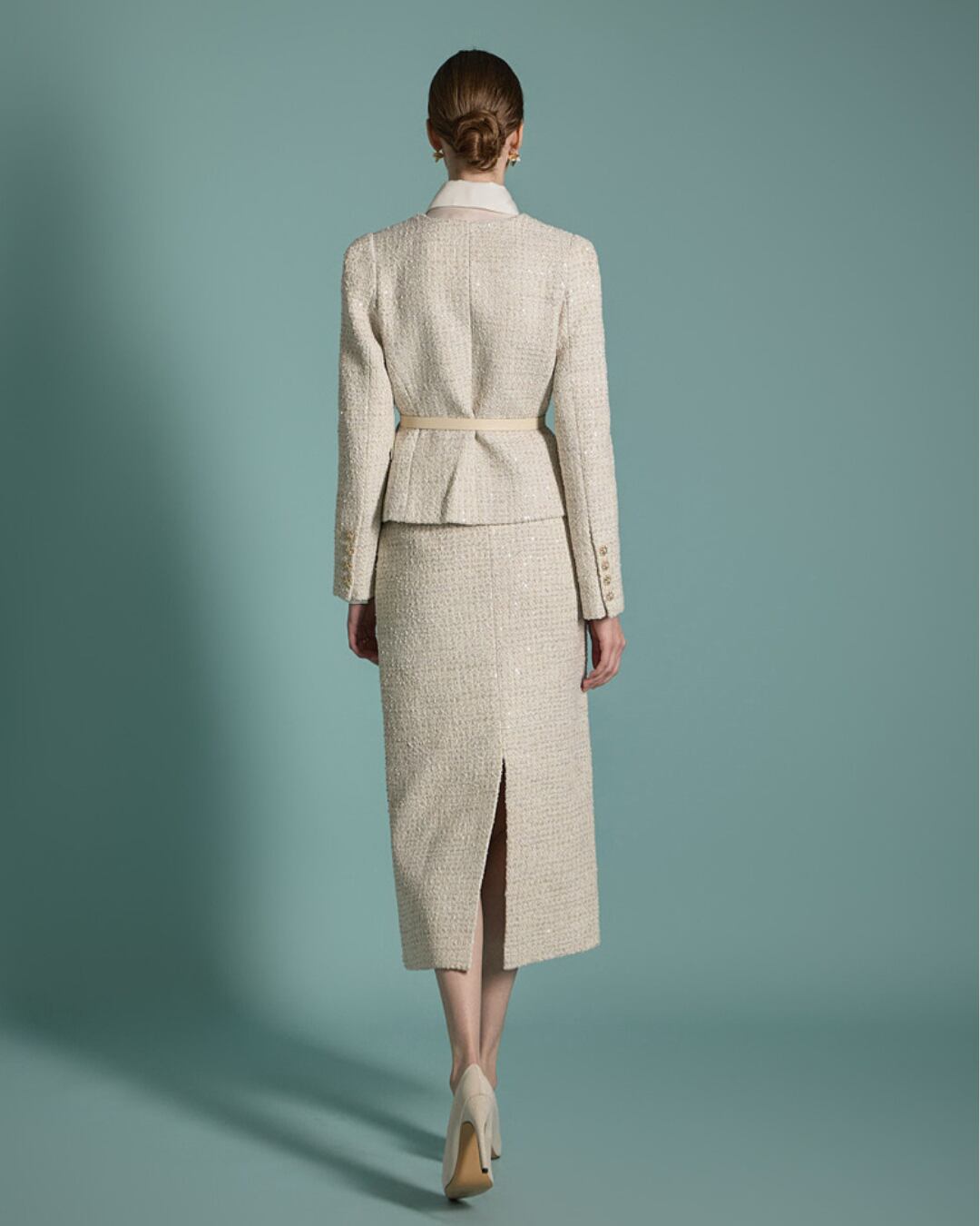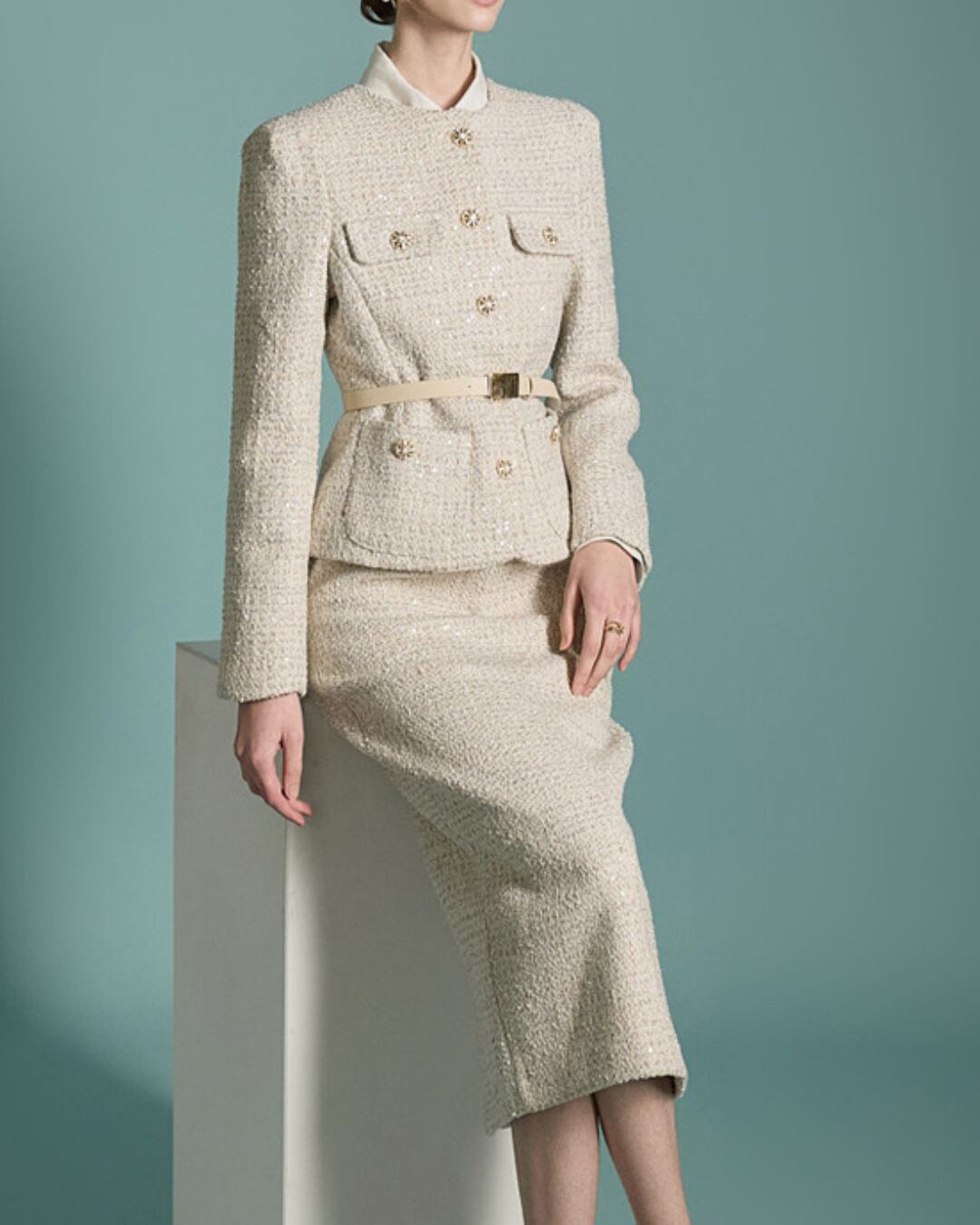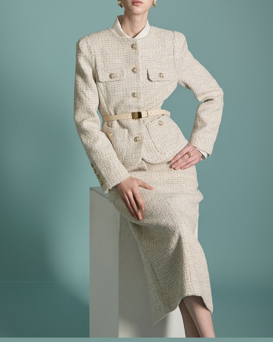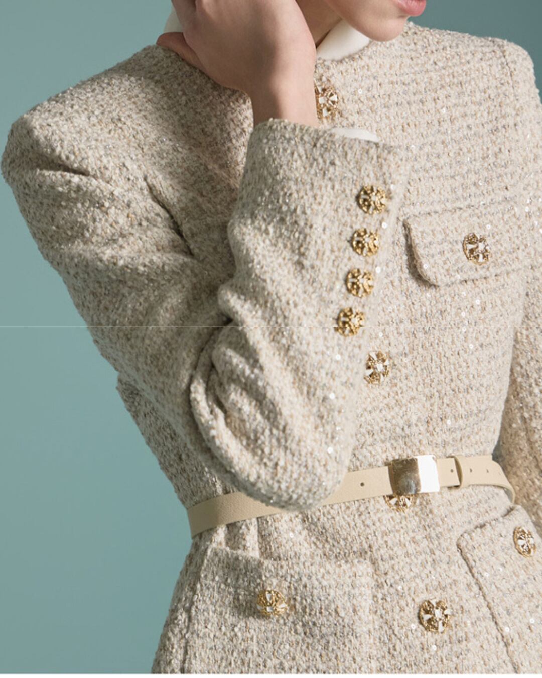 金ボタンがアクセントになった、上品な印象のツイードジャケット。
