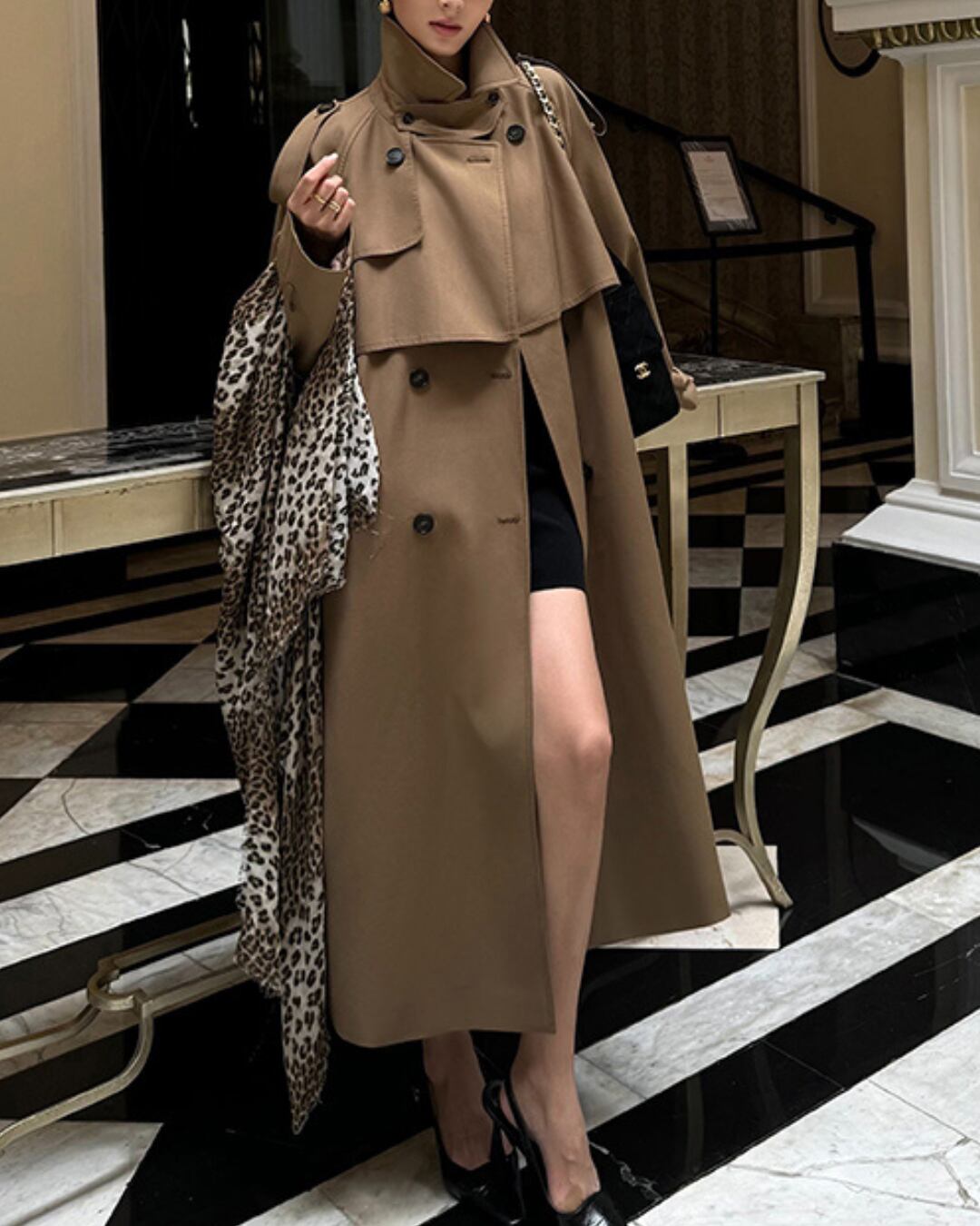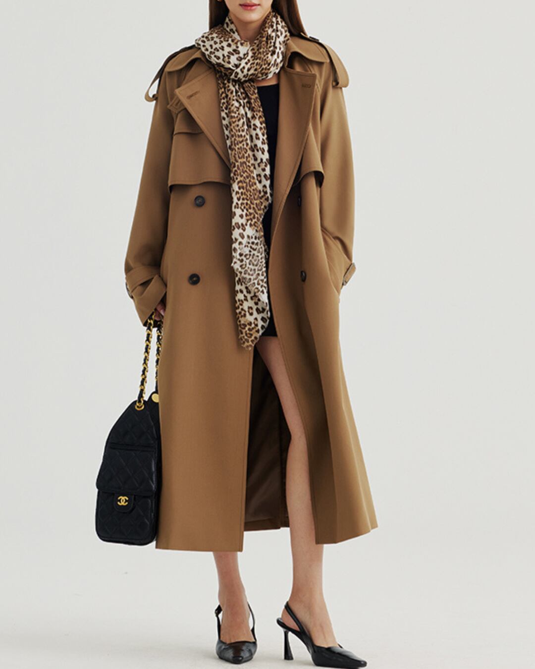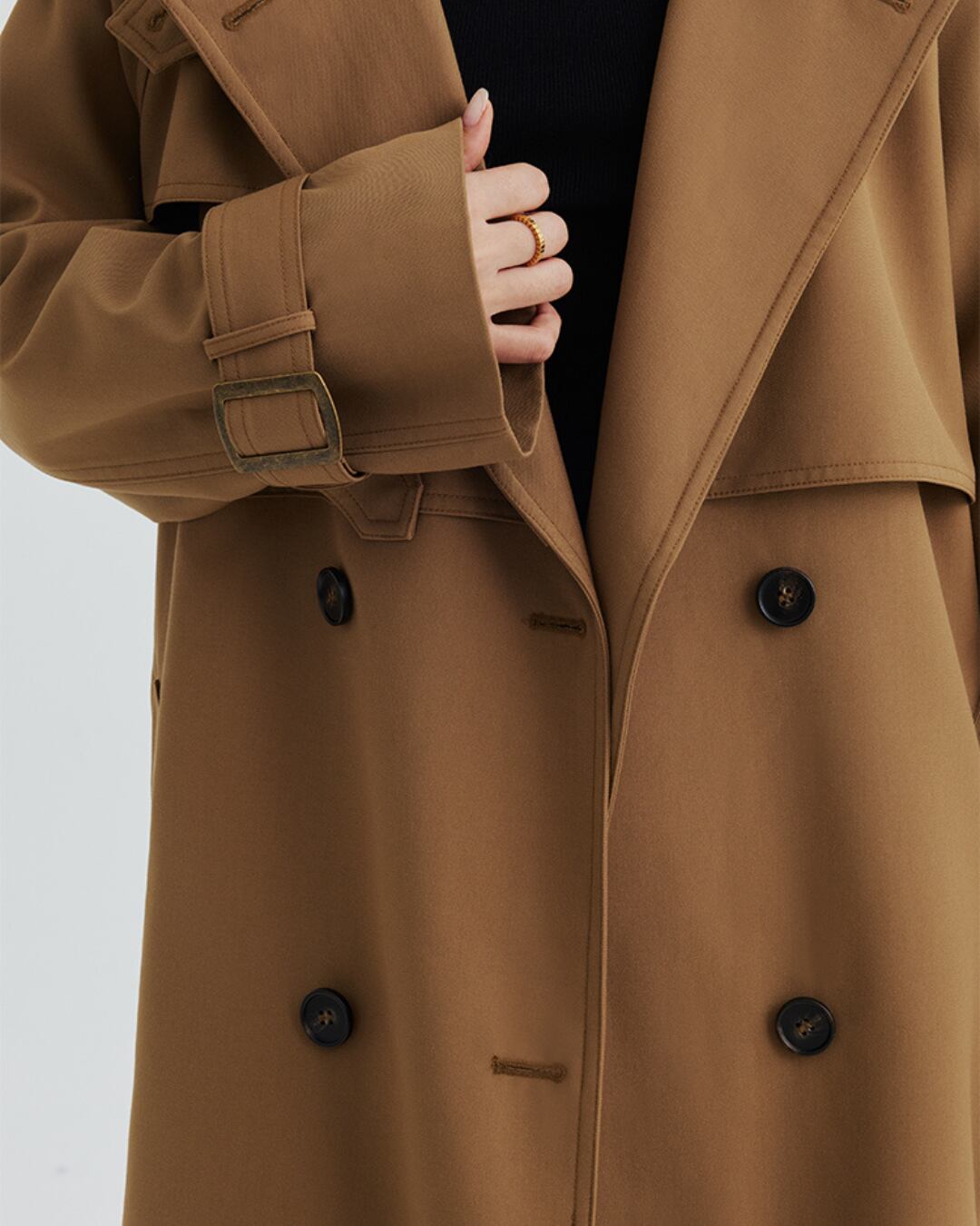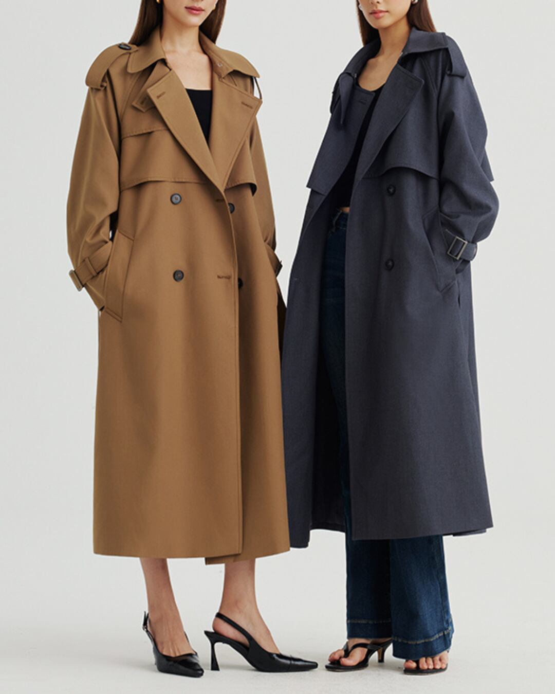 ダブルブレストとベルトがポイントのロングトレンチコート。