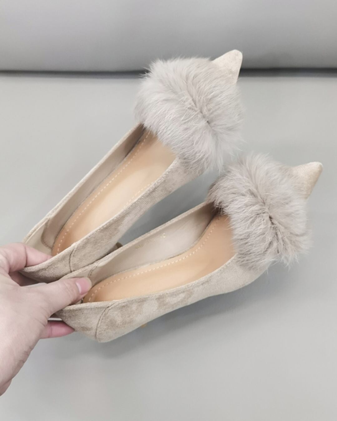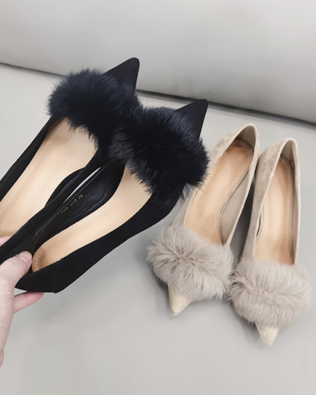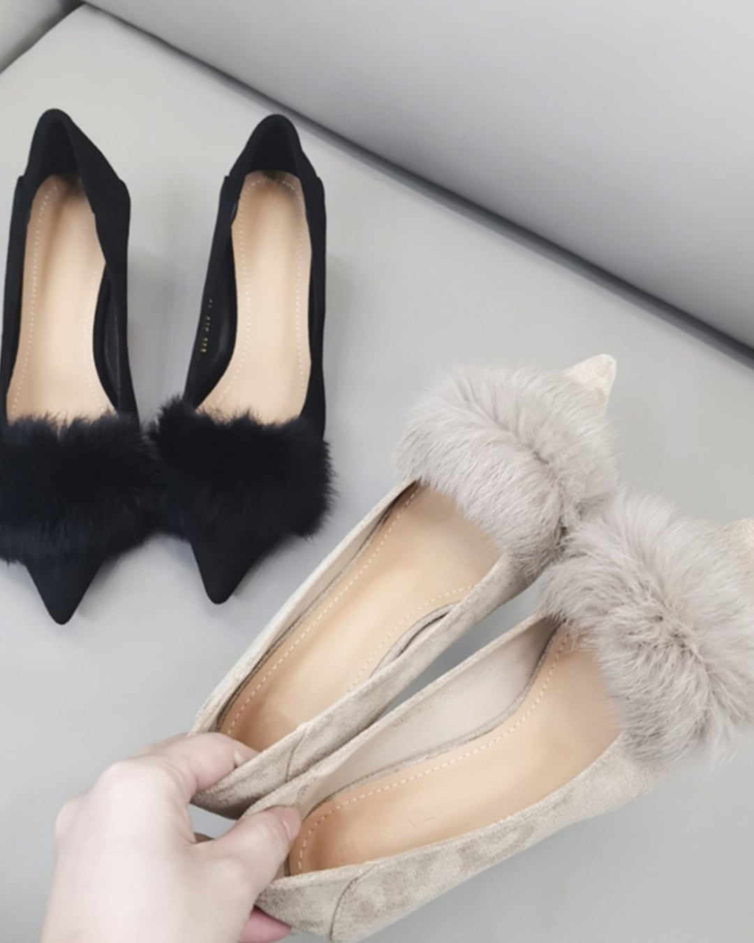 足元に遊び心をプラスする、ファー付きミドルヒールパンプス。