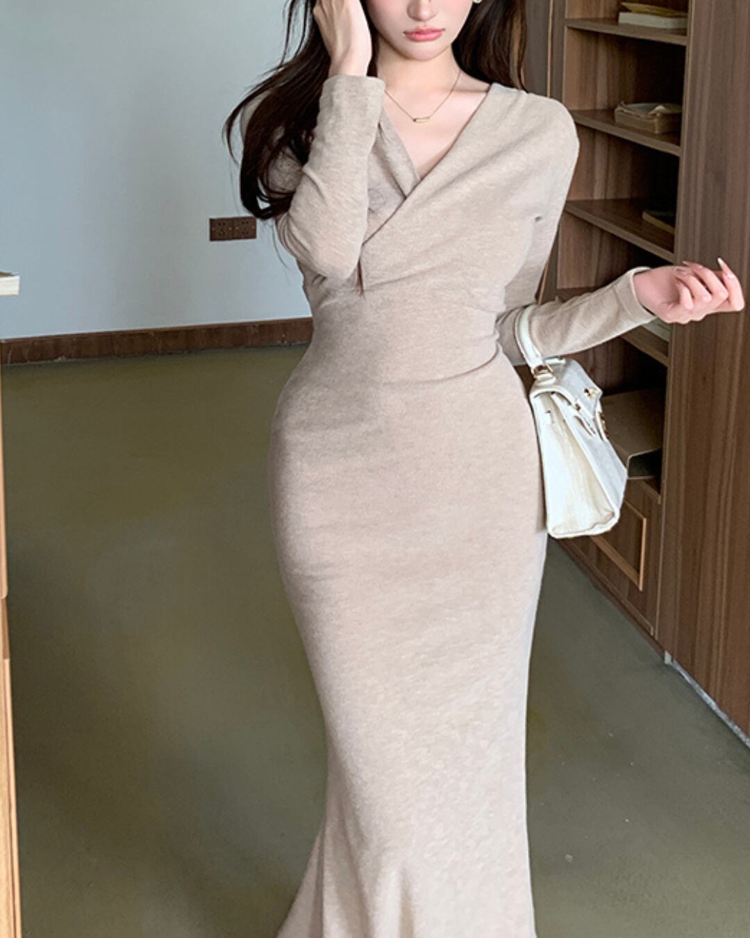 ラップスタイルが目を引く、長袖ミディ丈ニットワンピース。