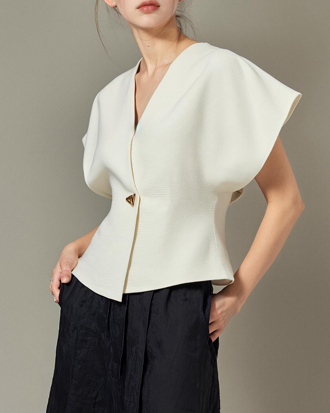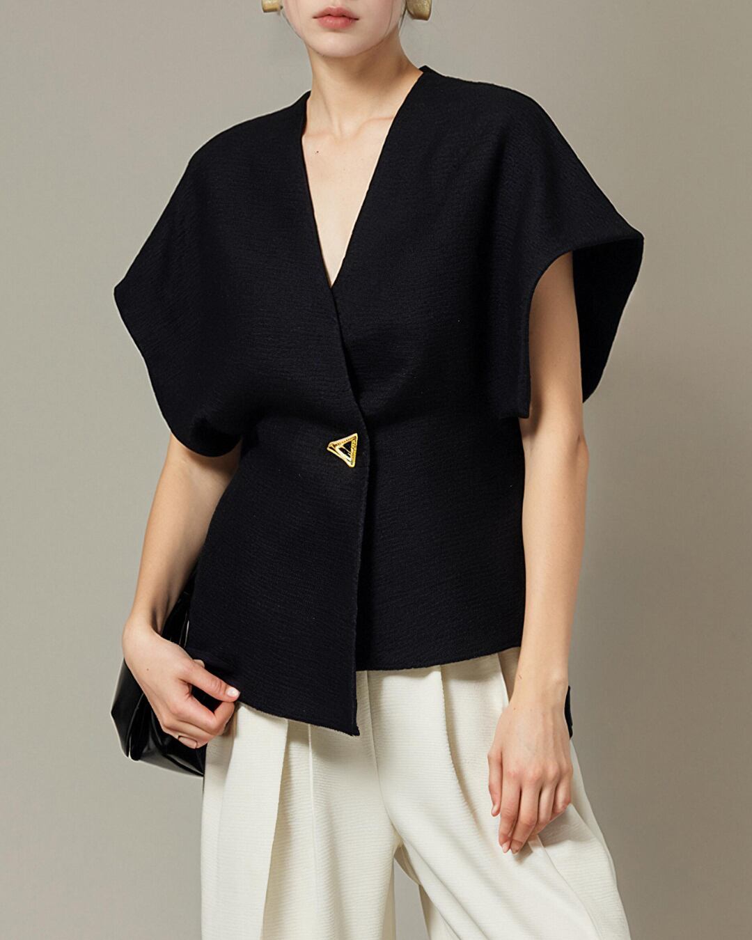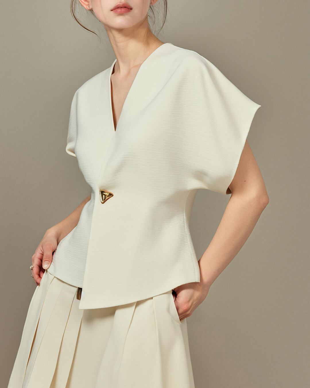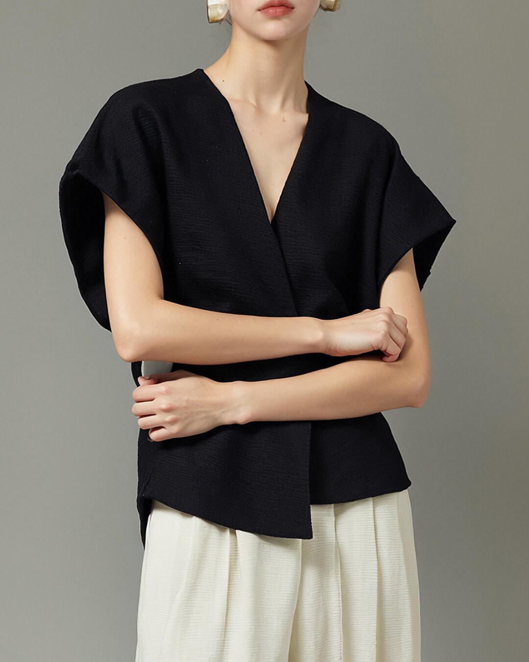 短めの丈がスタイルアップ効果をもたらす、ラップデザインの半袖プルオーバーブラウス。
