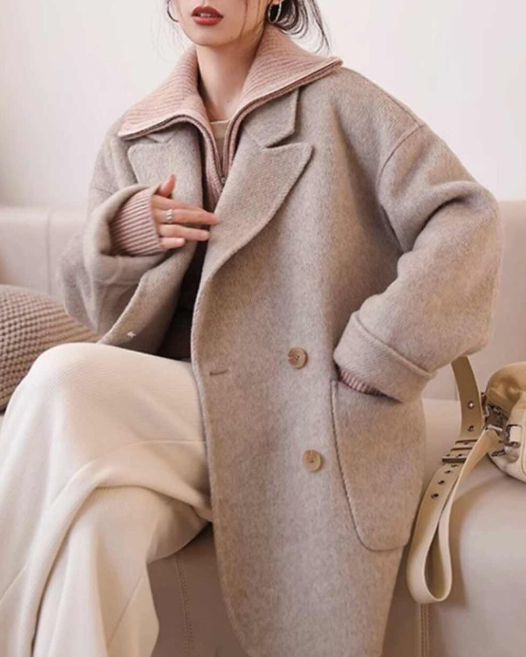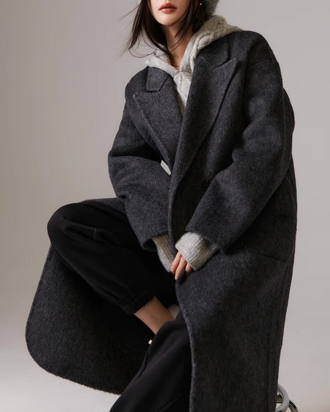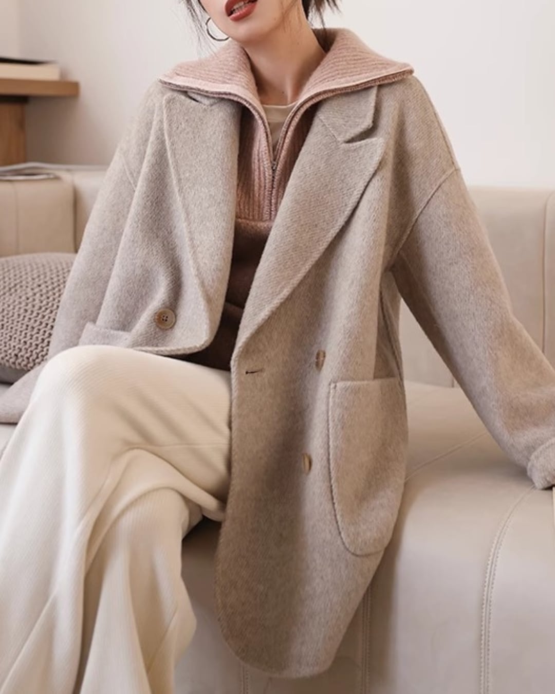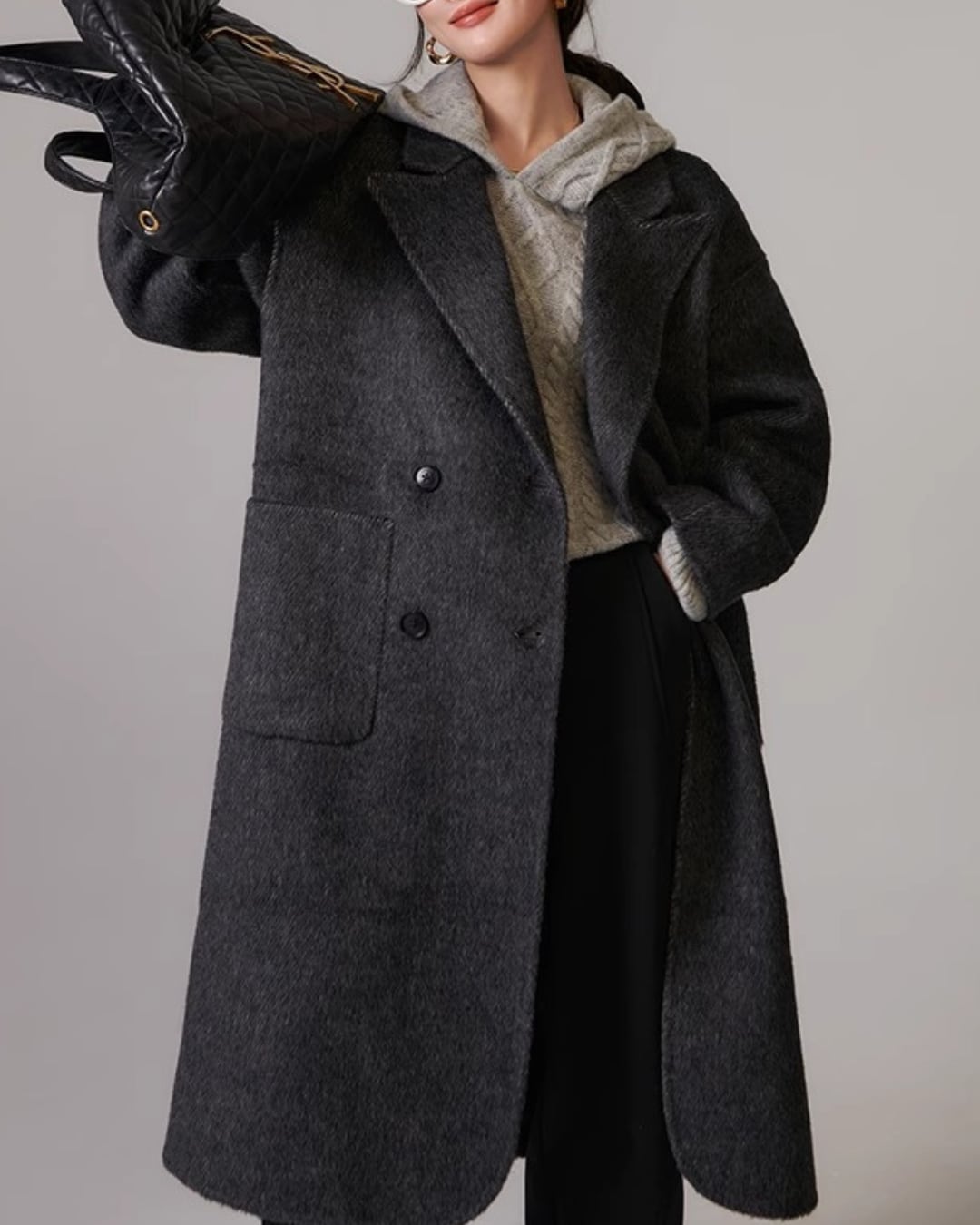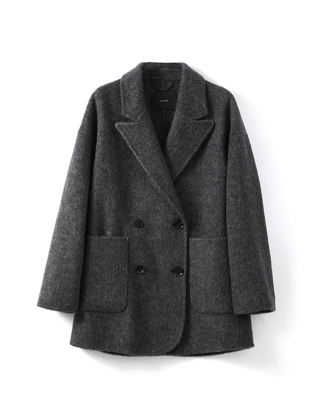 ダブルブレストのデザインが目を引く、ヒップ丈のジャケット。