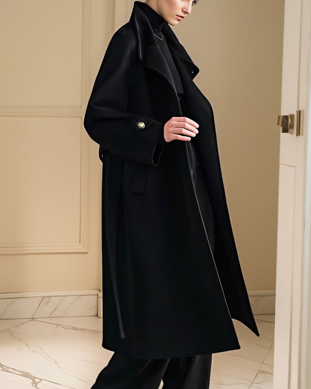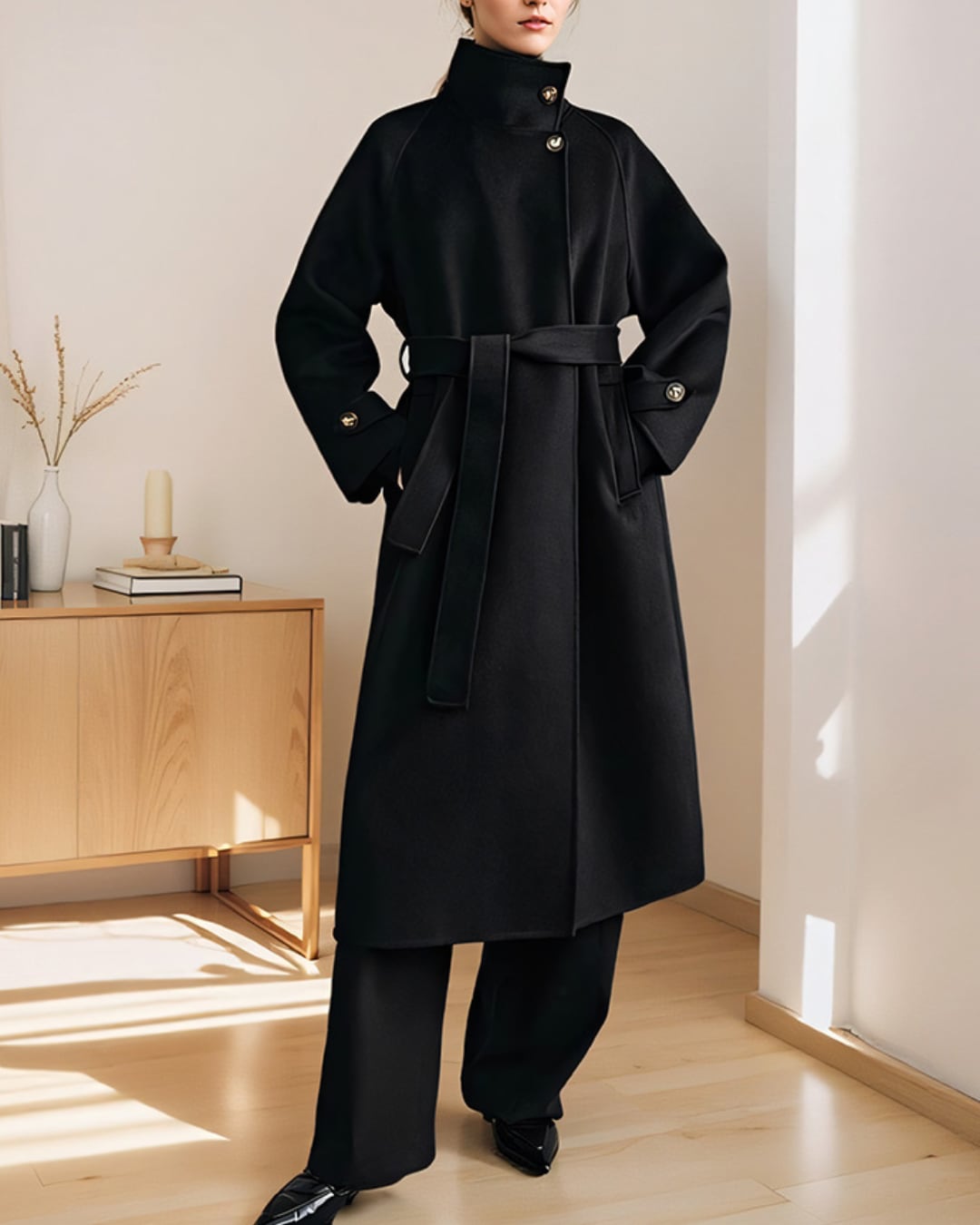 Belted Midi Stand Collar Long Sleeve Coat S00217