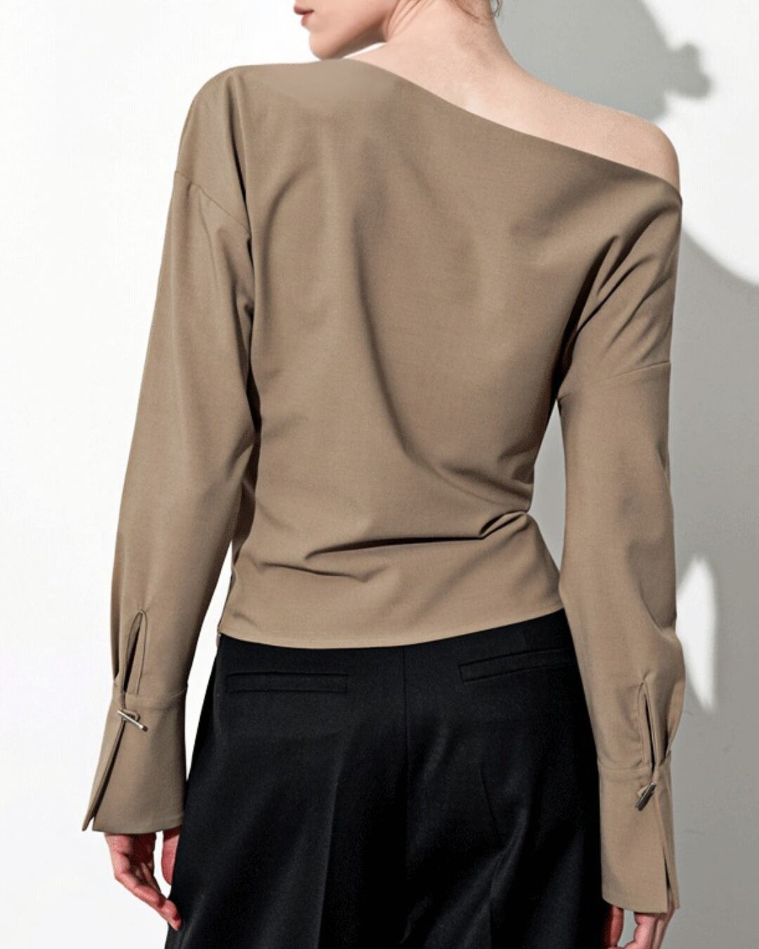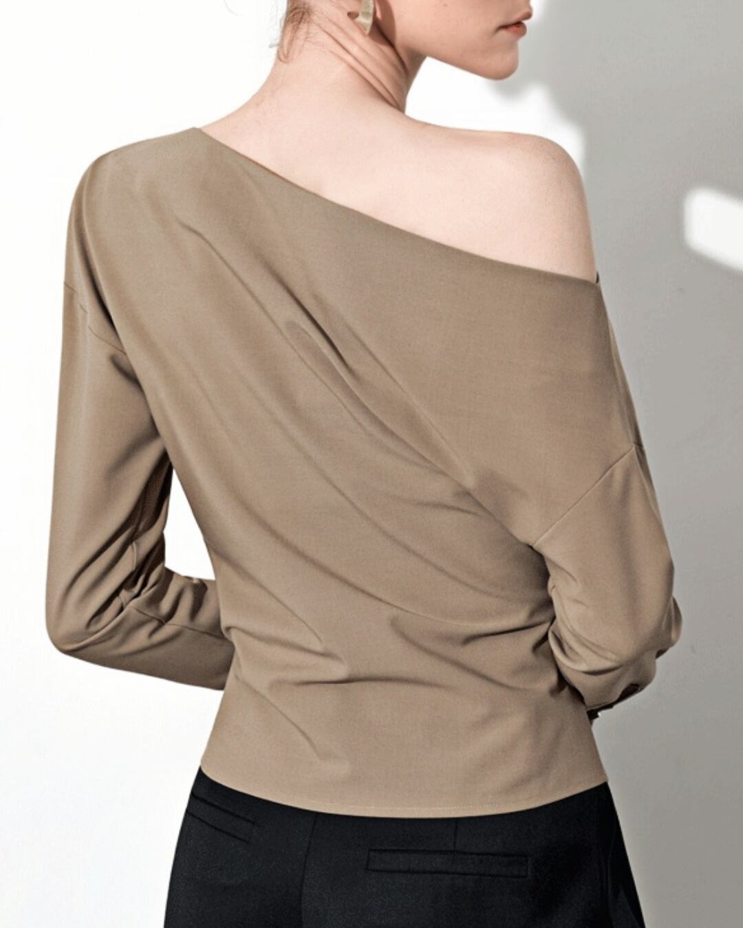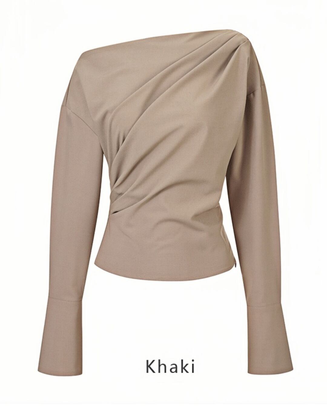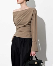 スタイリッシュなオフショルダーデザインと、滑らかなドレープが魅力のトップス。