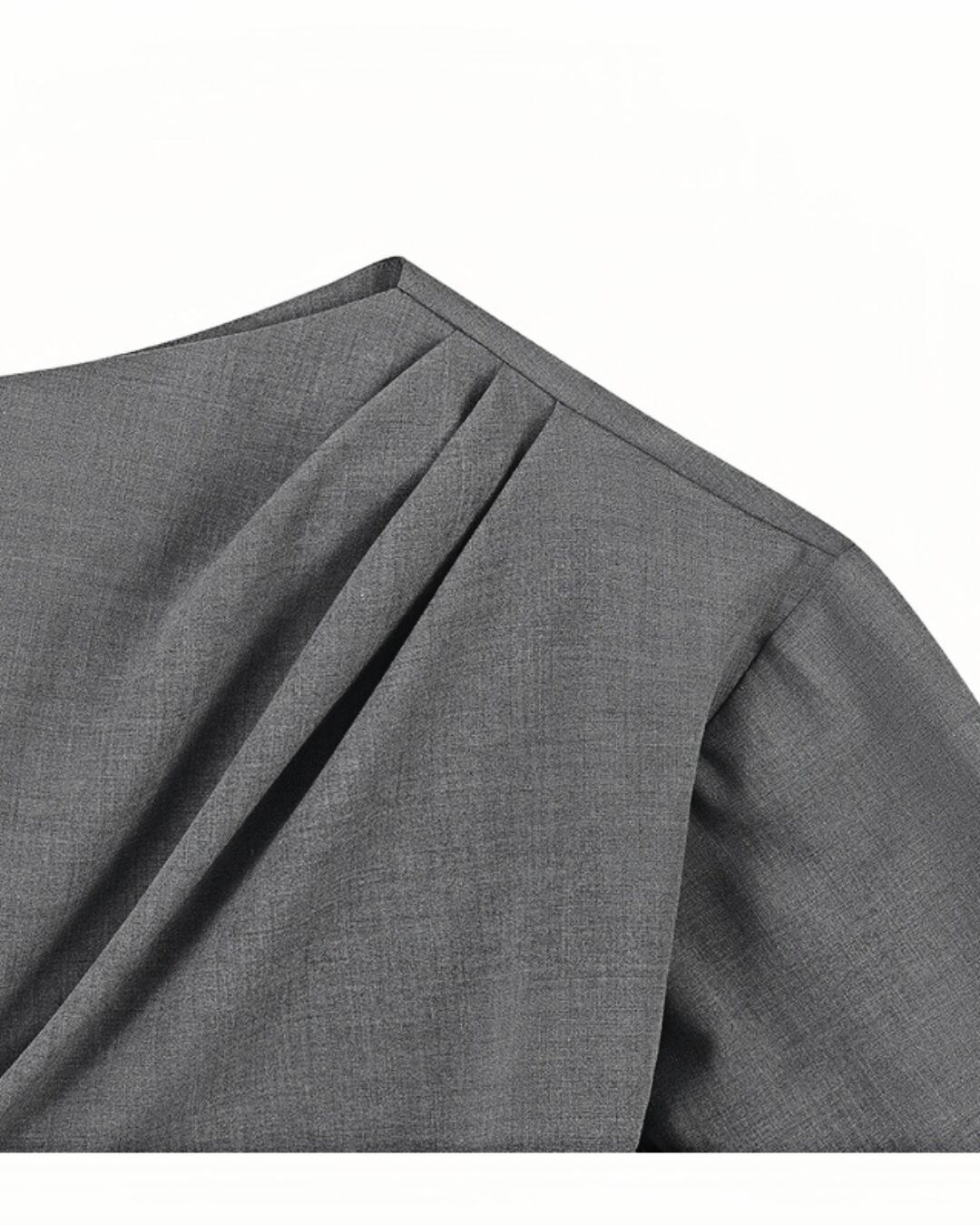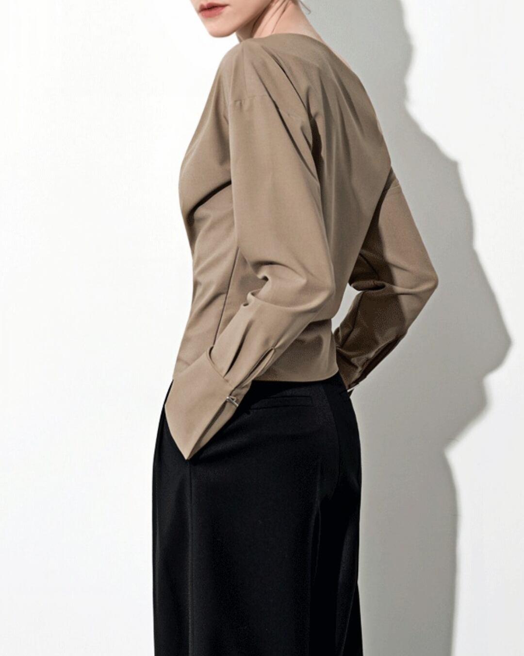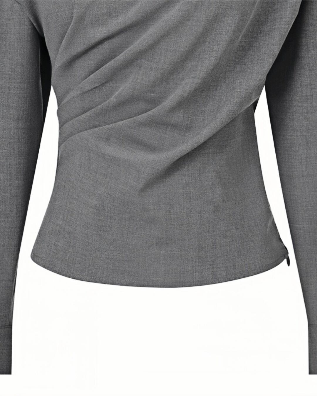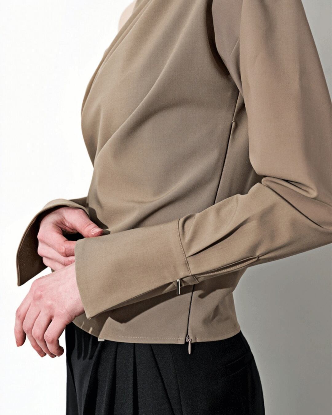 スタイリッシュなオフショルダーデザインと、滑らかなドレープが魅力のトップス。