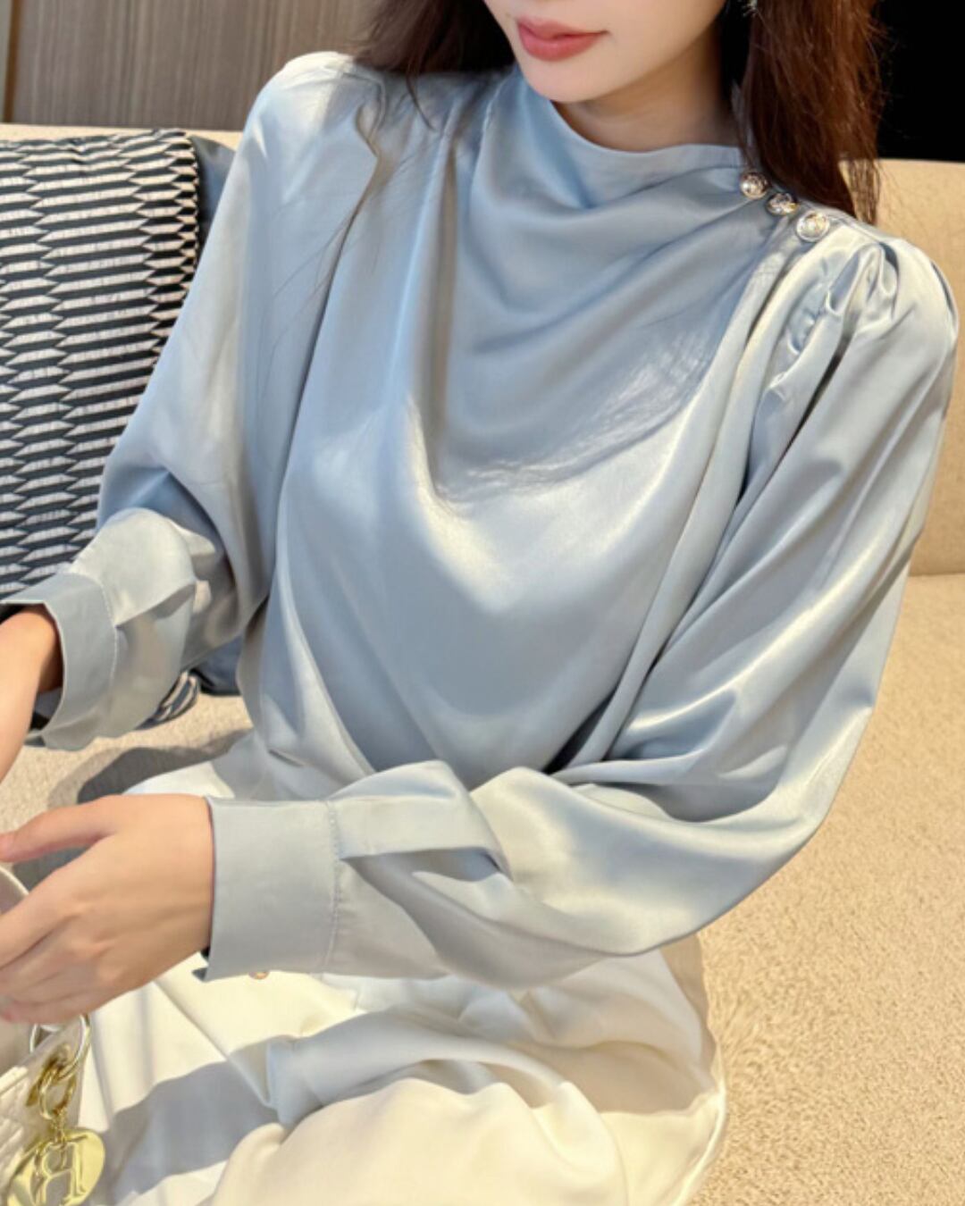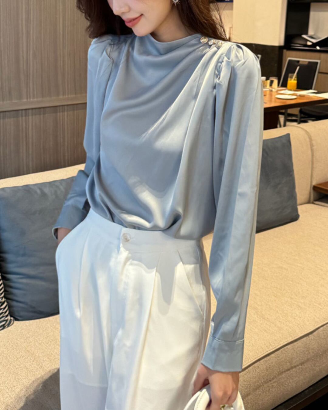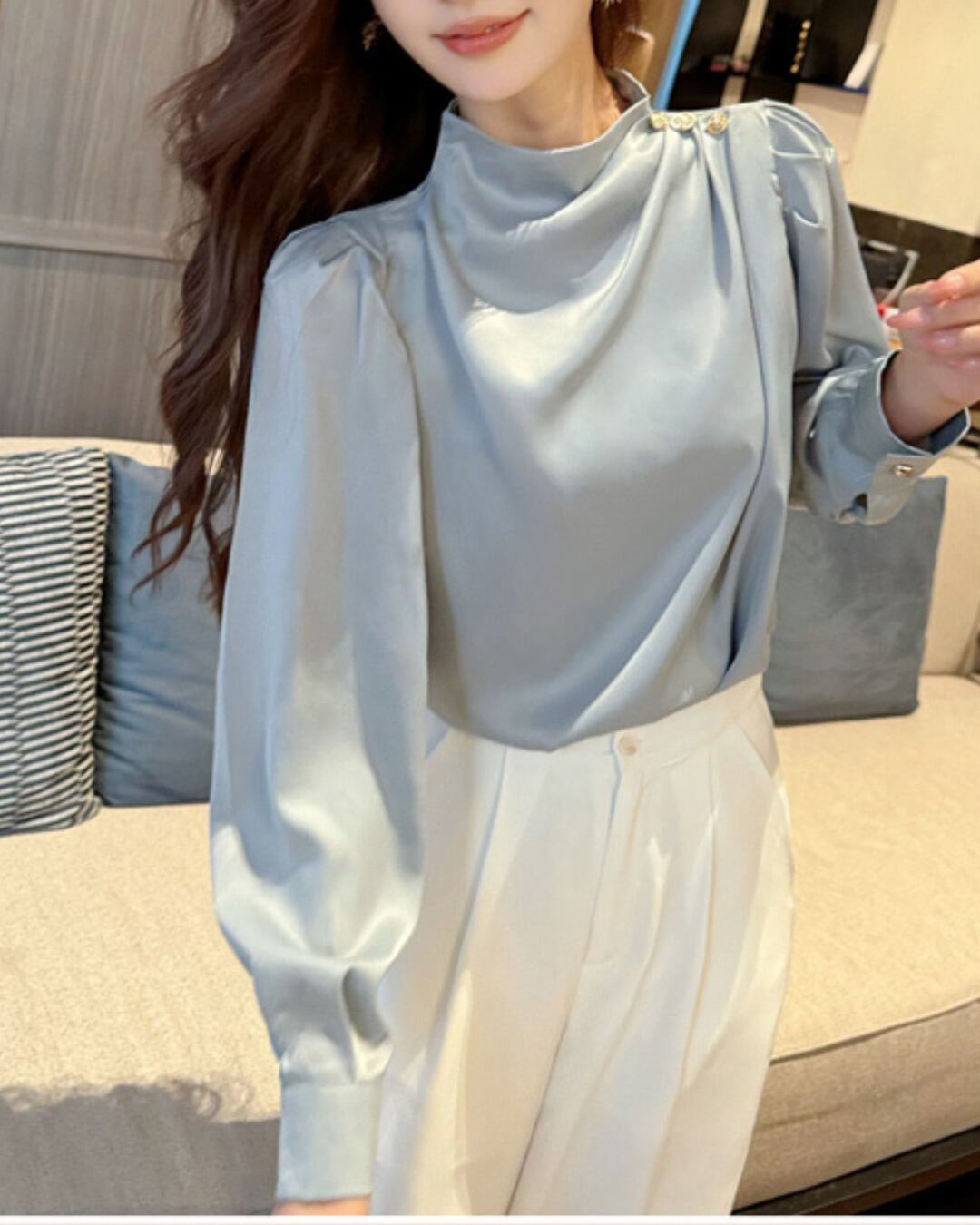 Satin High Neck Puff Sleeve Long Sleeve Blouse S00081