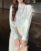 ハイネックとパフスリーブが織りなす、洗練されたロングスリーブブラウス。上品な光沢感と、女性らしいシルエットが魅力です。