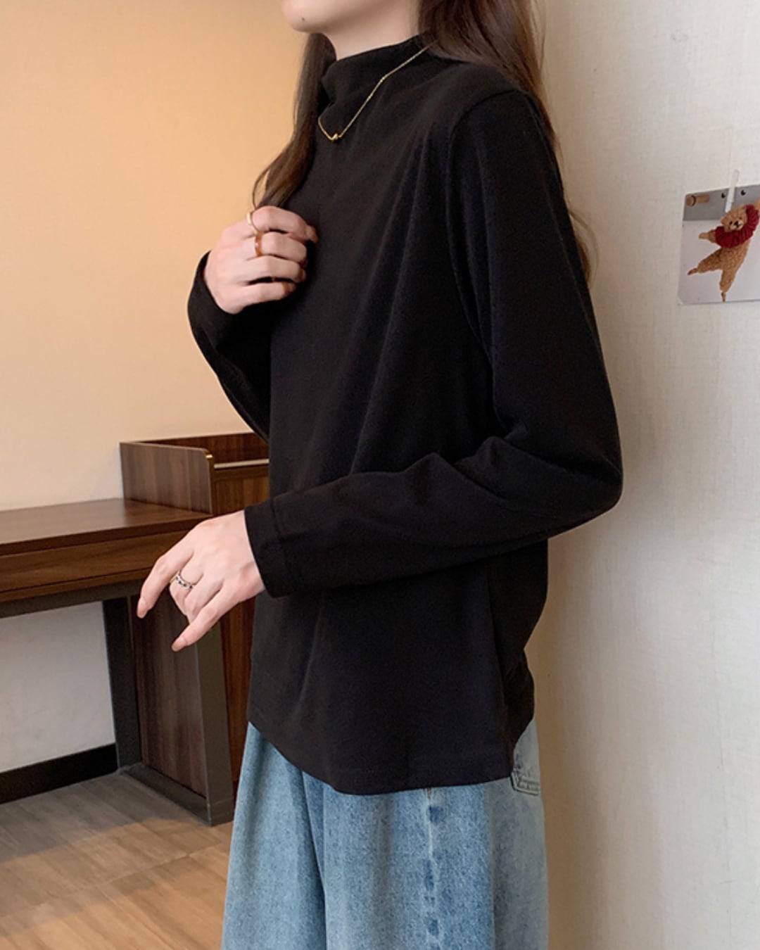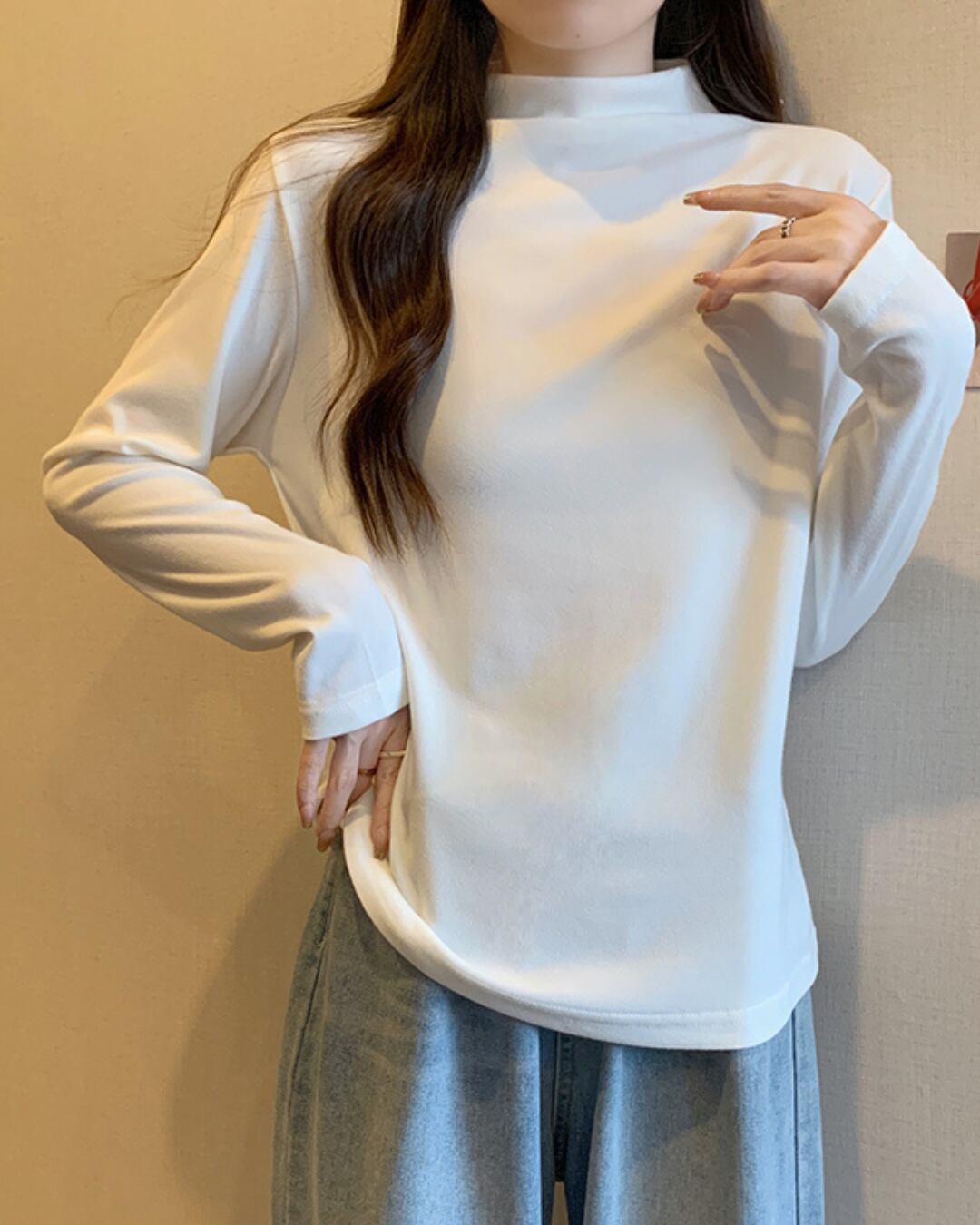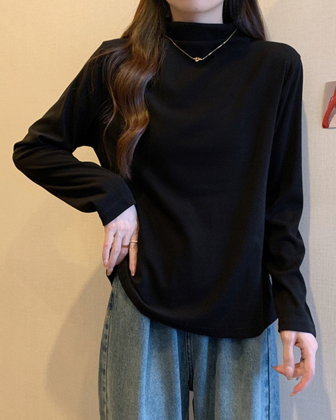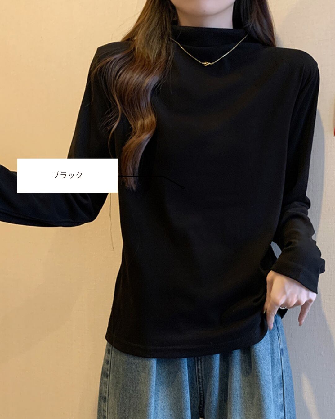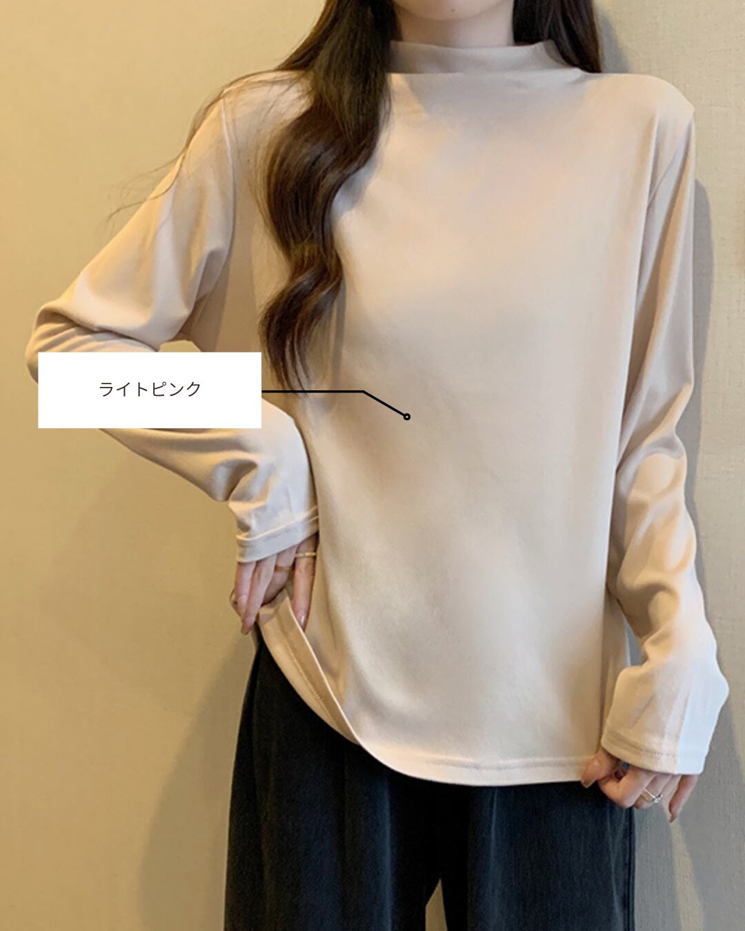 ハイネックとロングスリーブのデザインが、女性らしい上品さを演出するトップス。