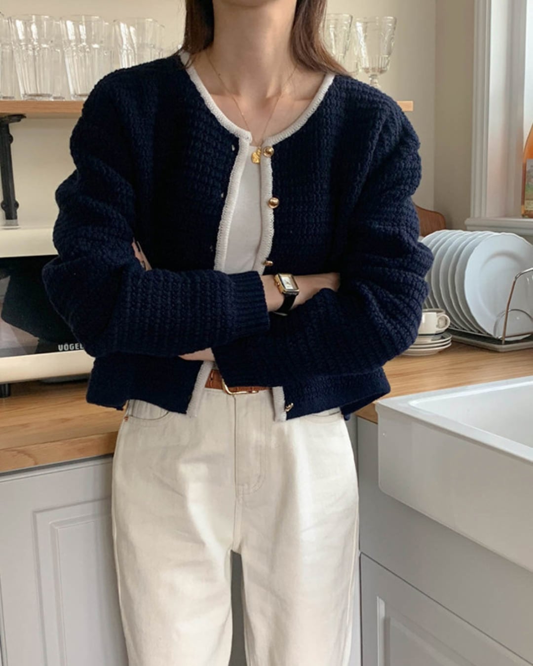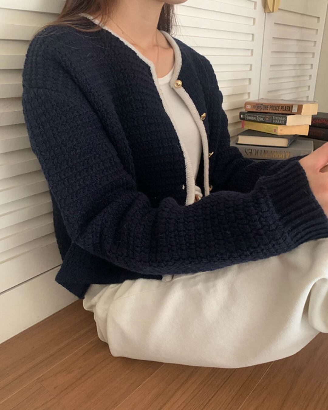 Color Trim Button Front Long Sleeve Knit Cardigan S00175