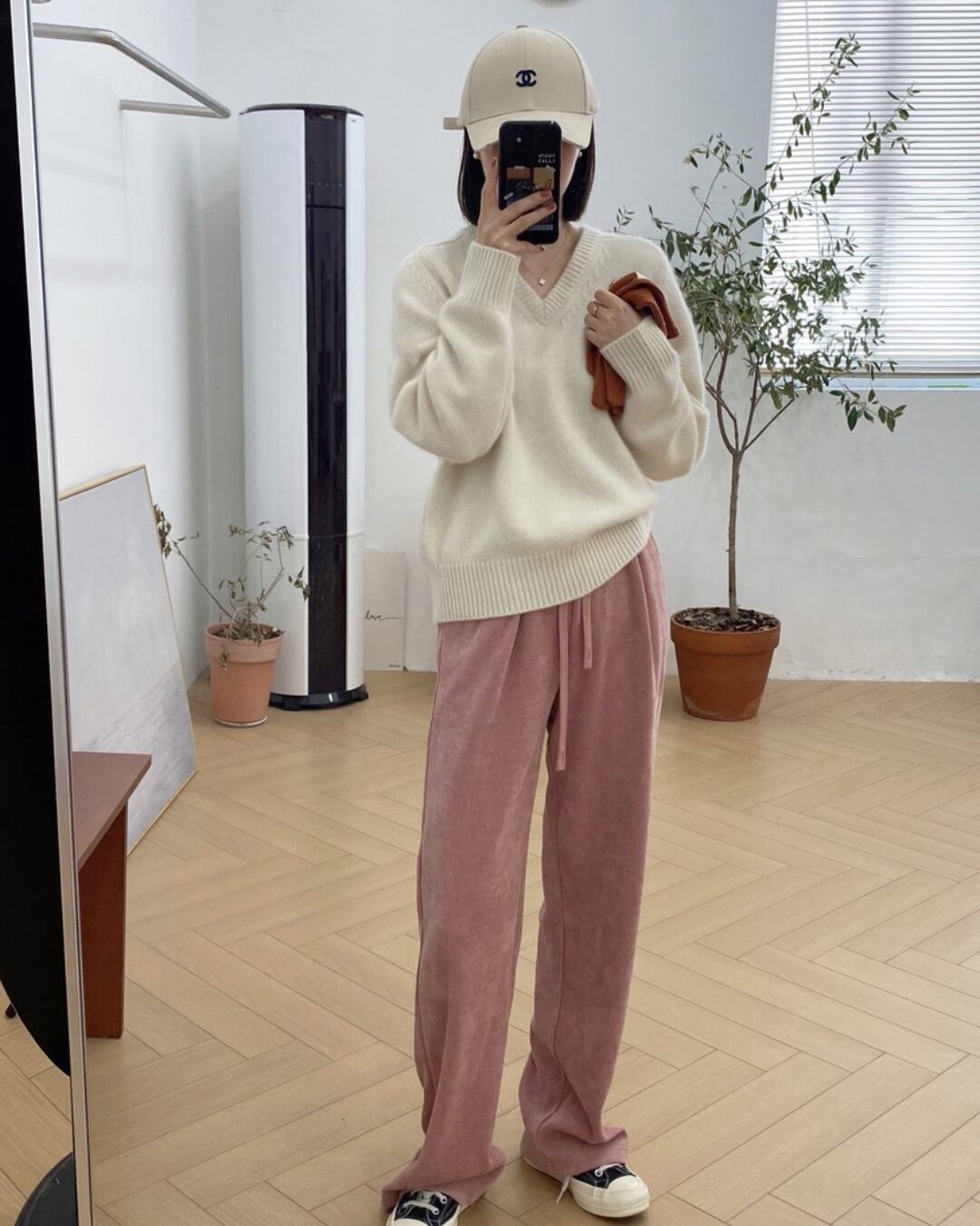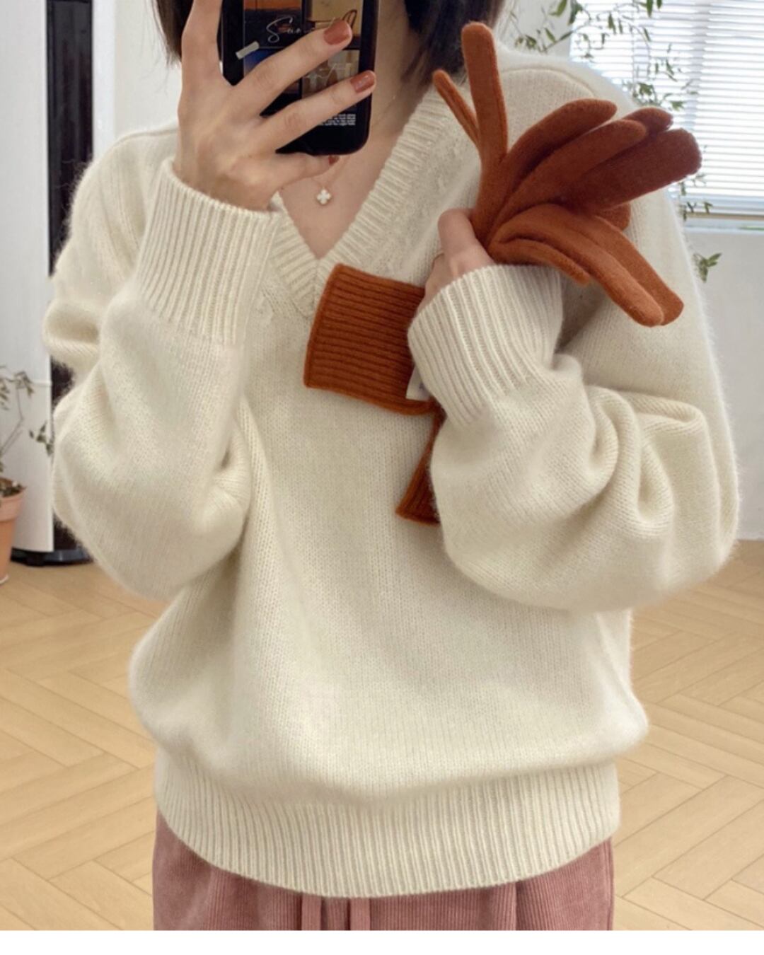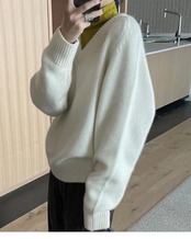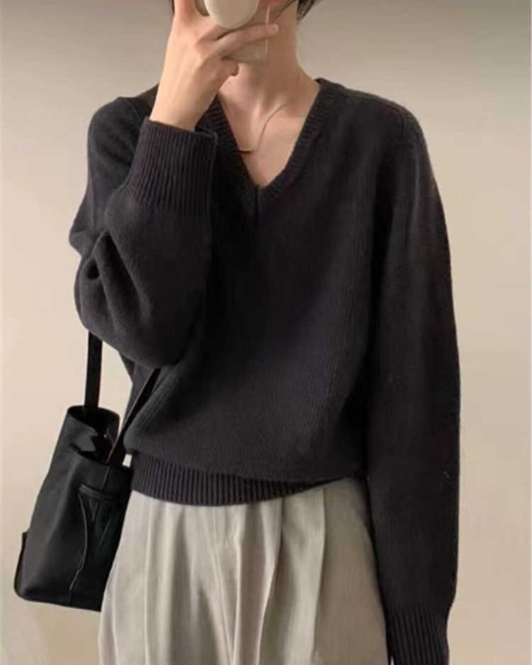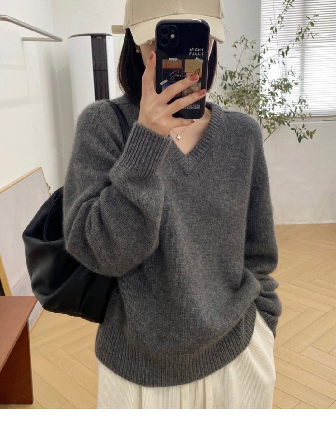 Vネックのリブニットオーバーサイズロングスリーブセーターは、一枚でこなれた雰囲気を演出する優秀アイテム。