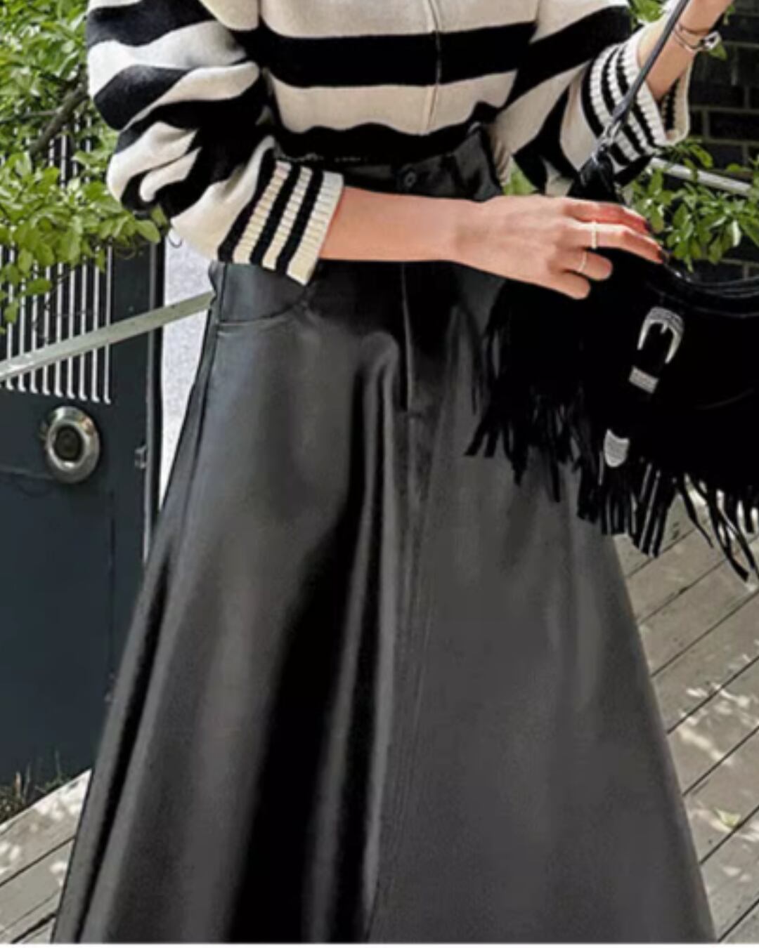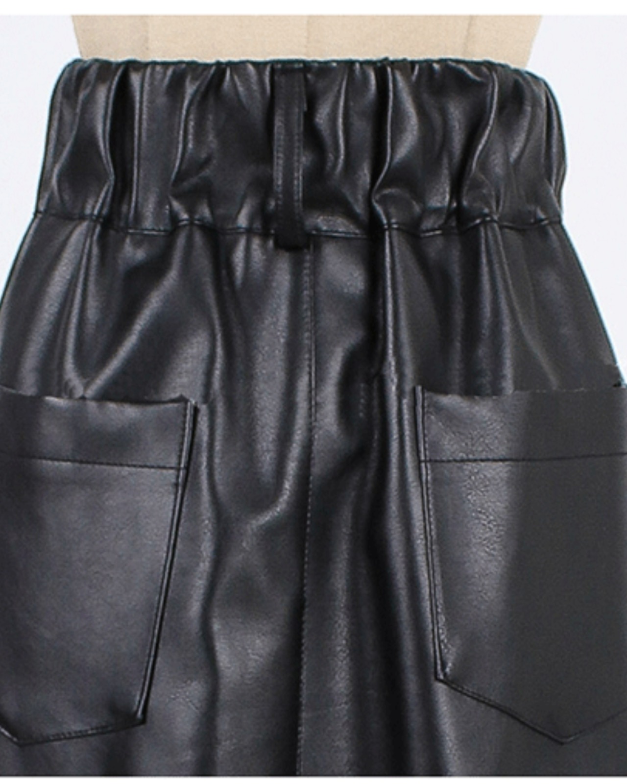 フェイクレザー素材が、大人の女性らしさとモード感を演出します。