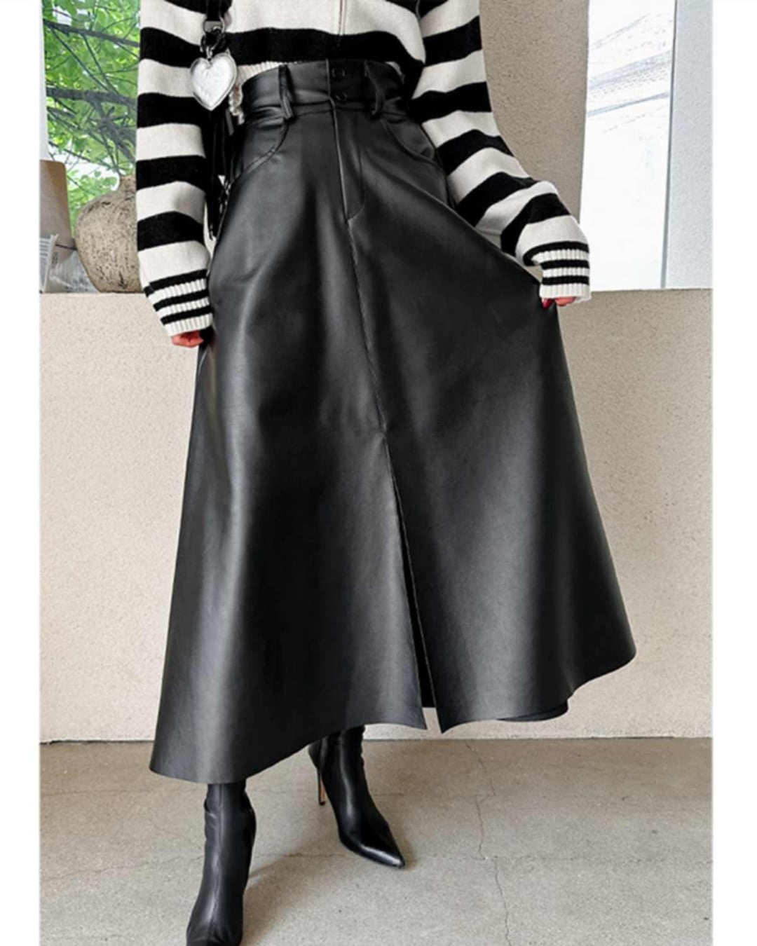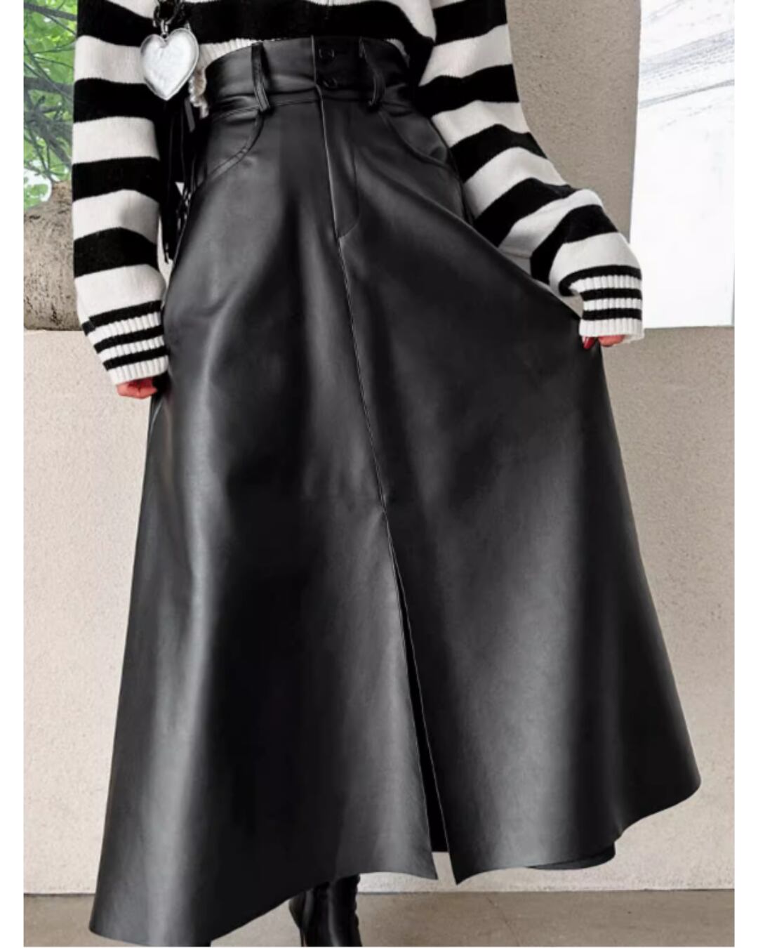 High Waist Fake Leather Center Slit Long Skirt S00094