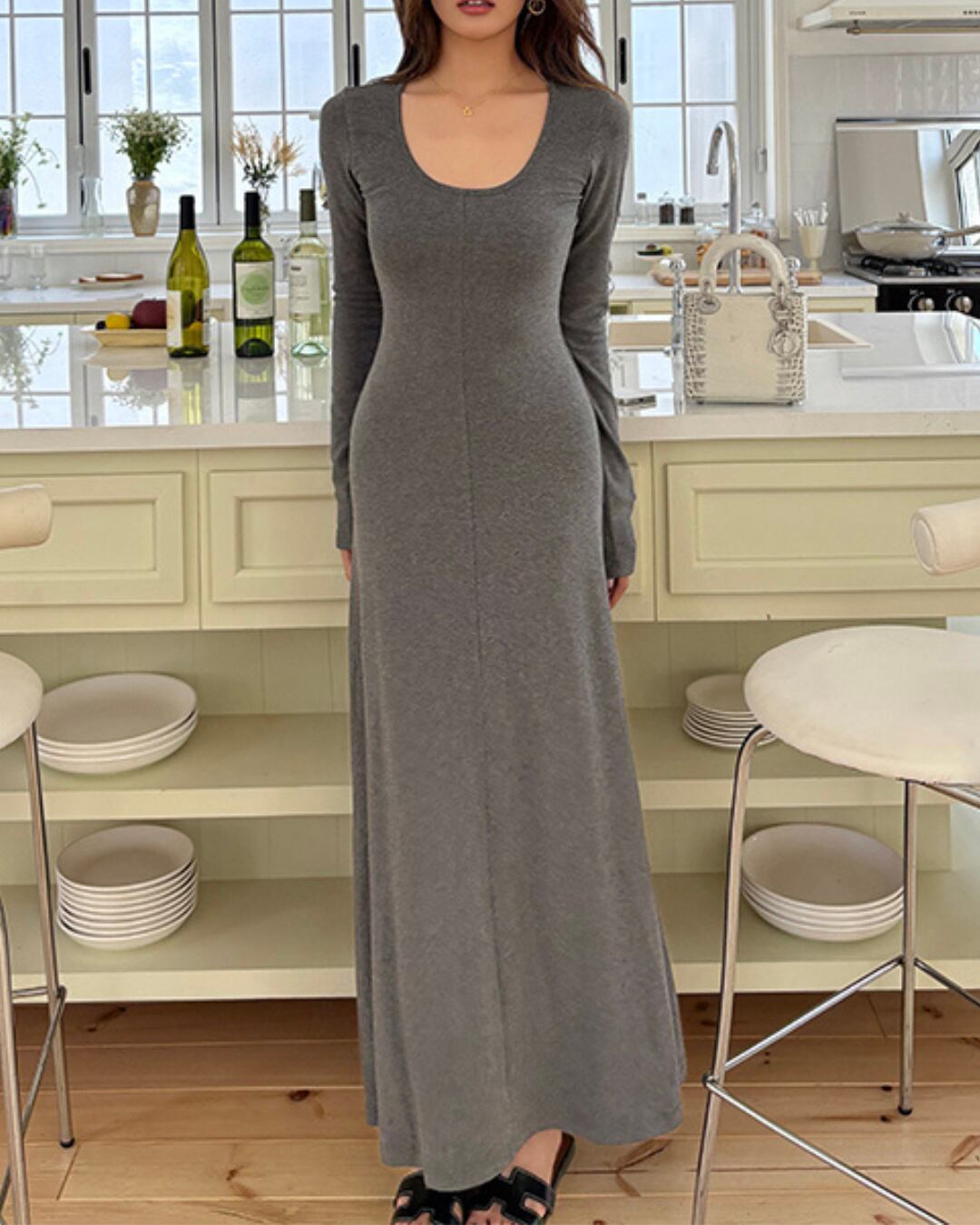 深めのネックラインが女性らしさを引き立て、ロング丈が上品な印象を与えます。