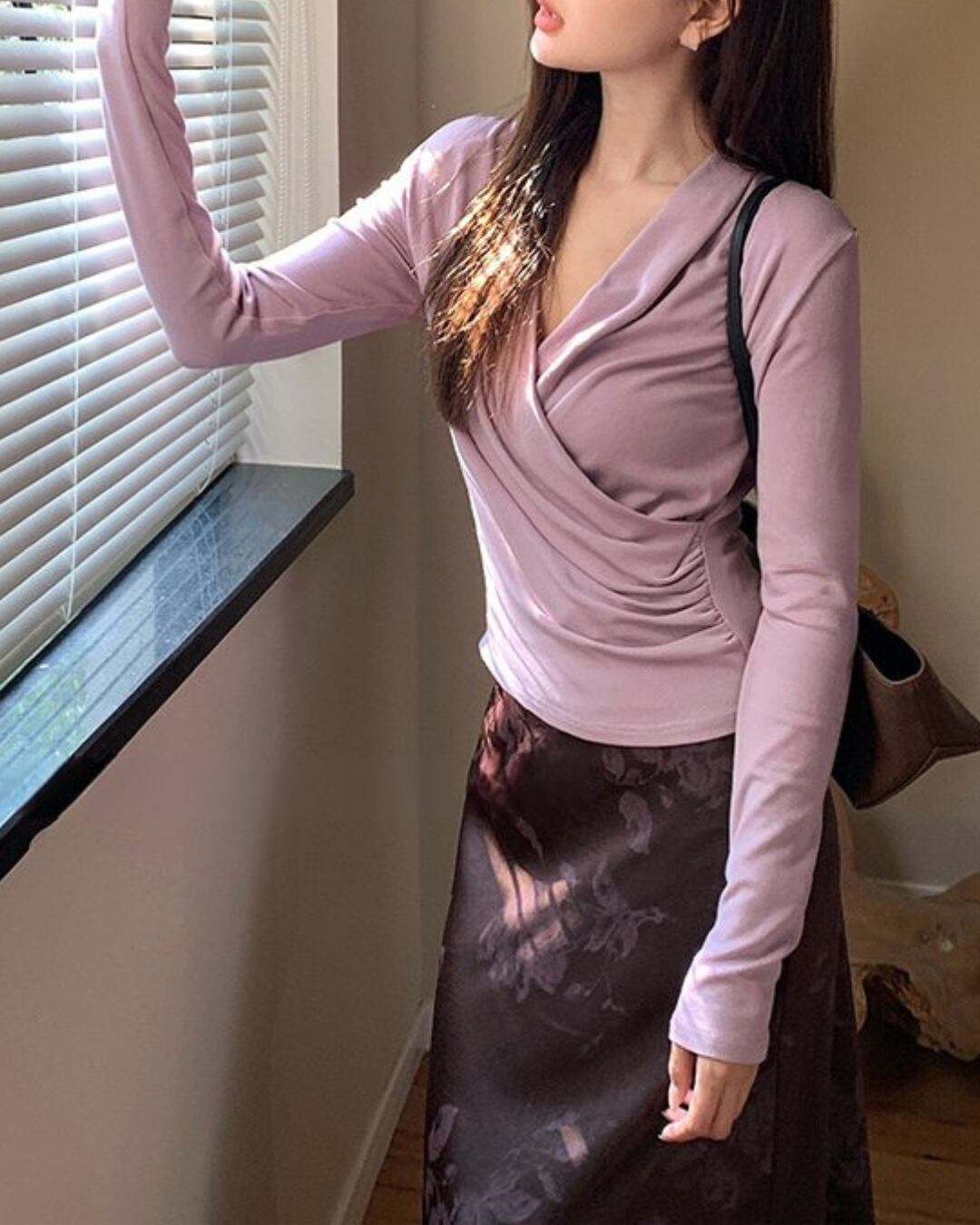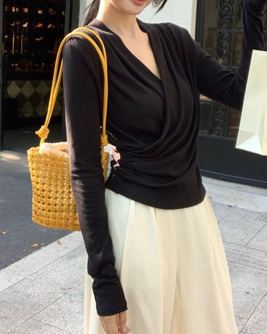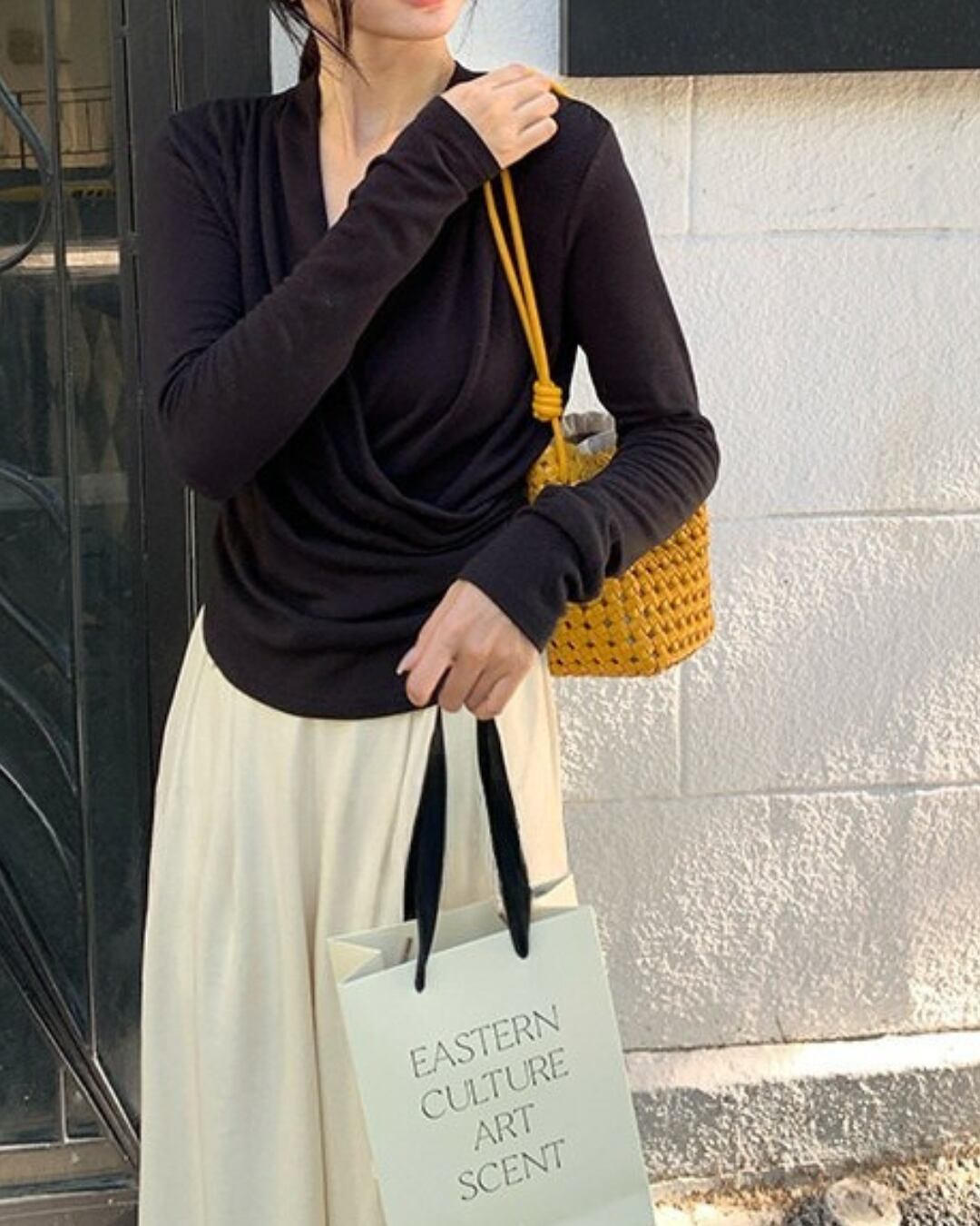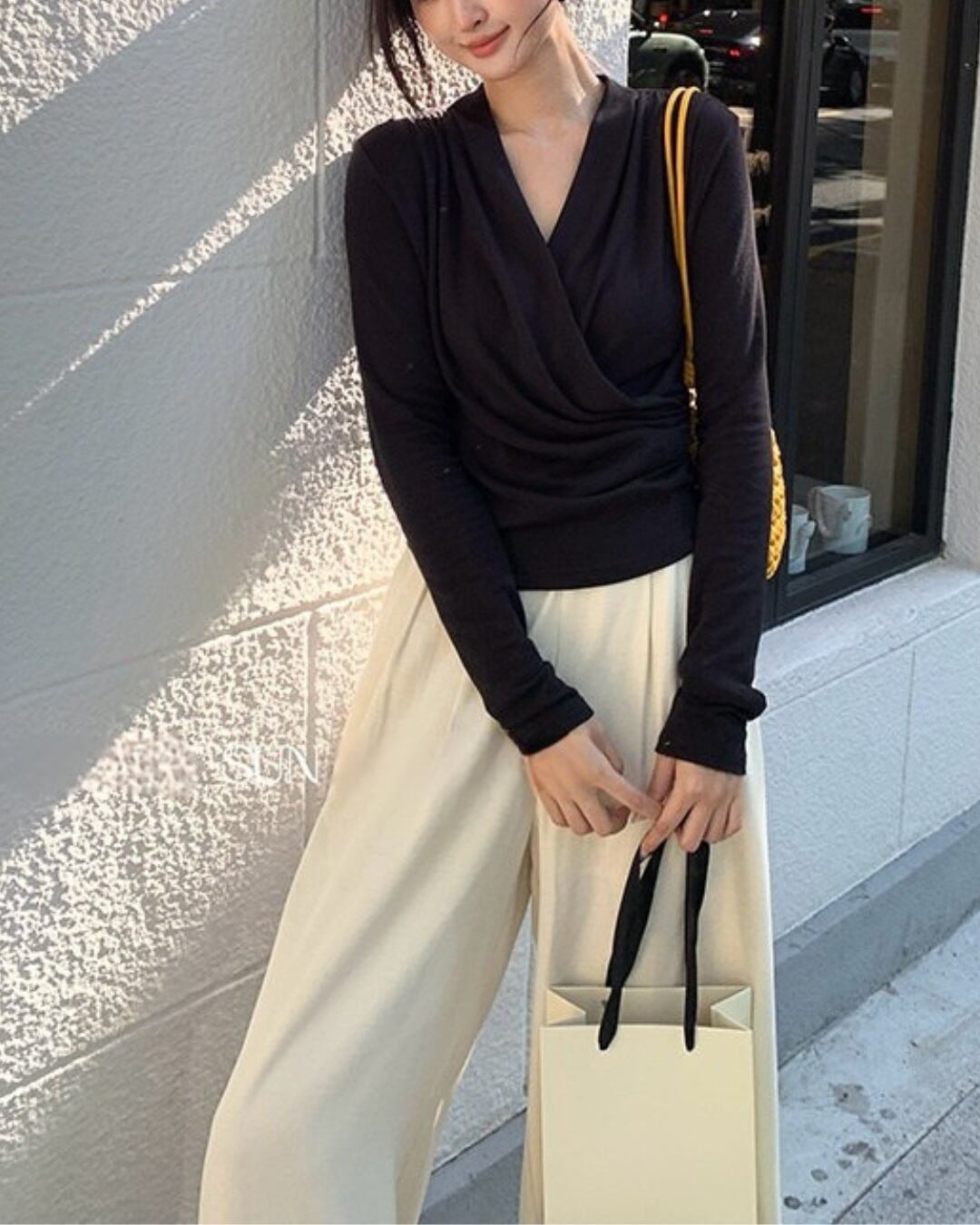 V-neck Tight Silhouette Long Sleeve Knit Top S00123