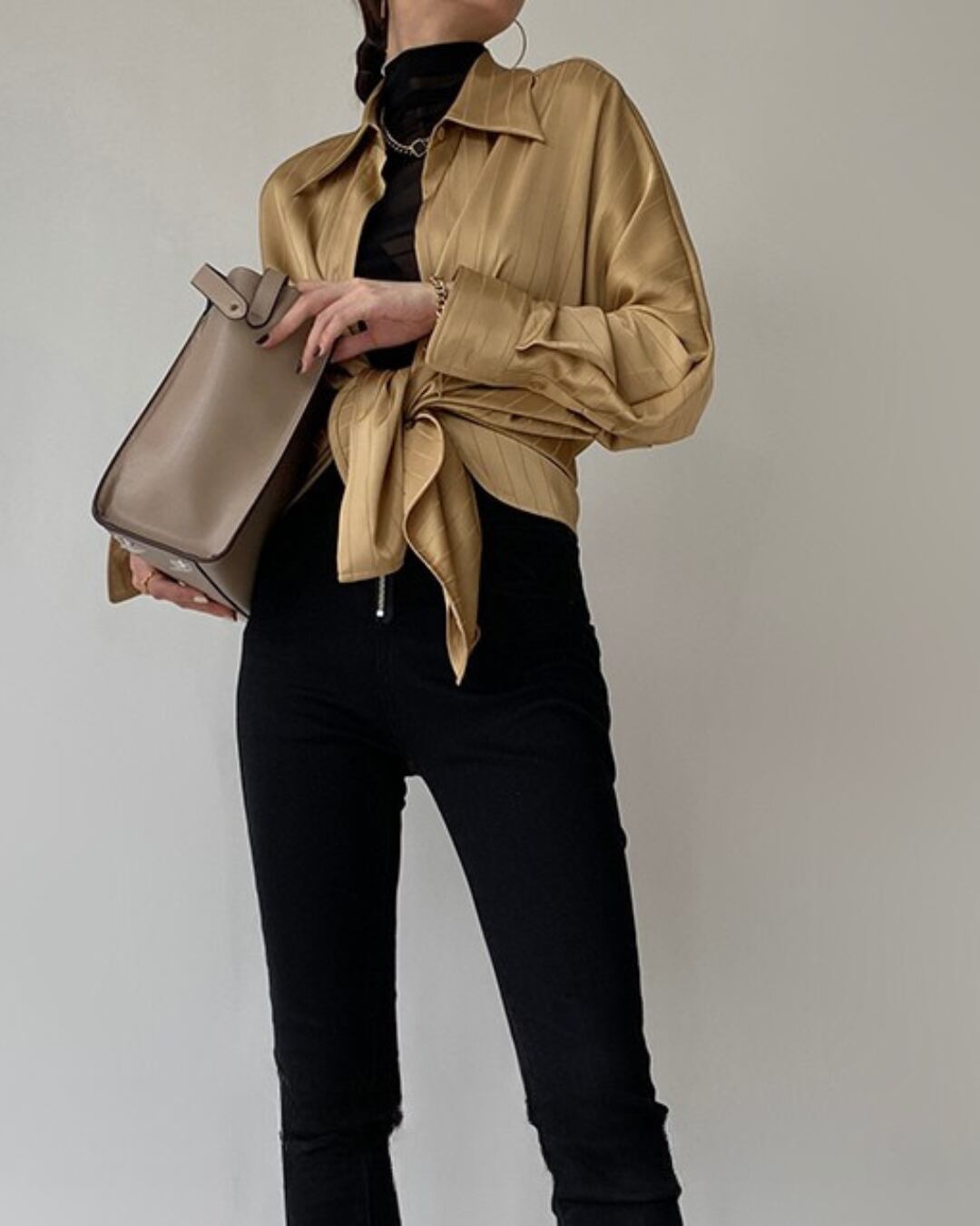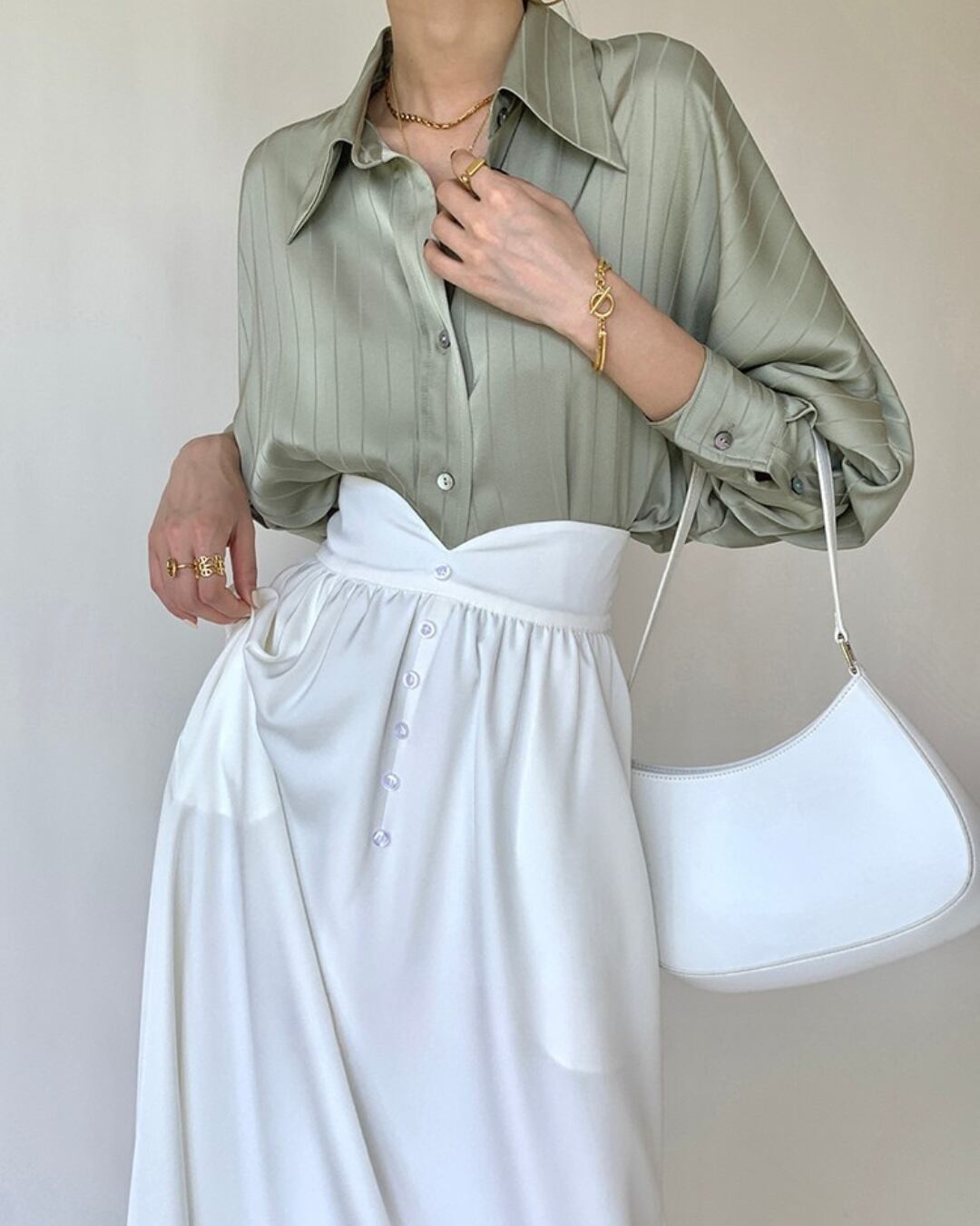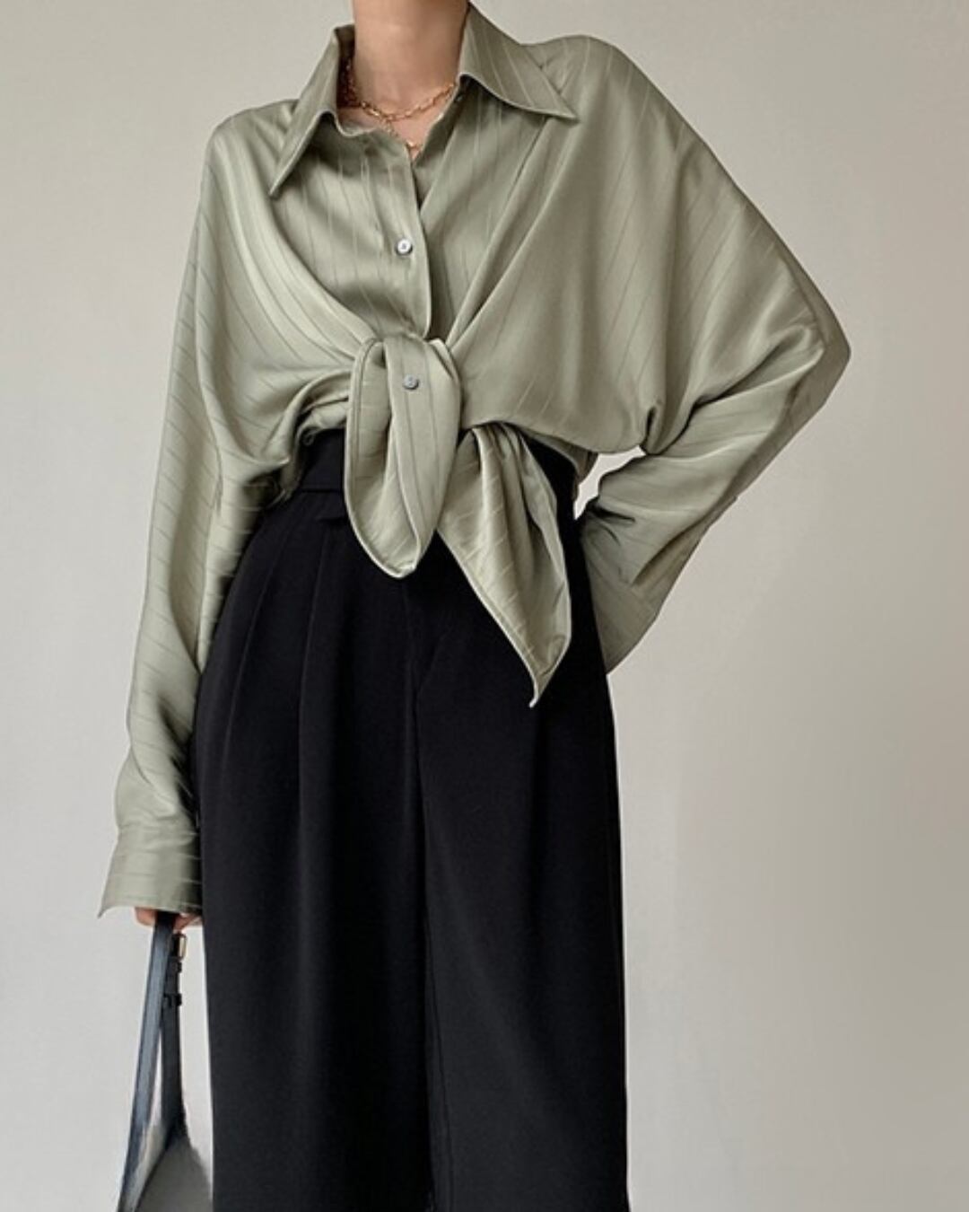 オーバーサイズのシルエットがリラックス感を演出する、サテンストライプシャツ。