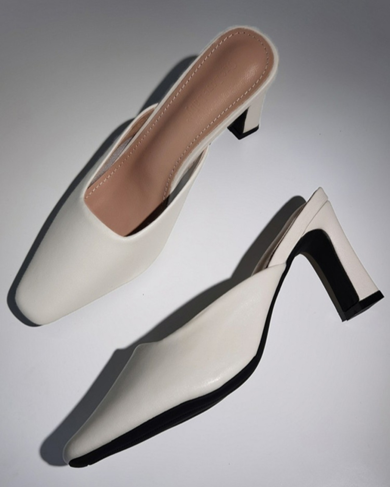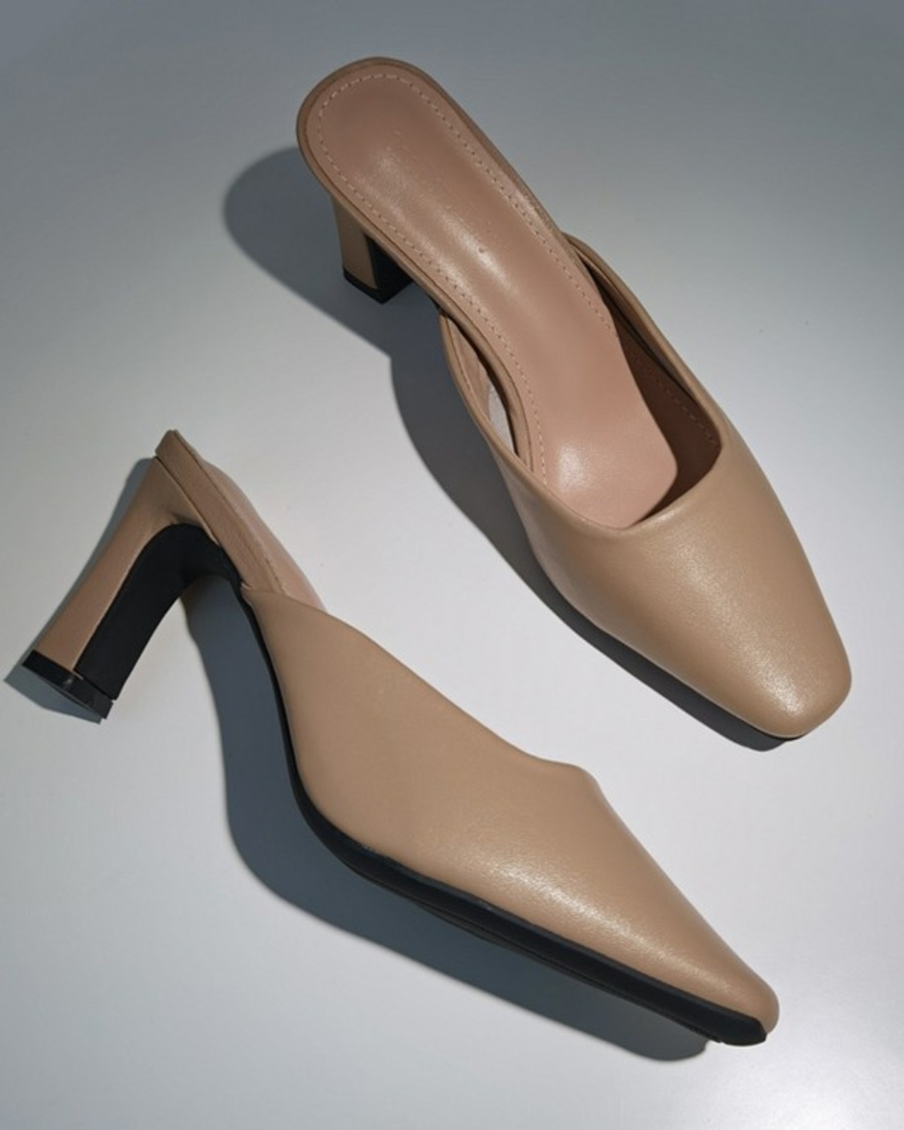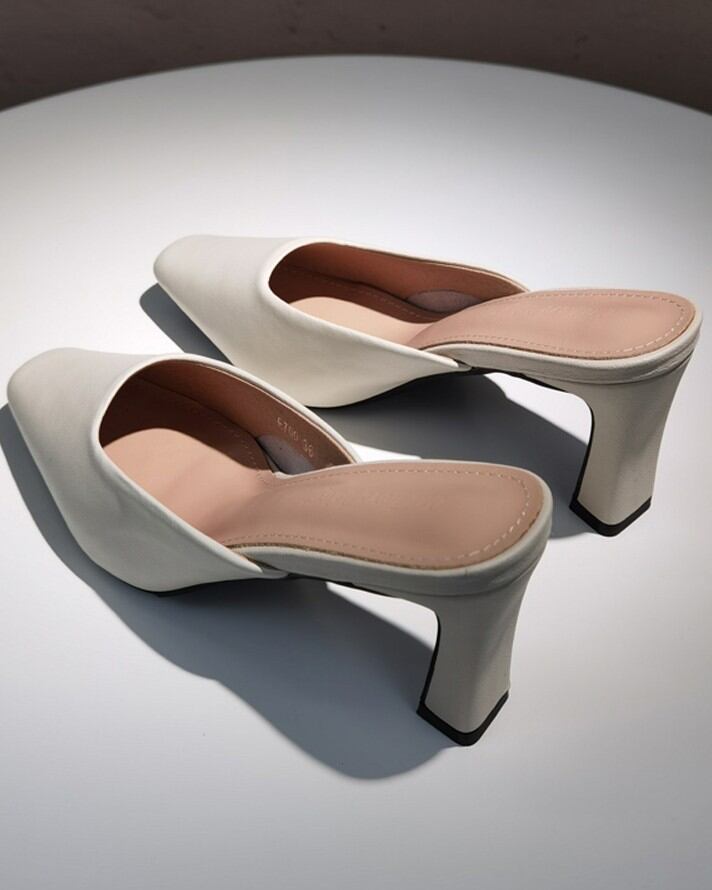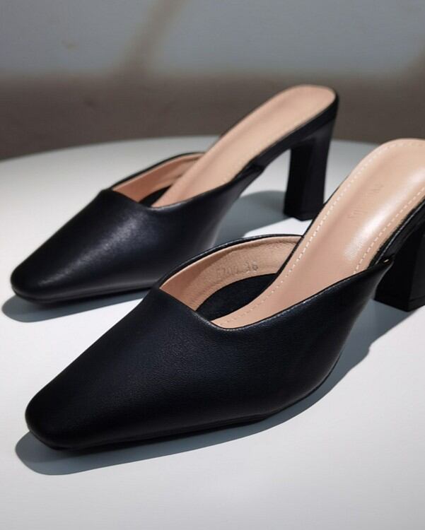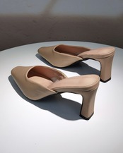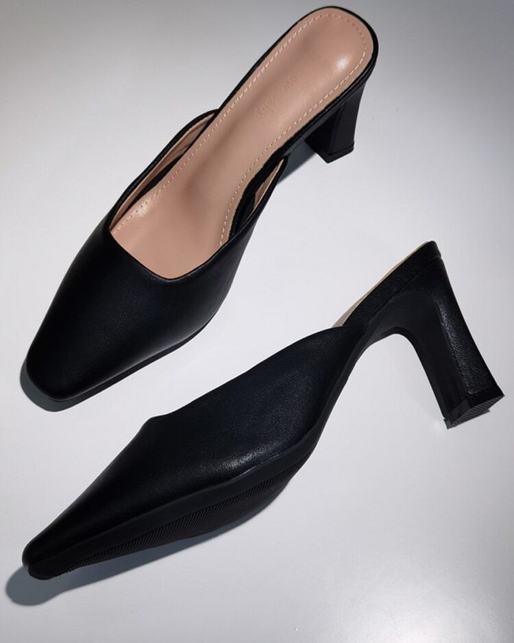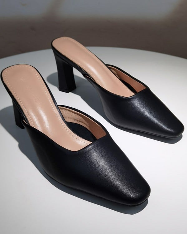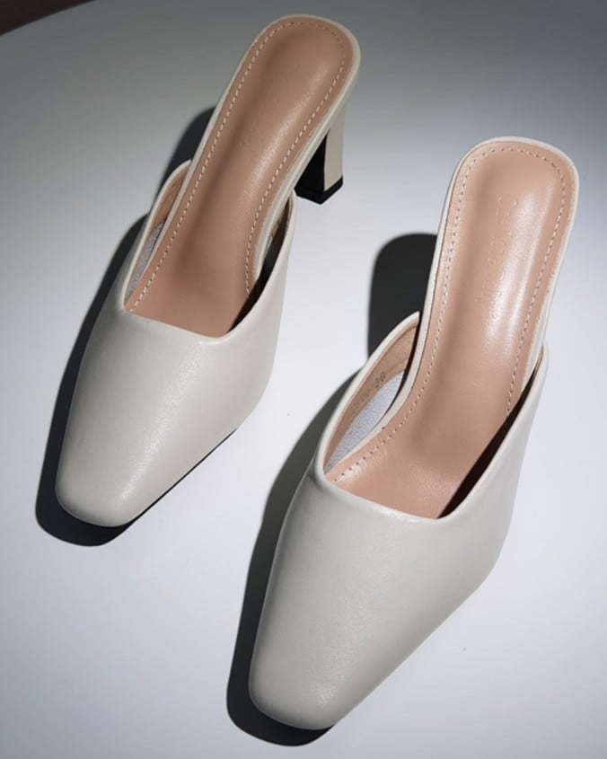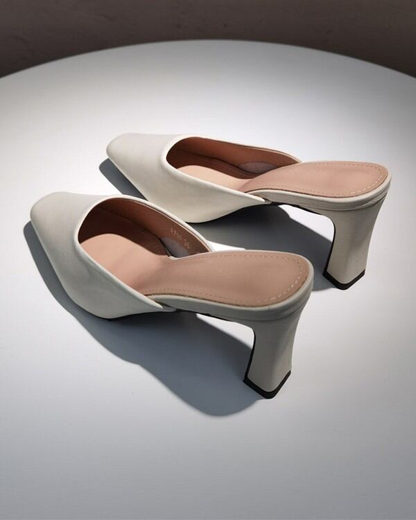 スクエアトゥと上品なヒールが洗練された印象を与えるミュール。