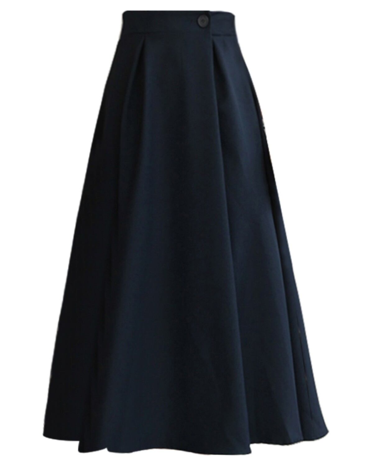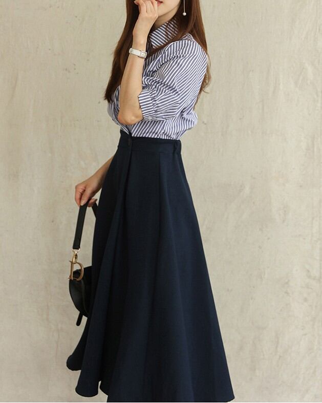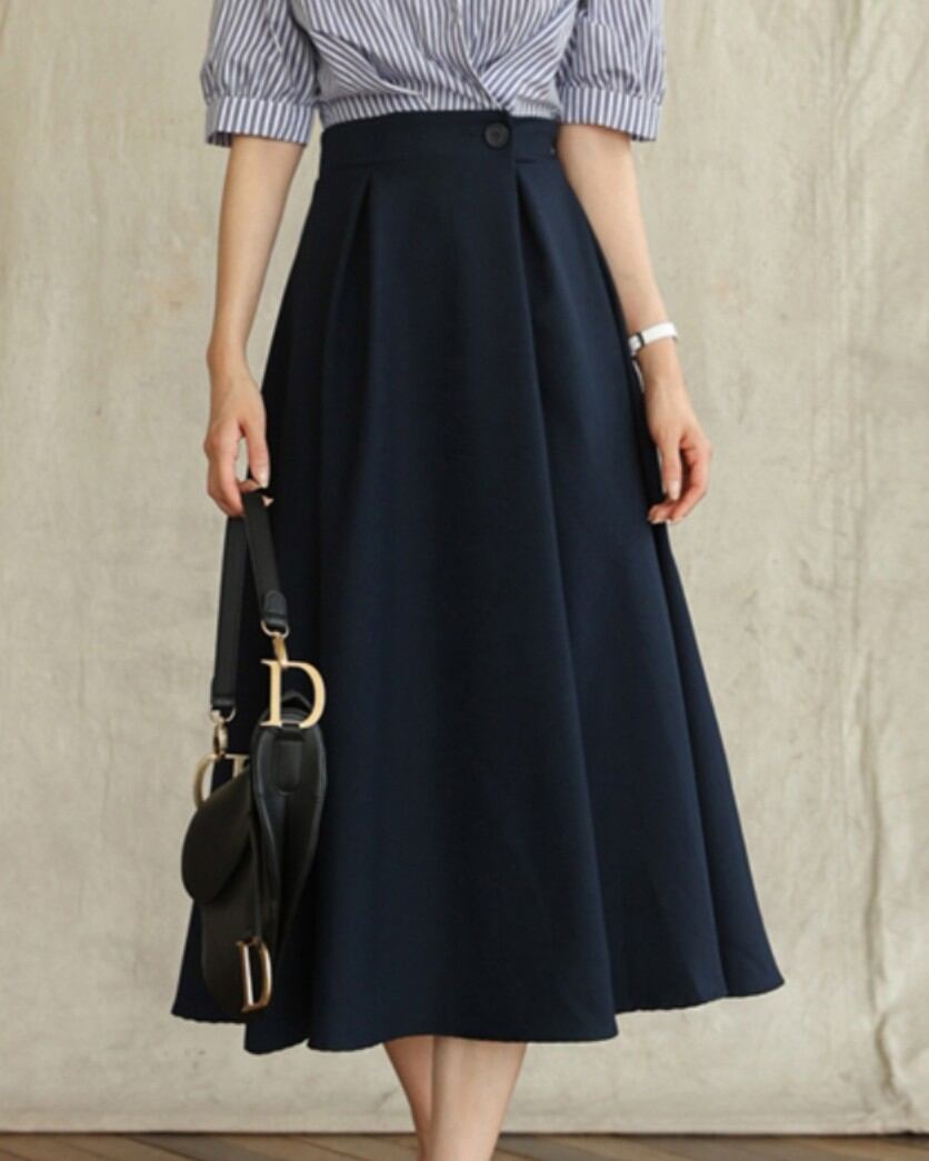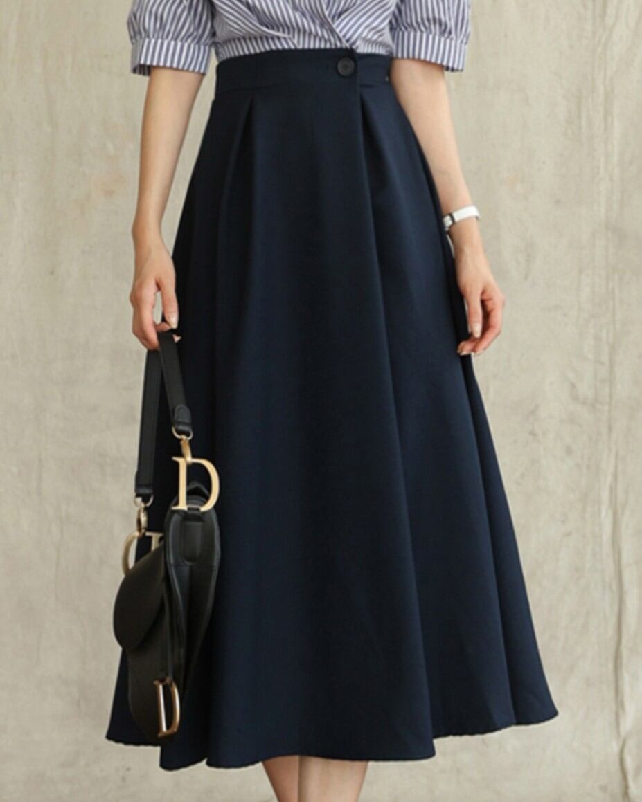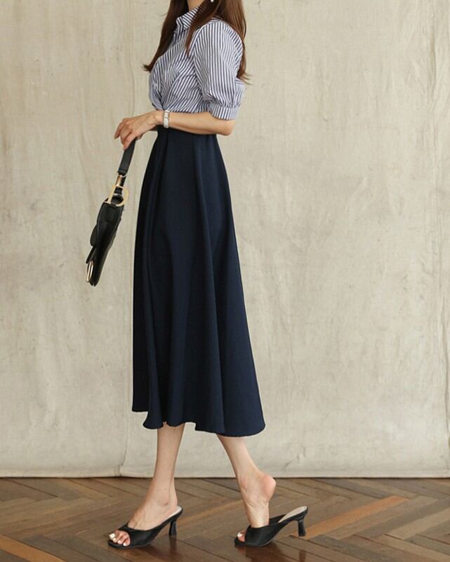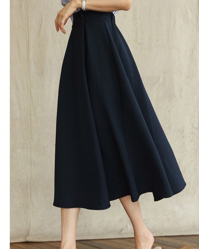 フロントボタンとハイウエストのデザインが洗練されたミディ丈フレアスカート。