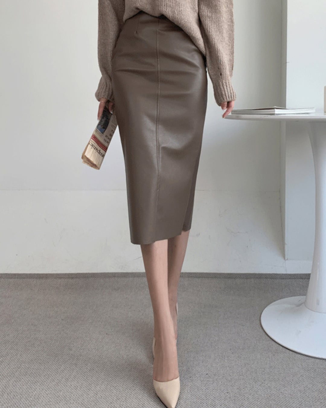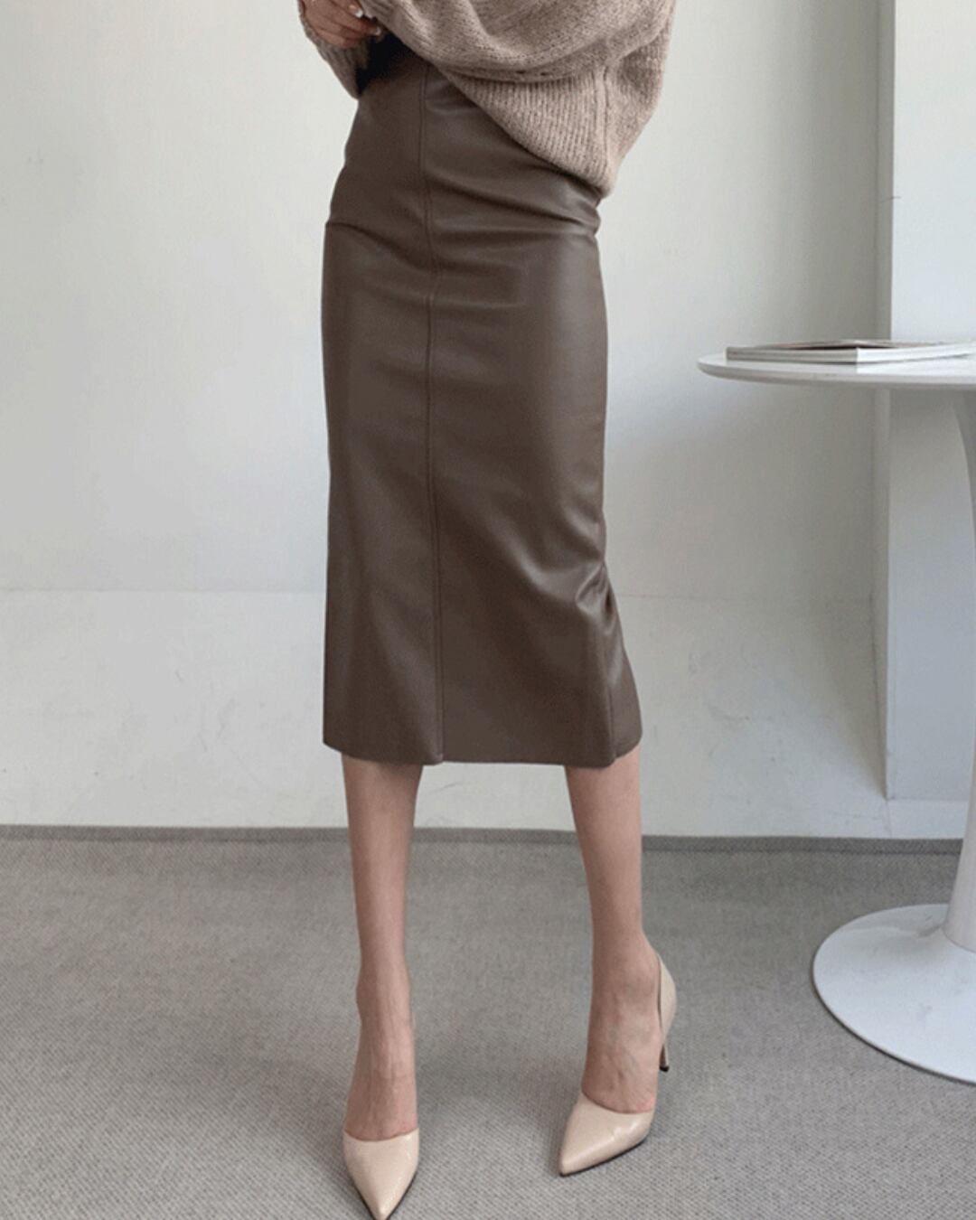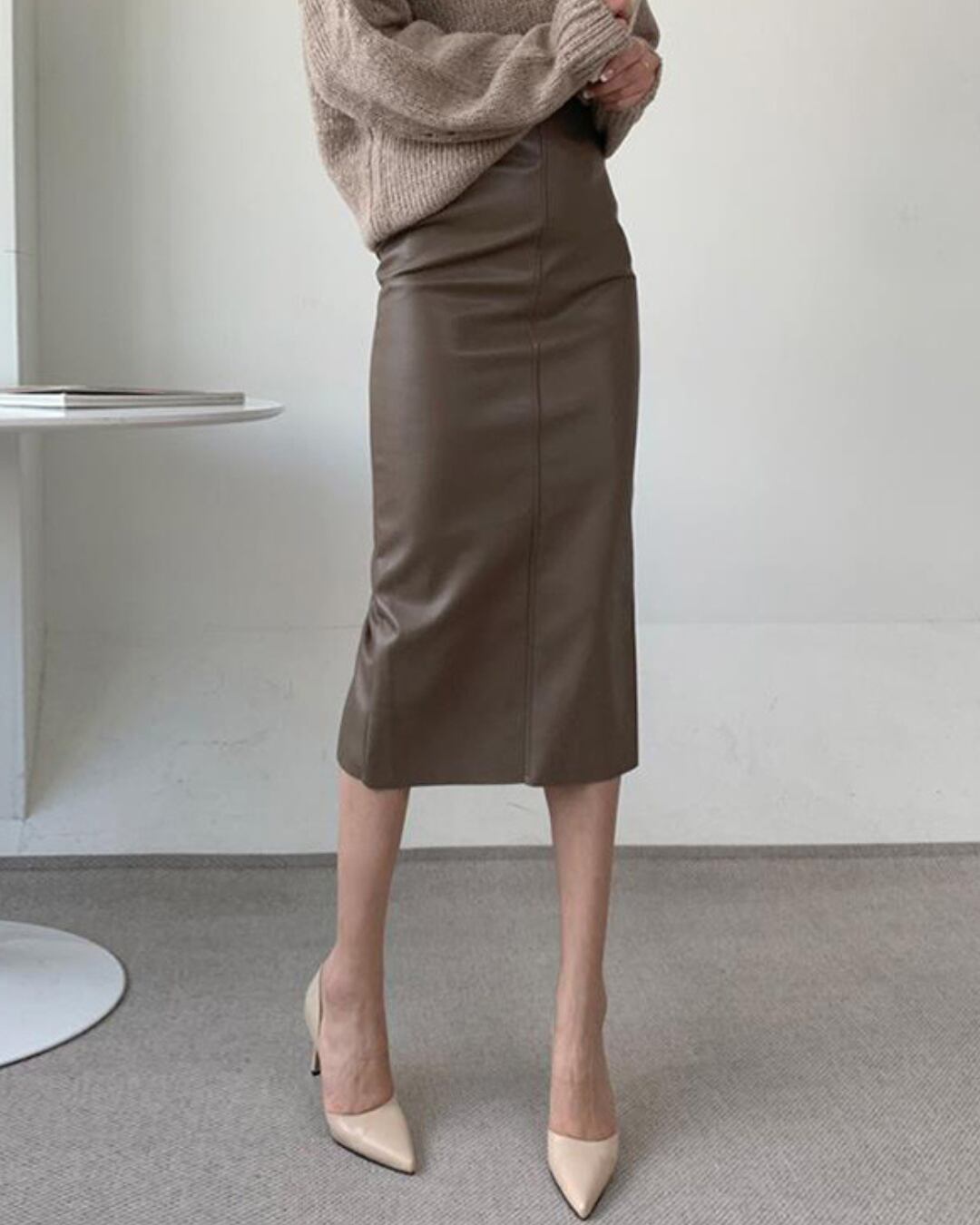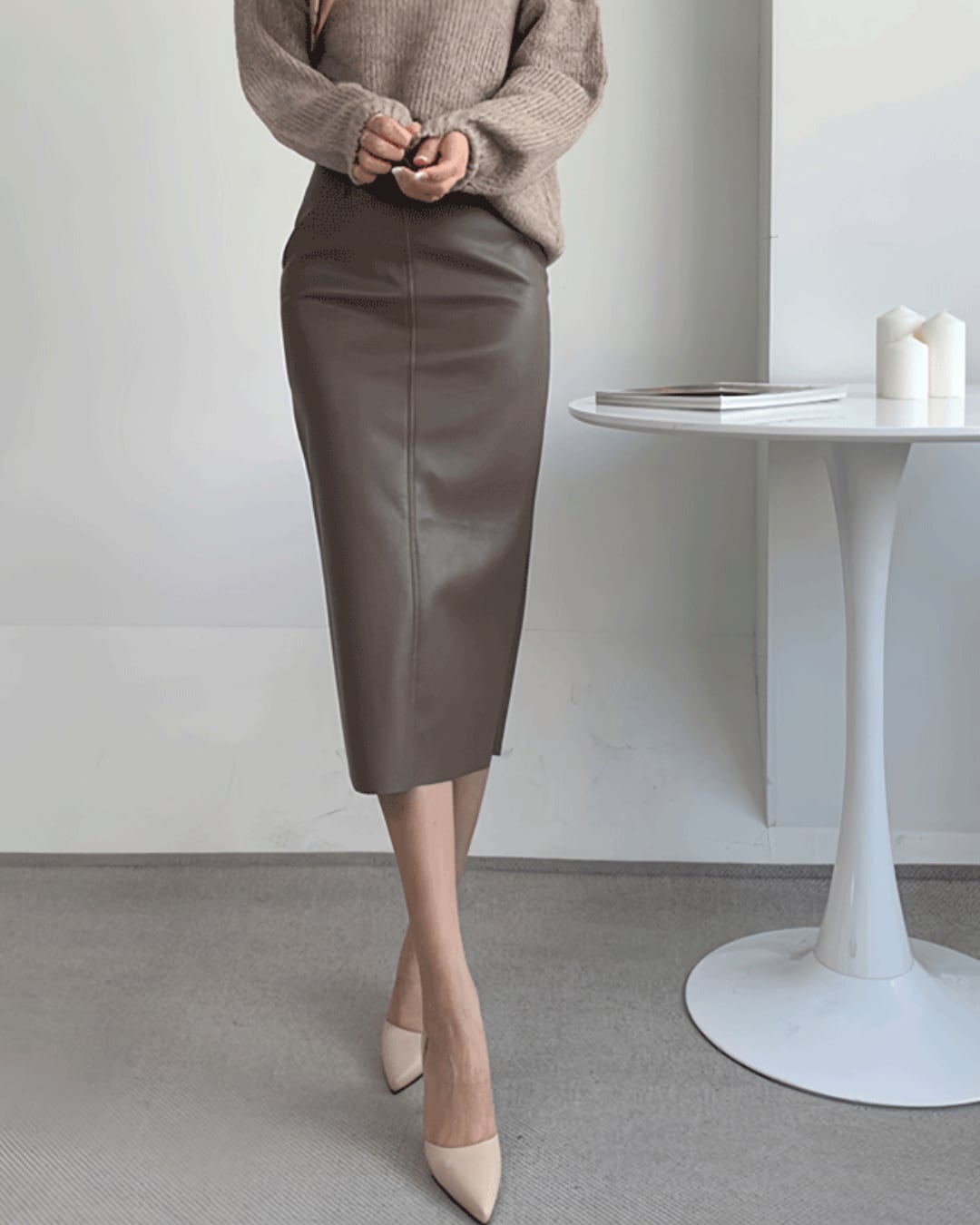 High-Waist Pencil Skirt Leather Material Midi-Length S00522