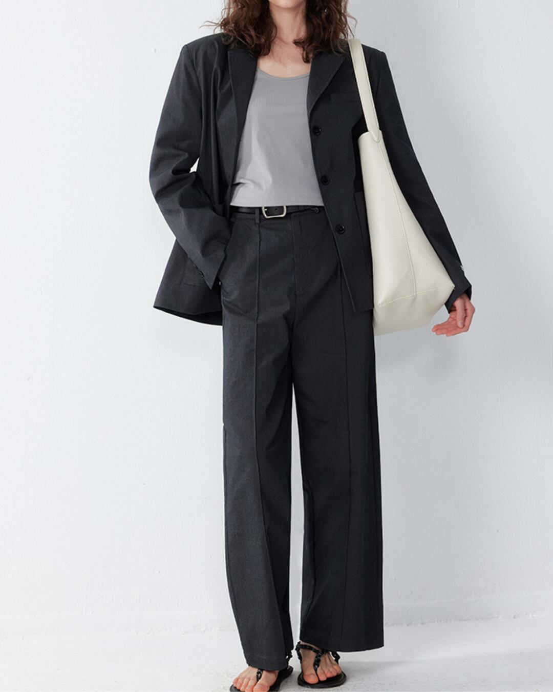 エレガントなスタイルを演出するセンタープレスワイドレッグハイウエストパンツ。