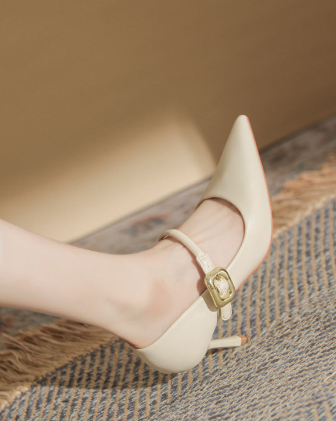 上品なバックルストラップがアクセントになった、ポインテッドトゥピンヒールシューズ。