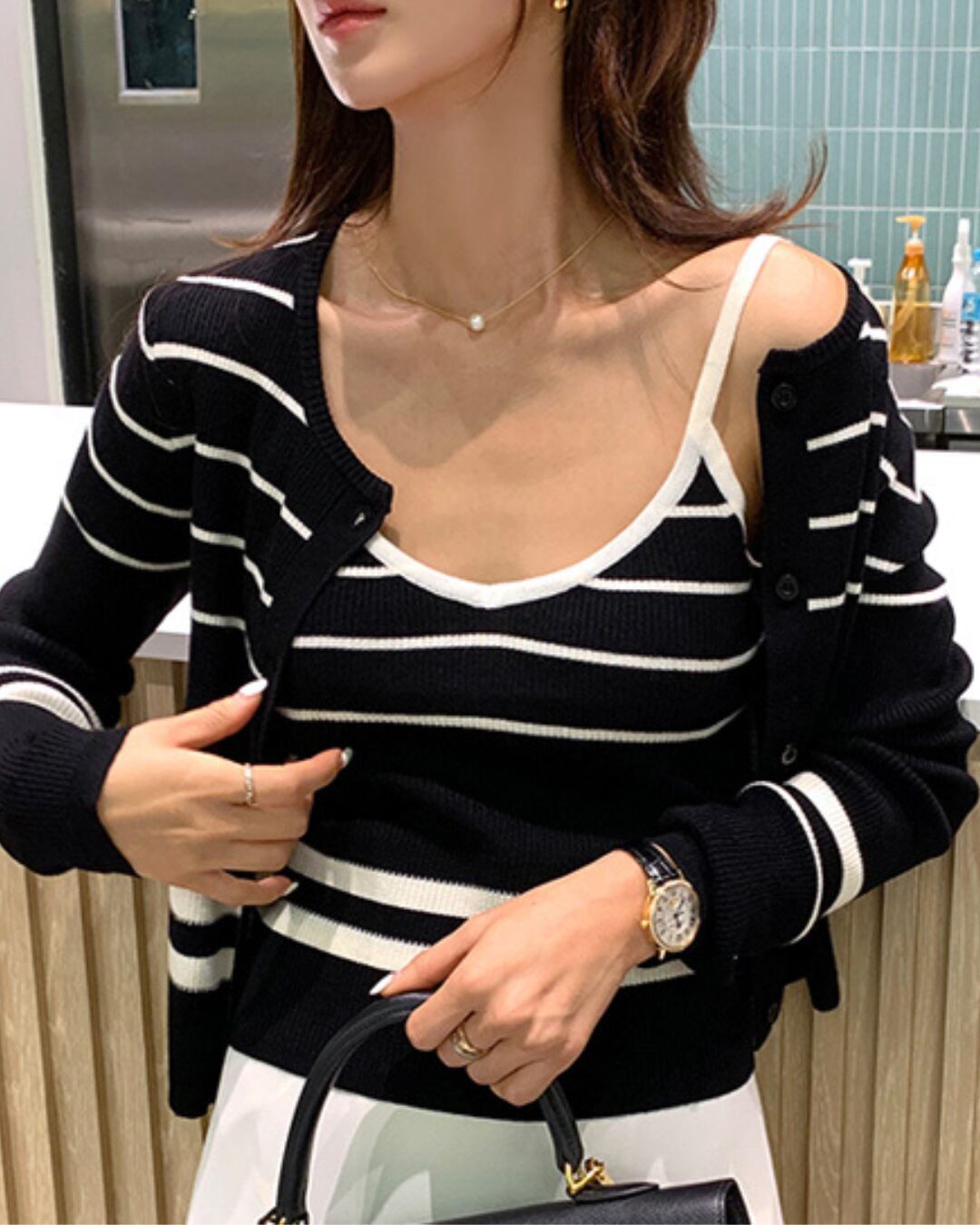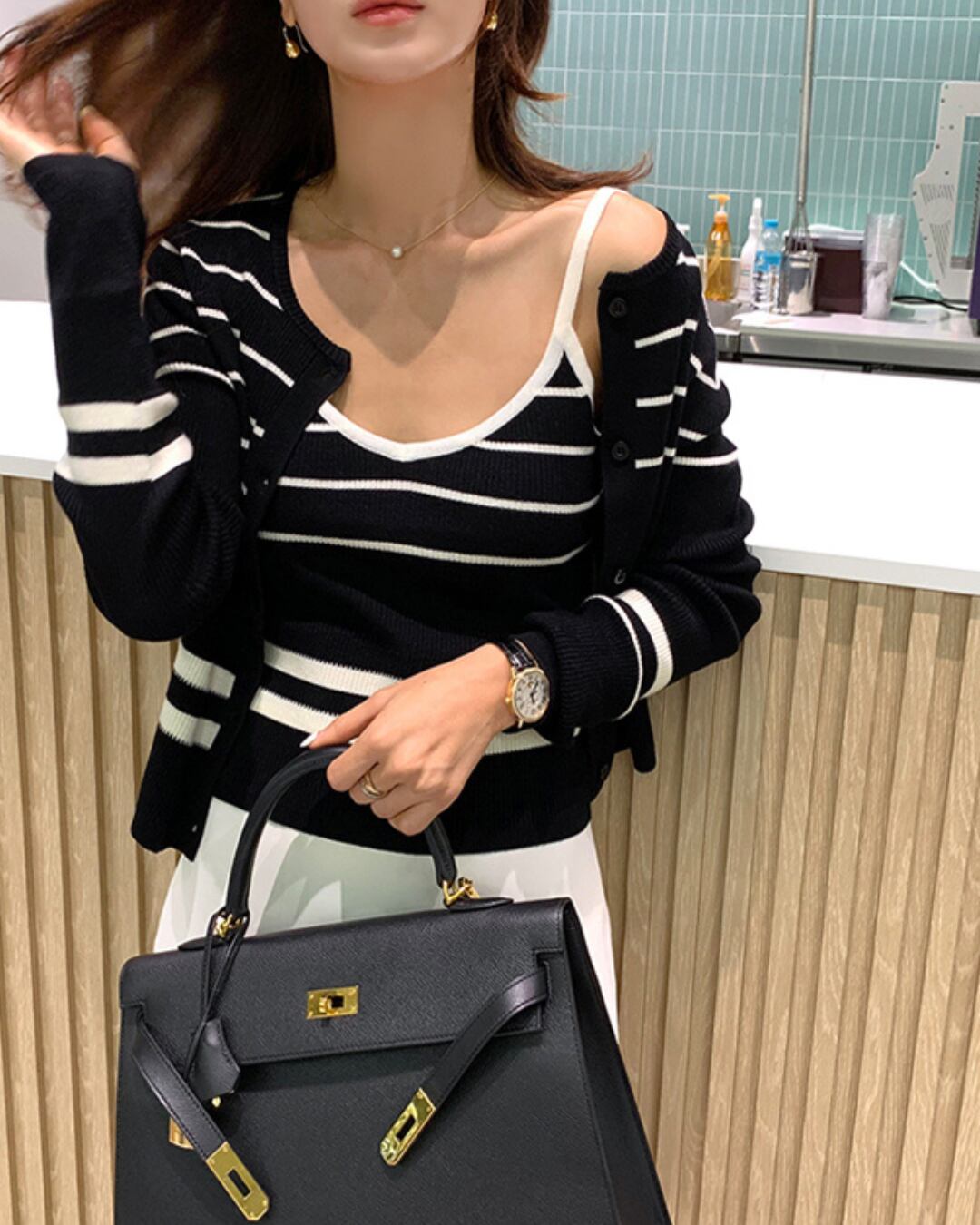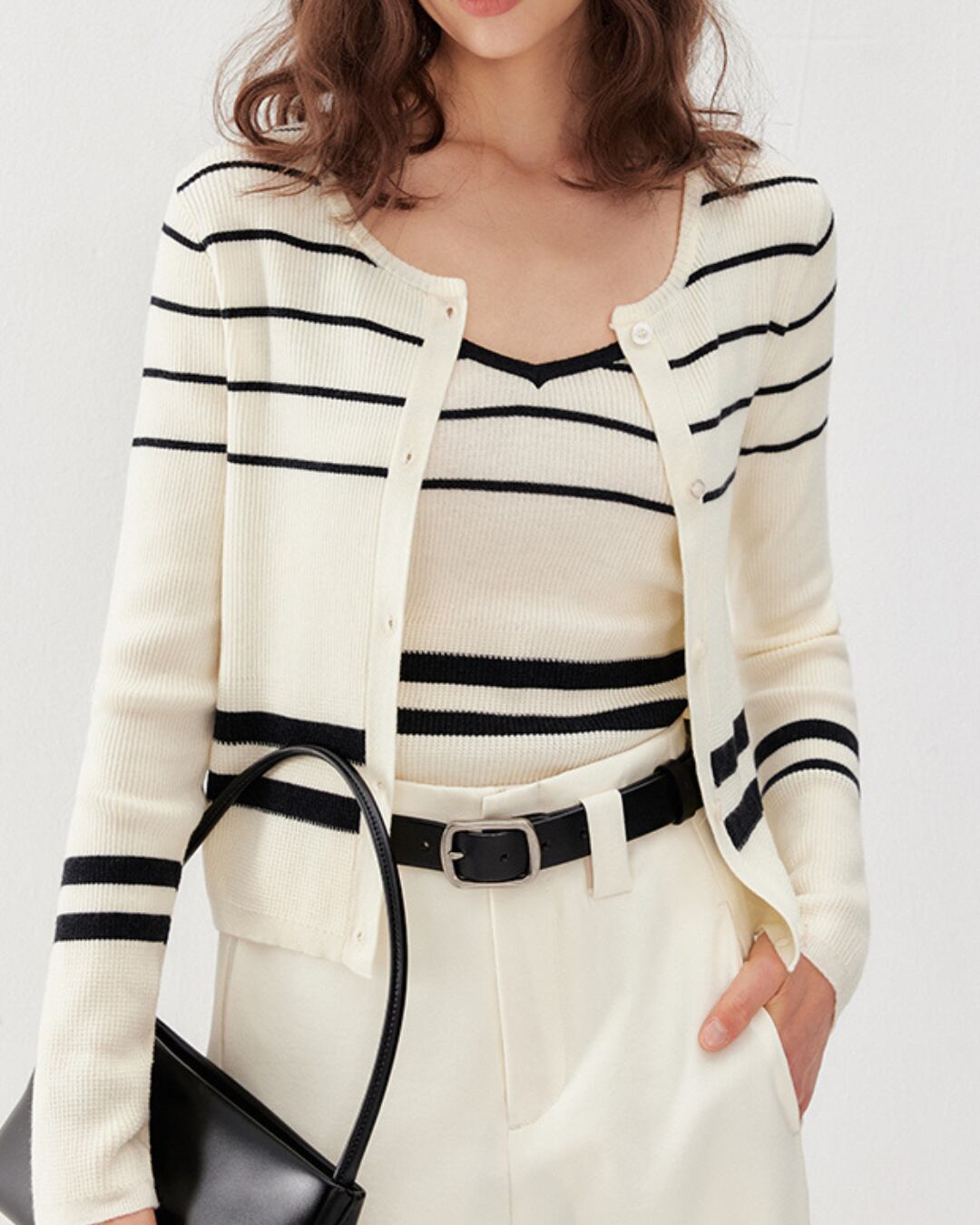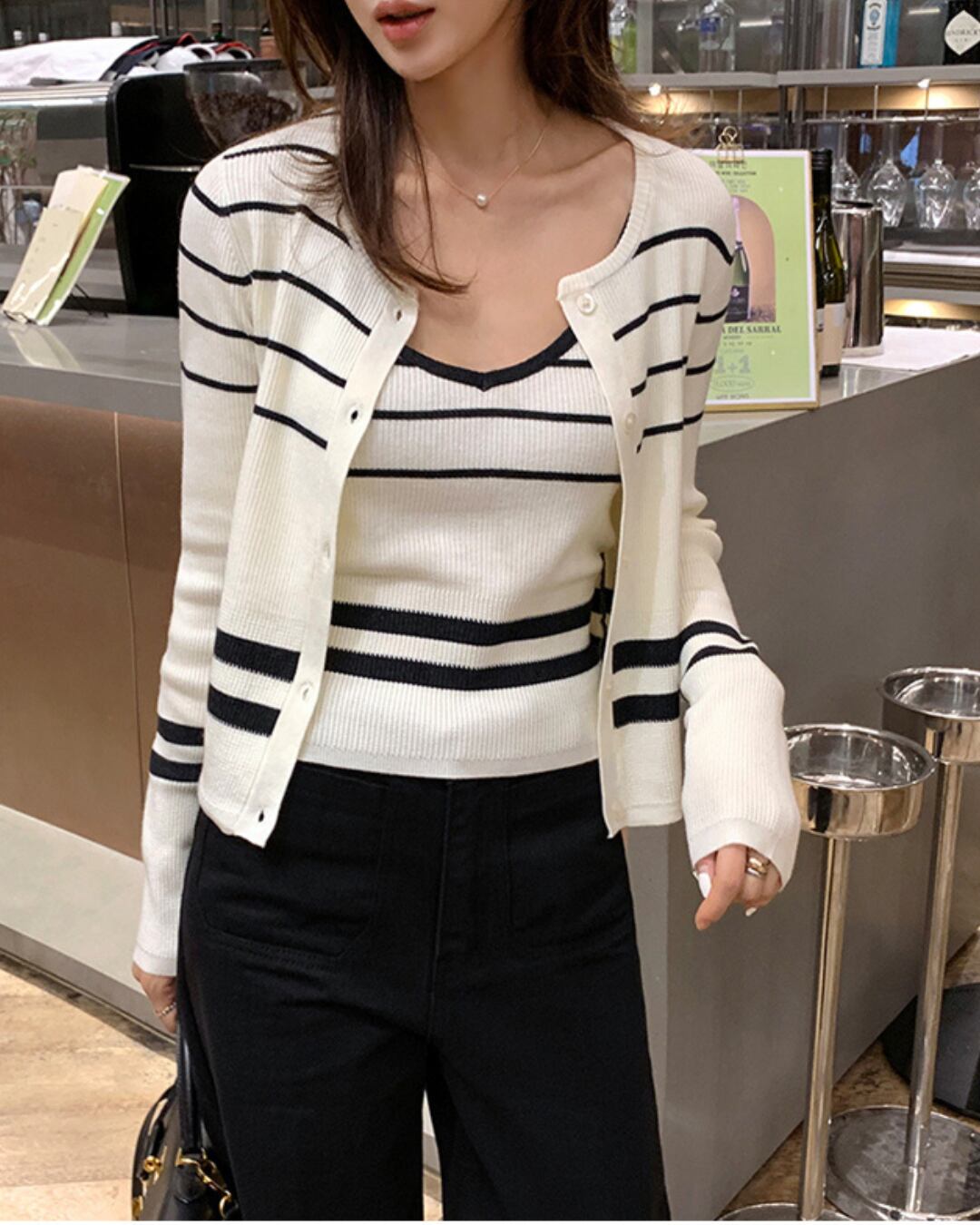 Front Button Closure Striped Compact Length Ribbed Knit Cardigan S00541