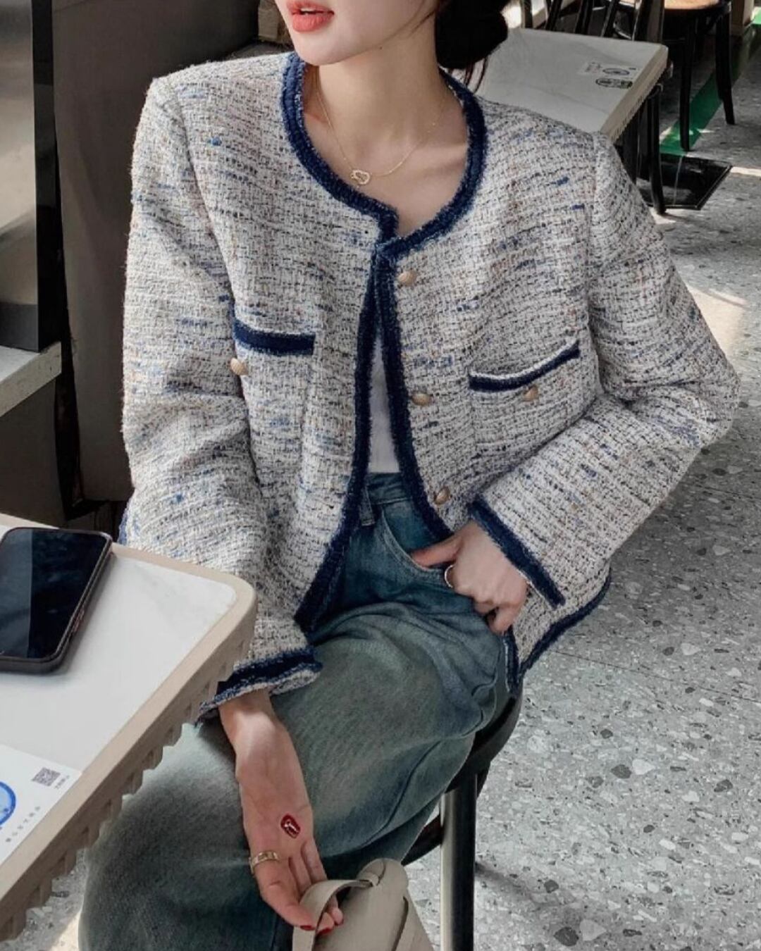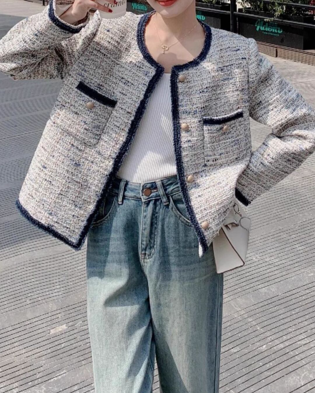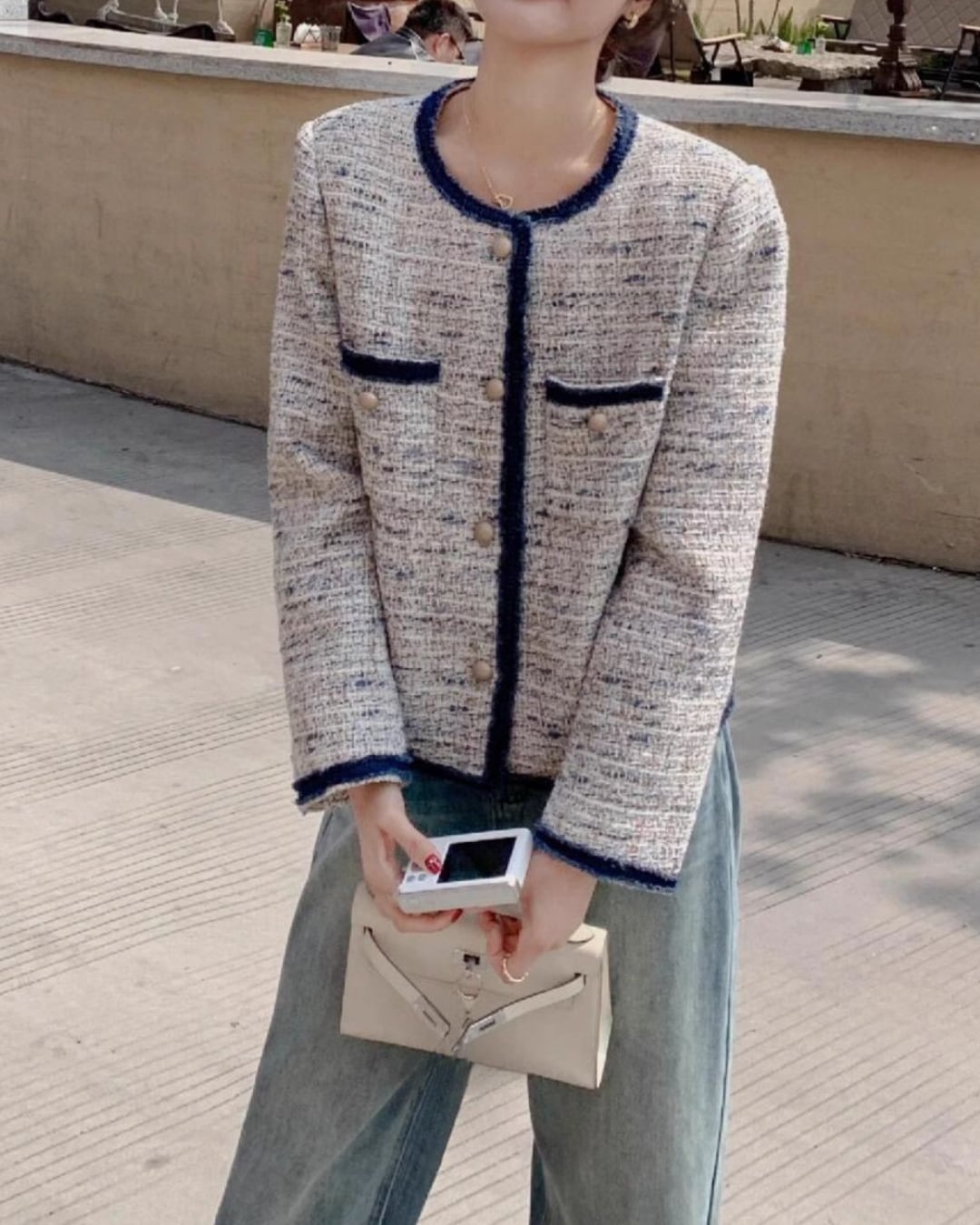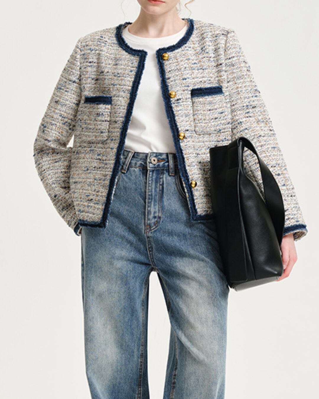 Tweed Material Piping Patch Pocket Long Sleeve Jacket S00004