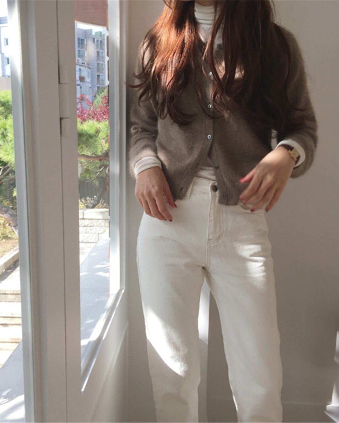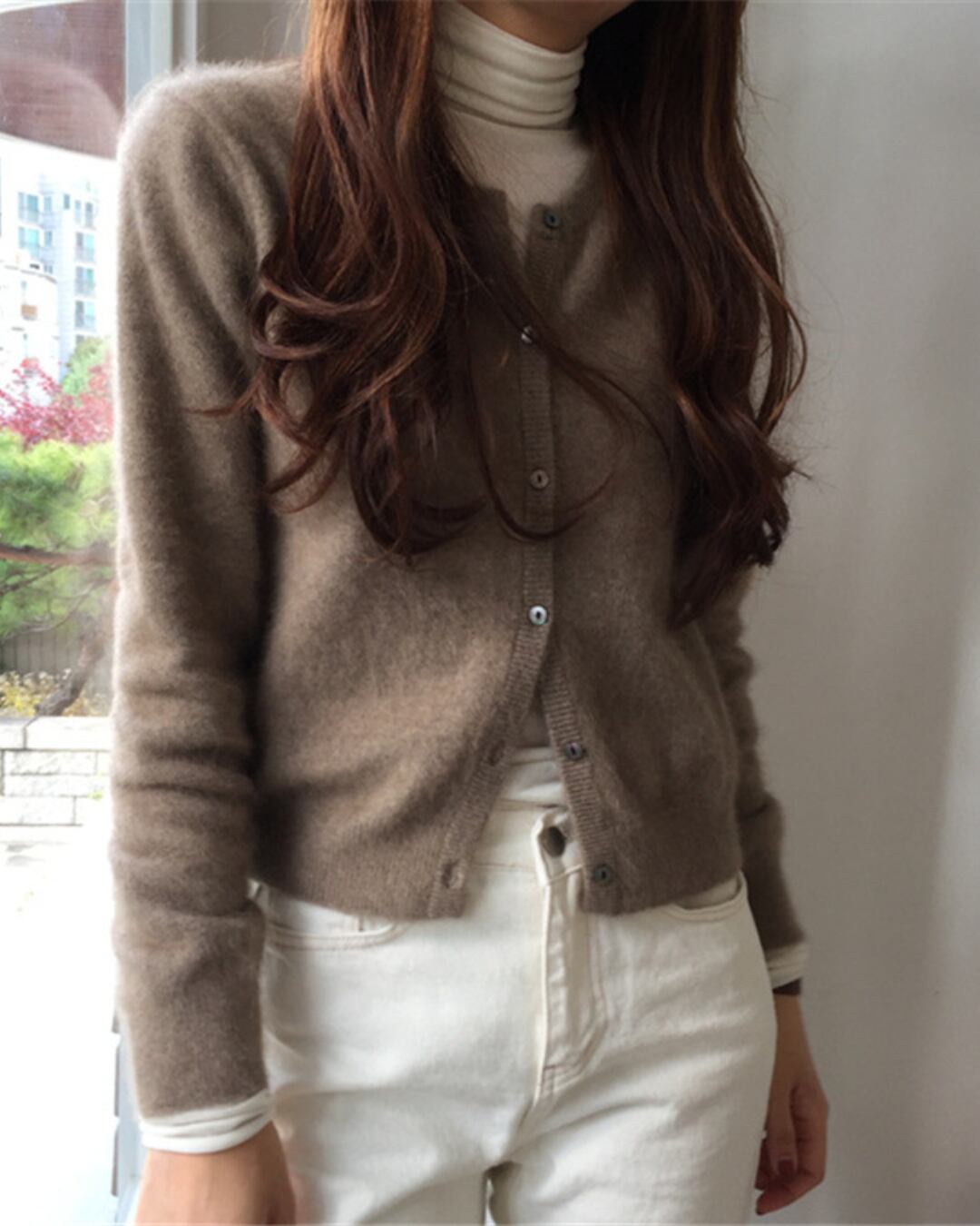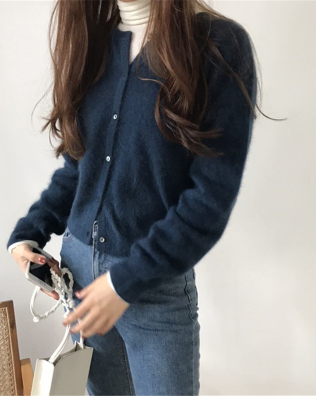 Front Button Crew Neck Rib Knit Simple Cardigan S00557