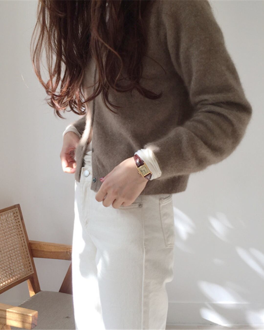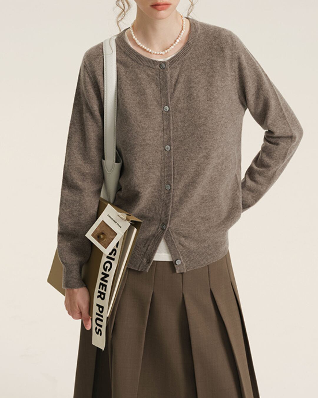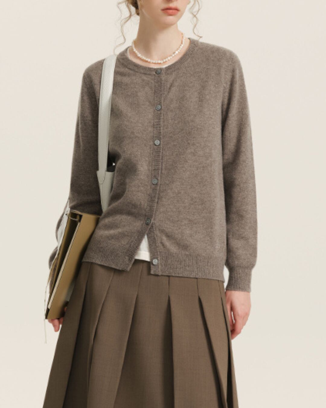 シンプルなクルーネックとフロントボタンが上品な印象を与えるカーディガン。