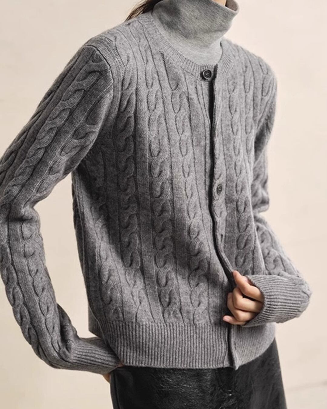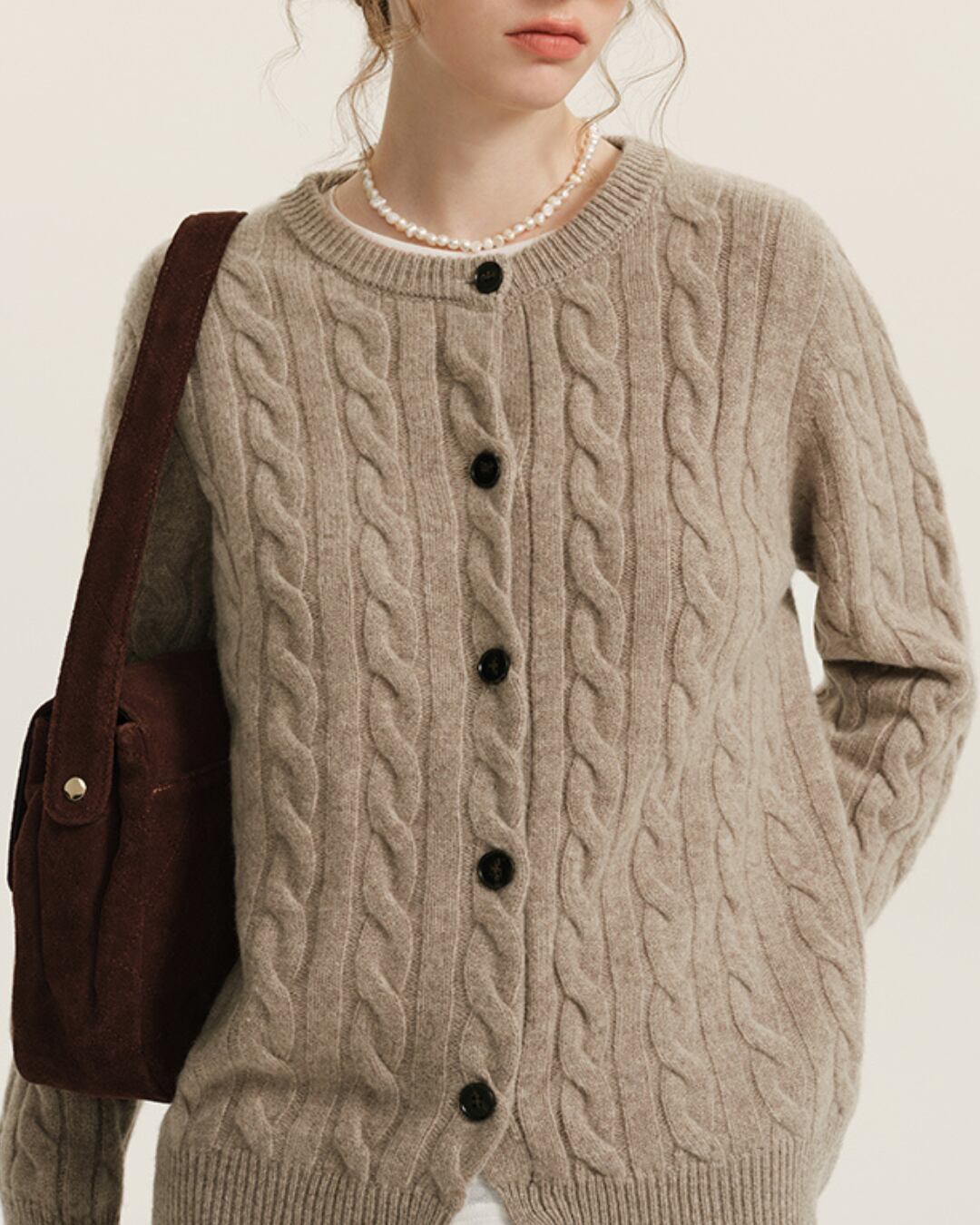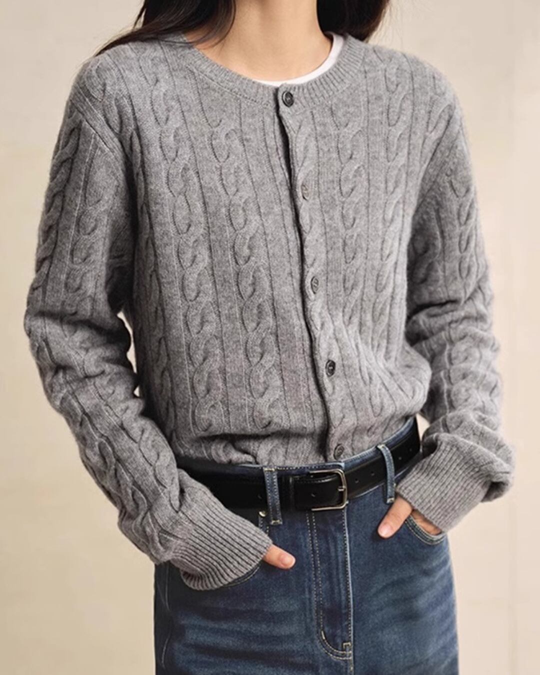 ラウンドネックとケーブル編みが上品なカーディガン。