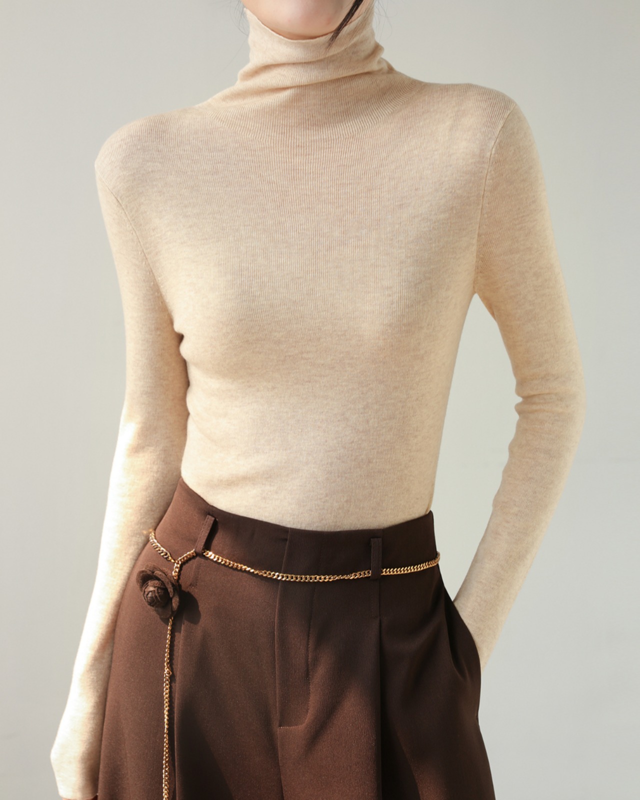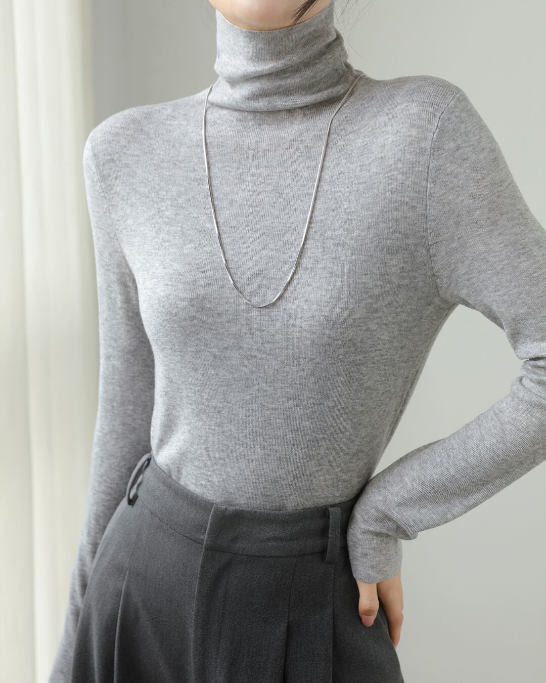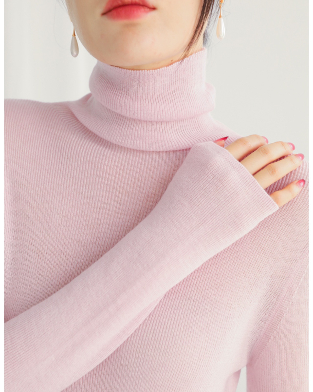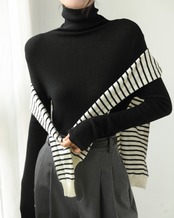 上品なタートルネックが首元を美しく演出するロングスリーブプルオーバー。