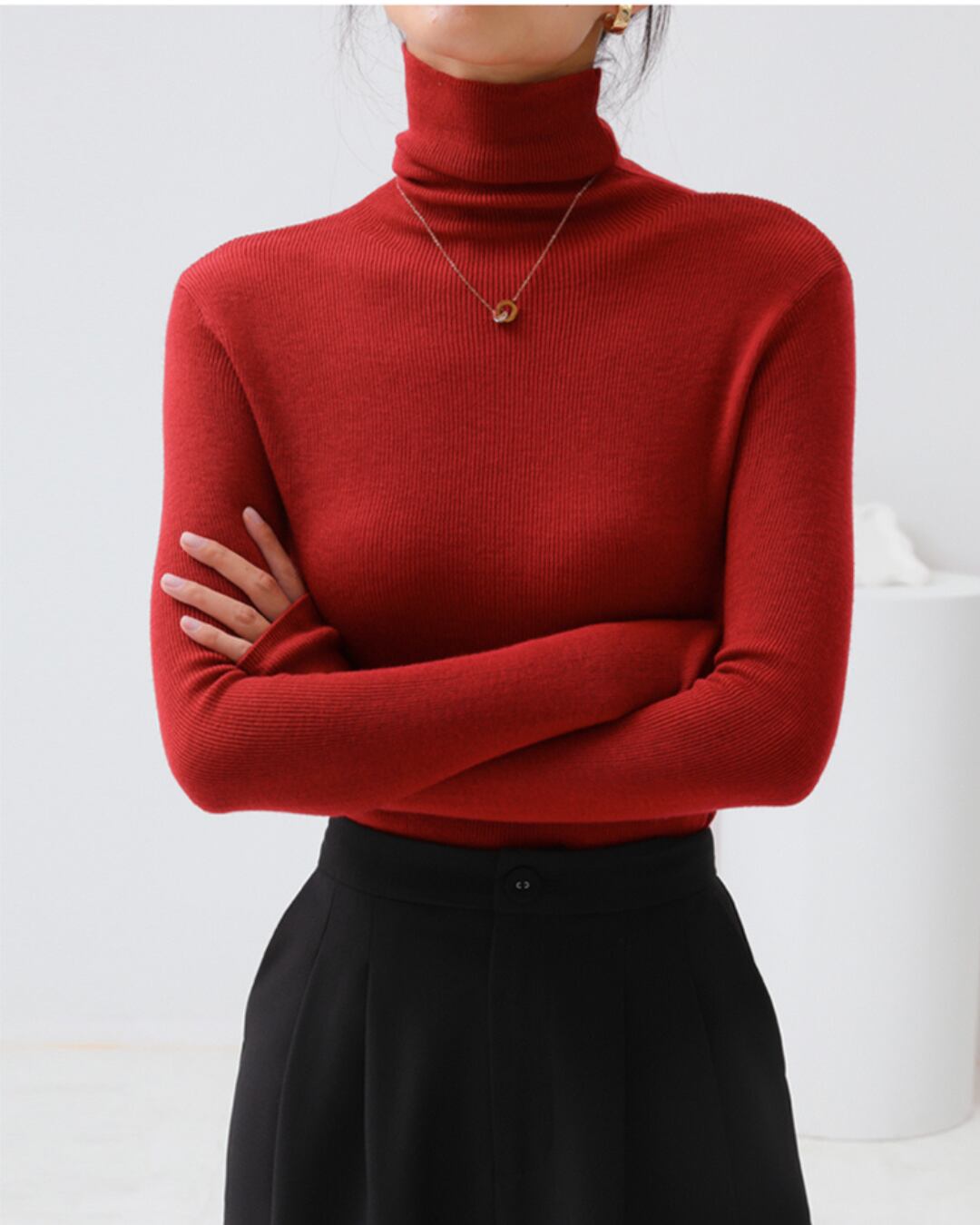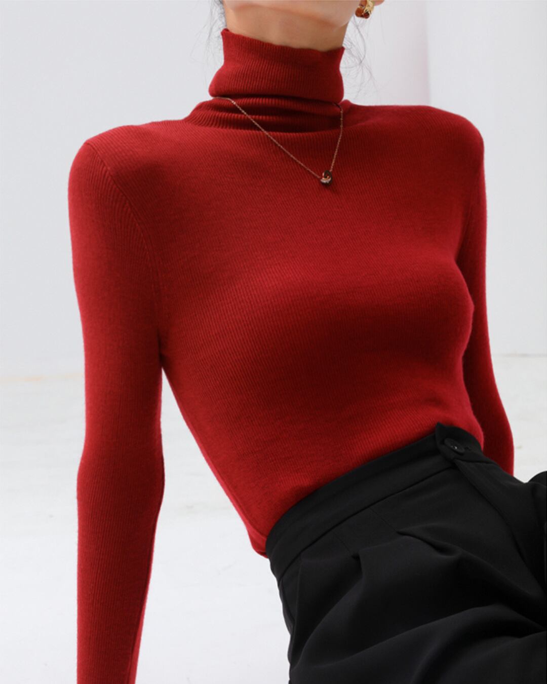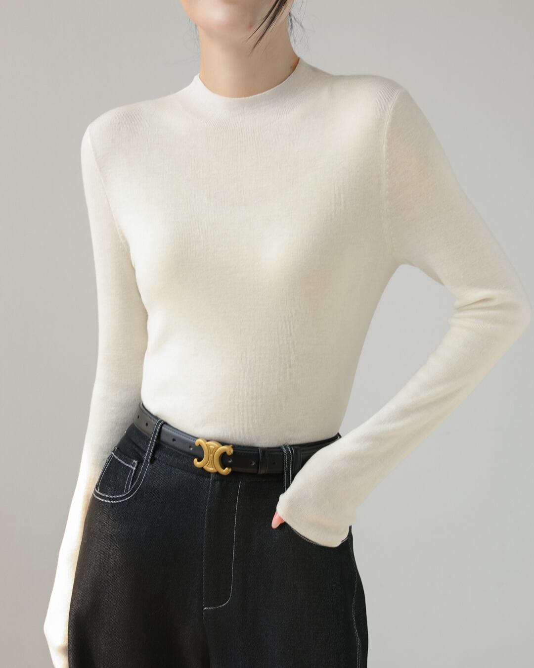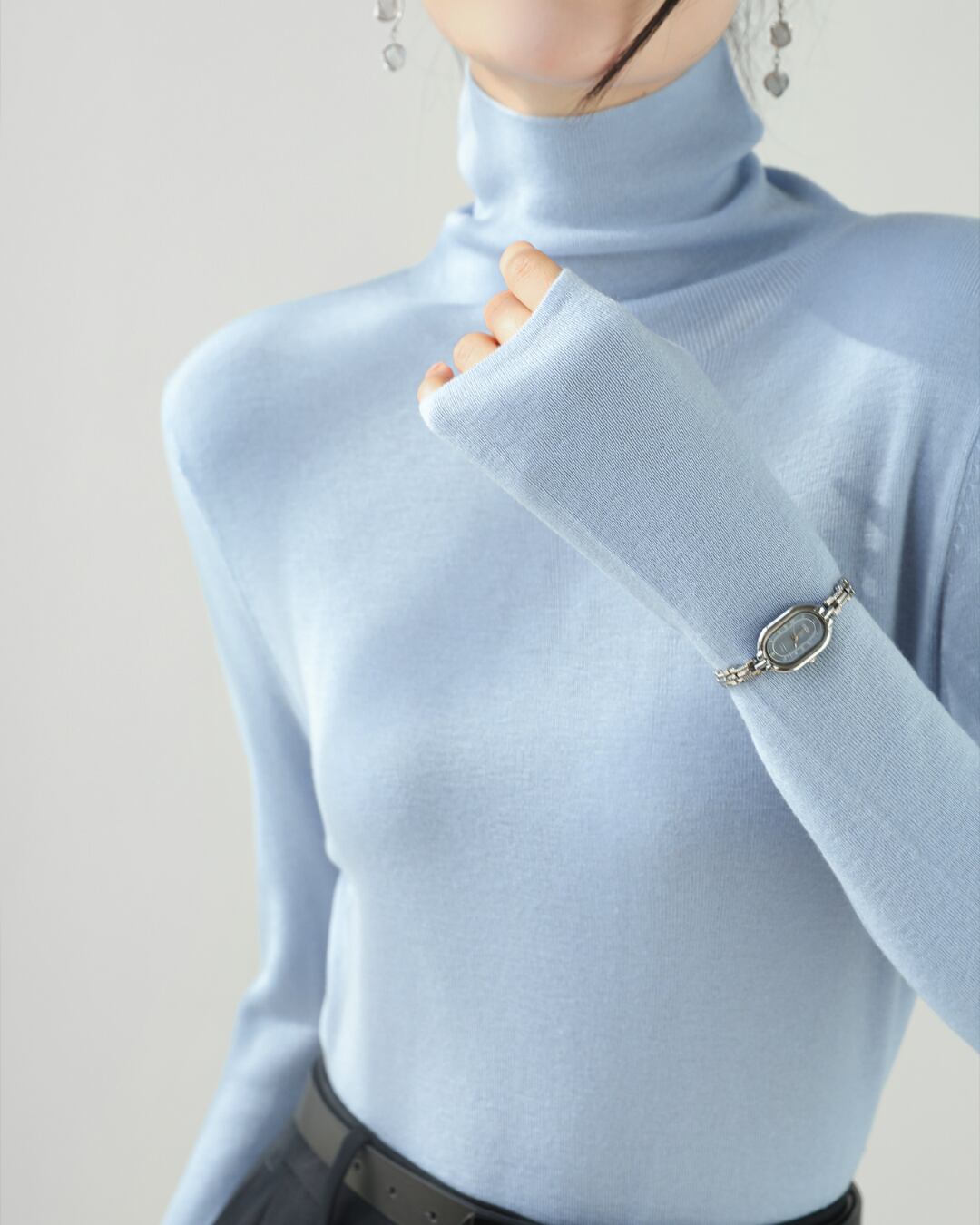 上品なタートルネックが首元を美しく演出するロングスリーブプルオーバー。