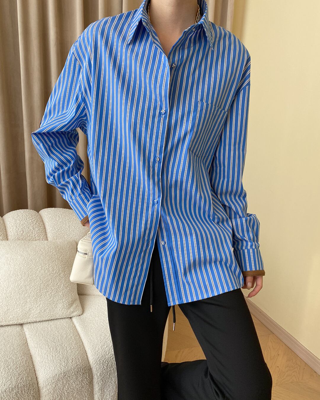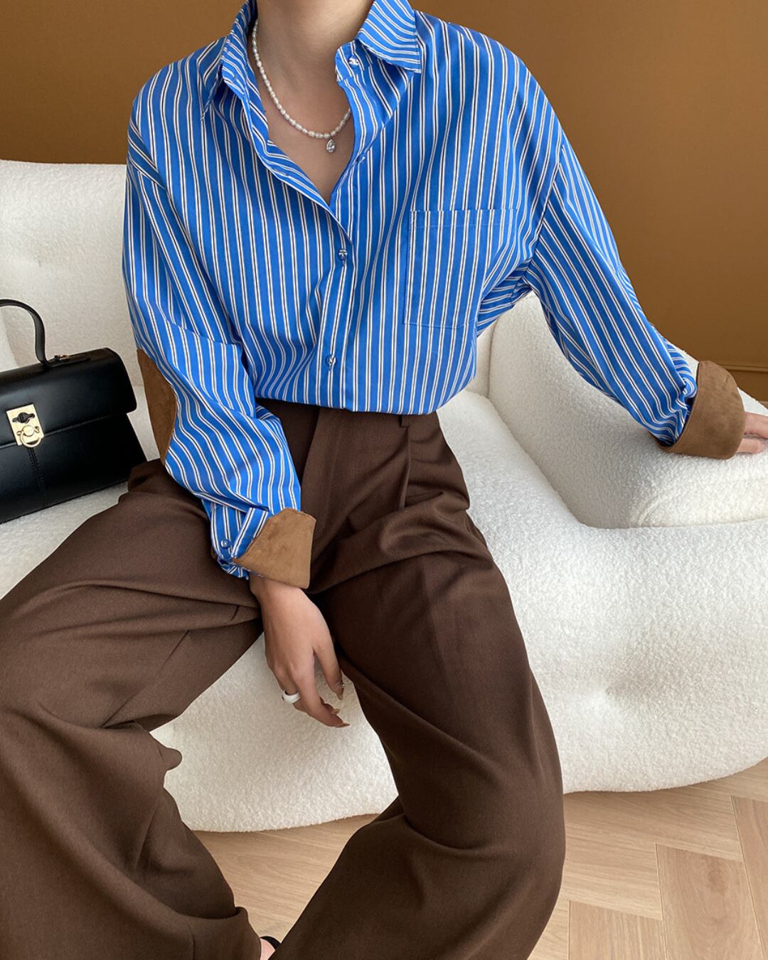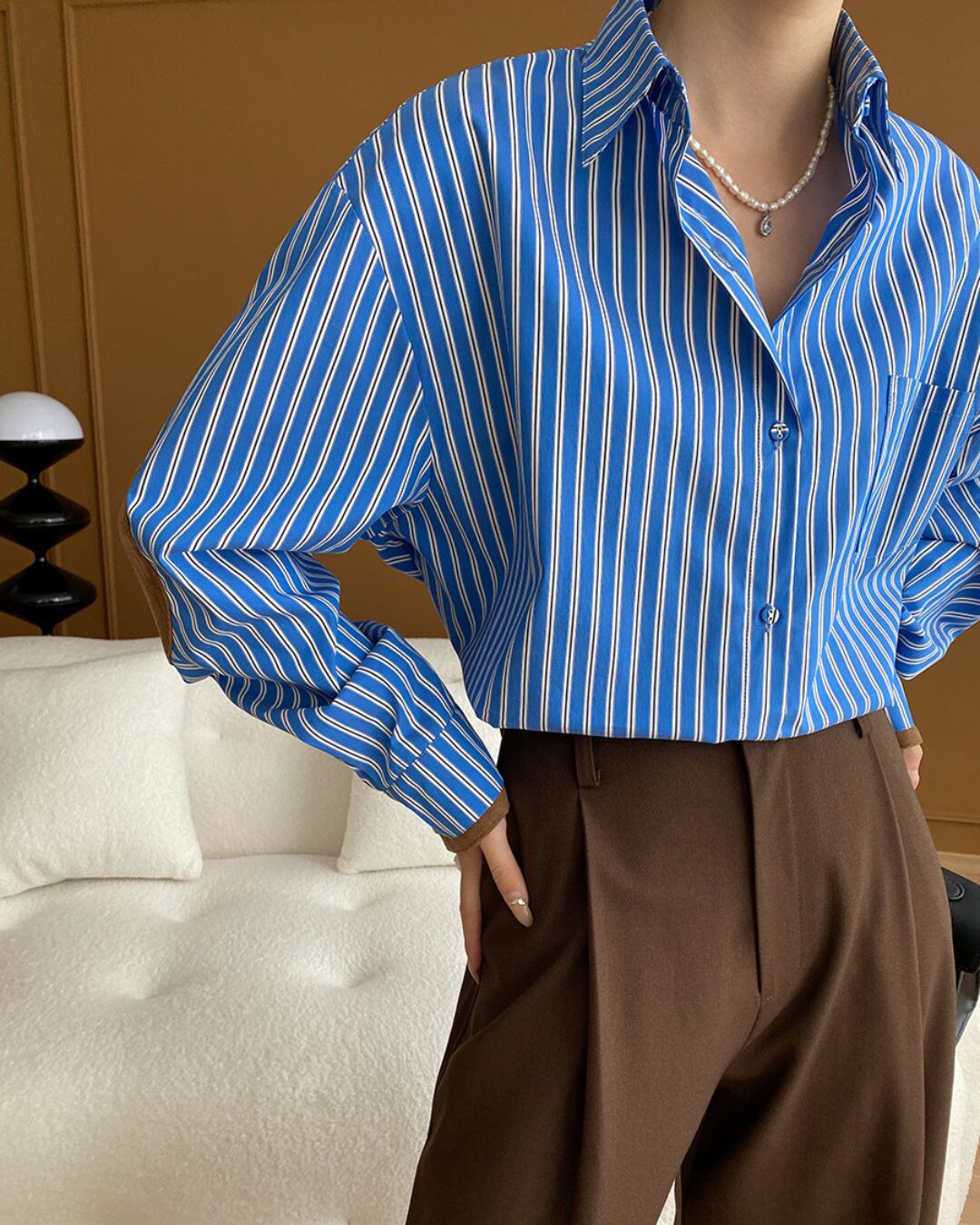 Stripe Pattern Shirt Elbow Patch Design Regular Color Shirt S00012